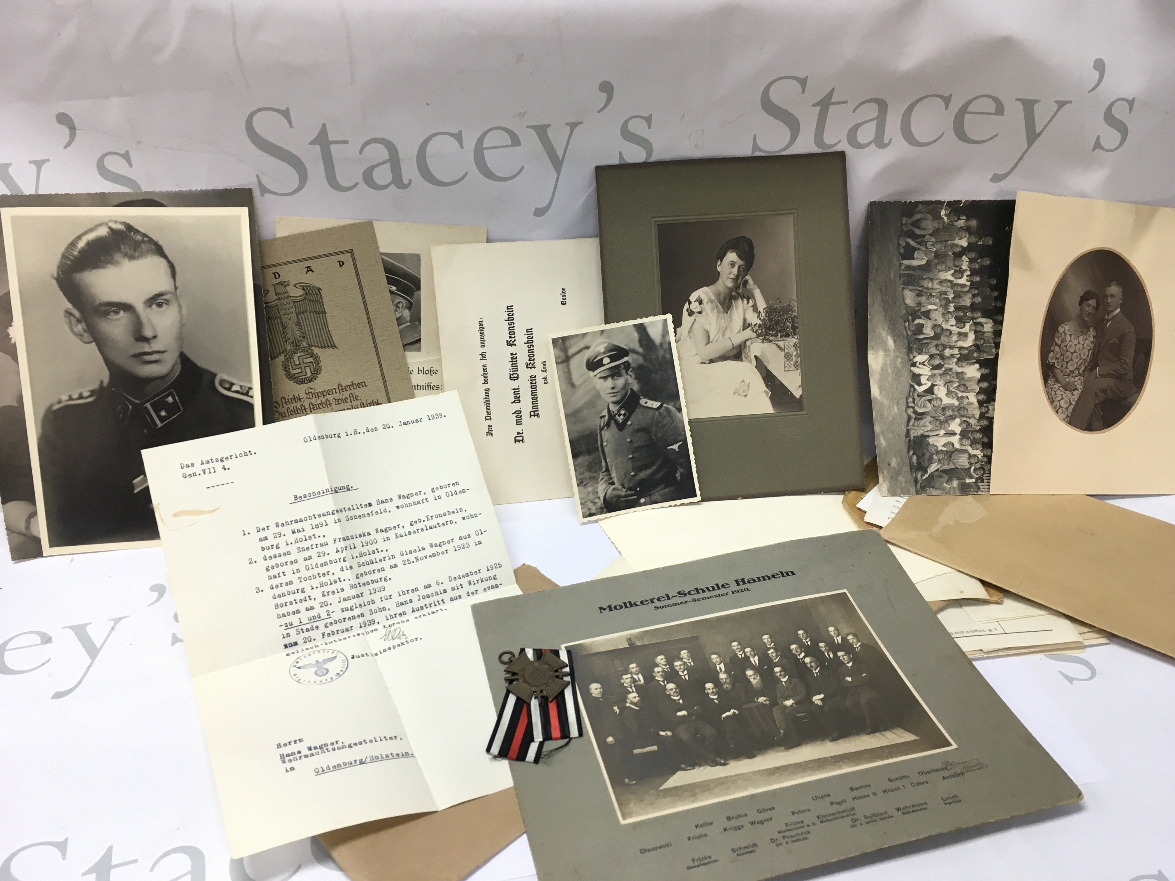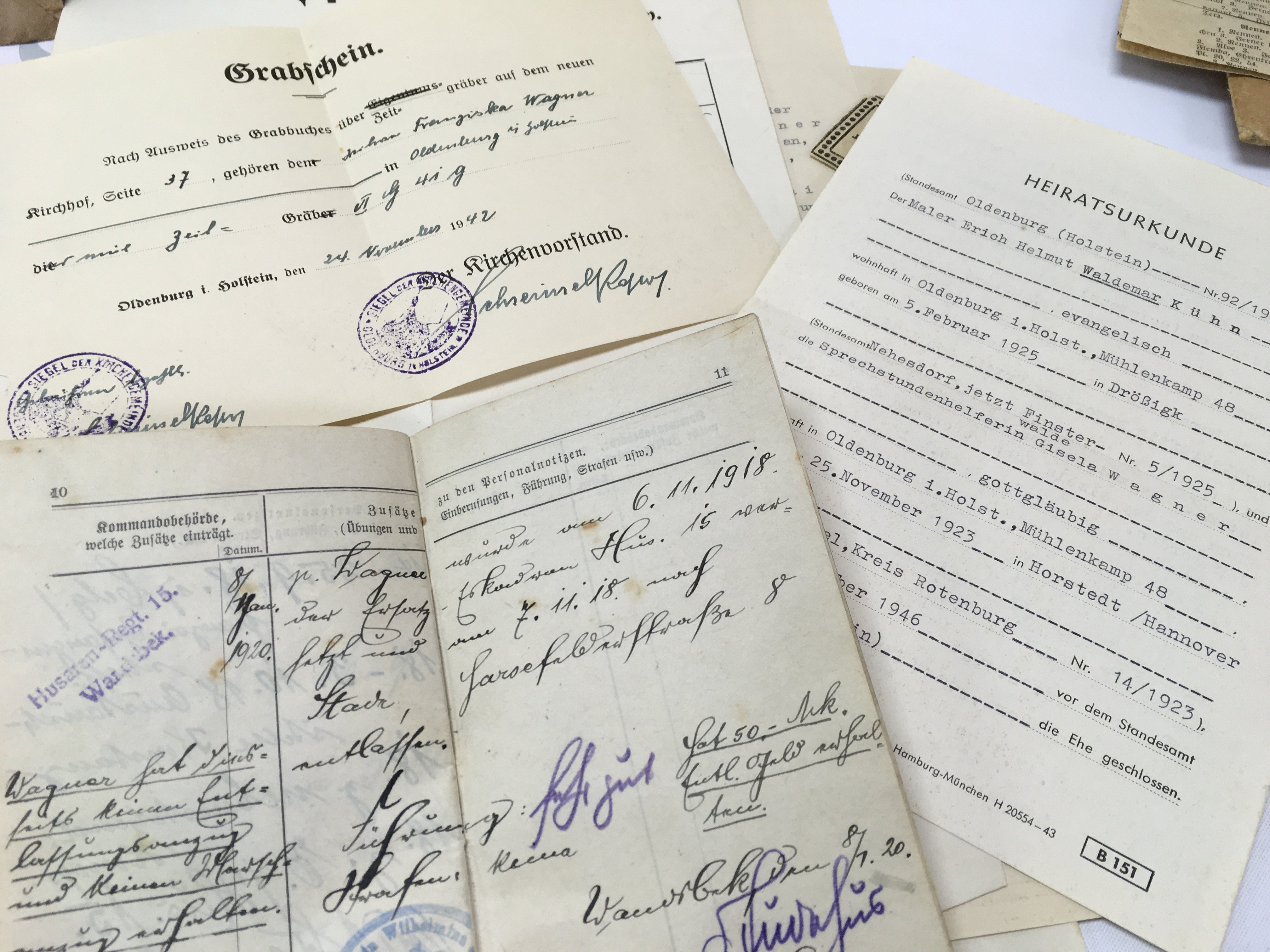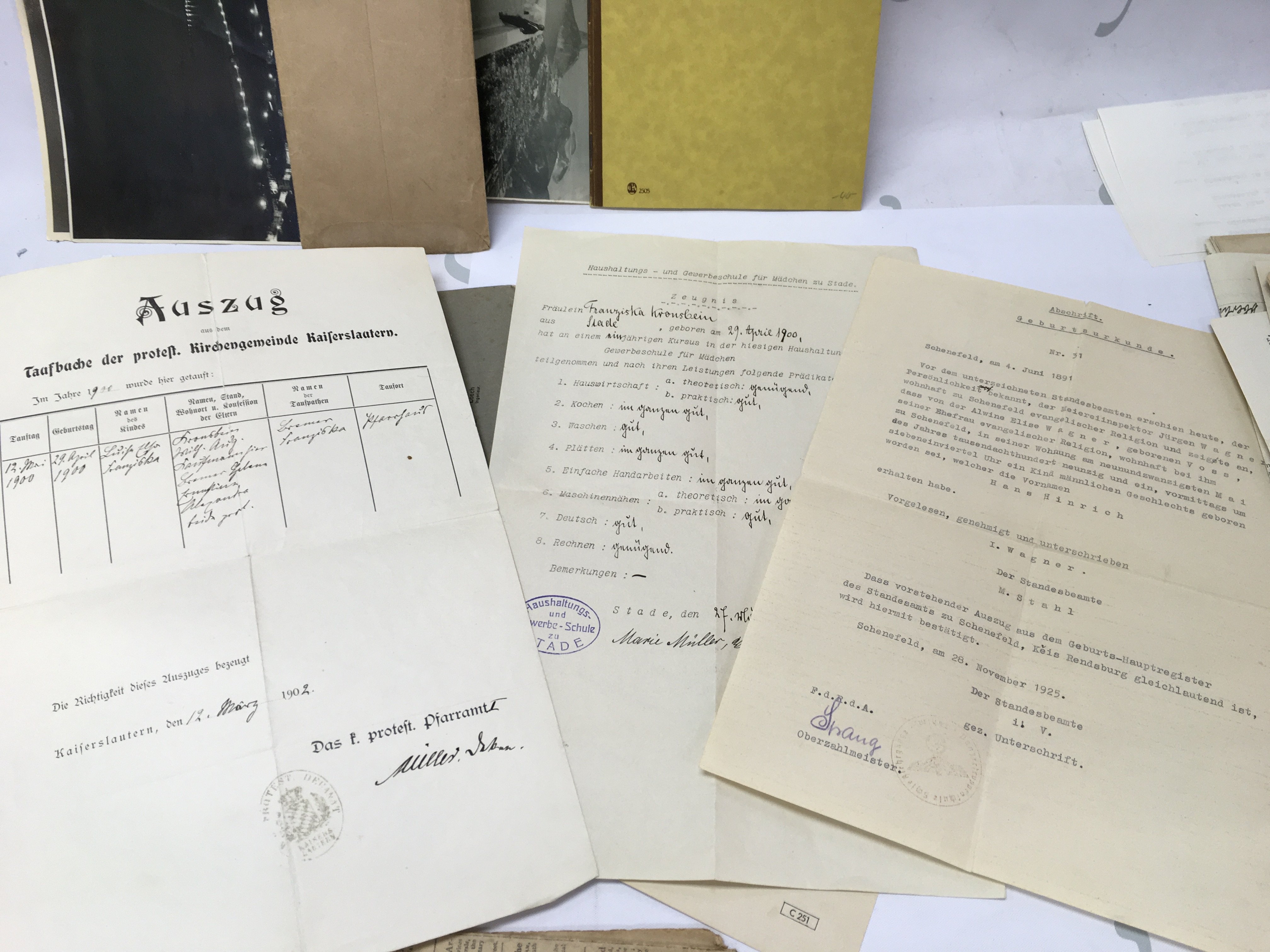 A collection of German Third Reich paperwork including Death certificates, Birth certificates, Military passport, photographs etc , postage category A