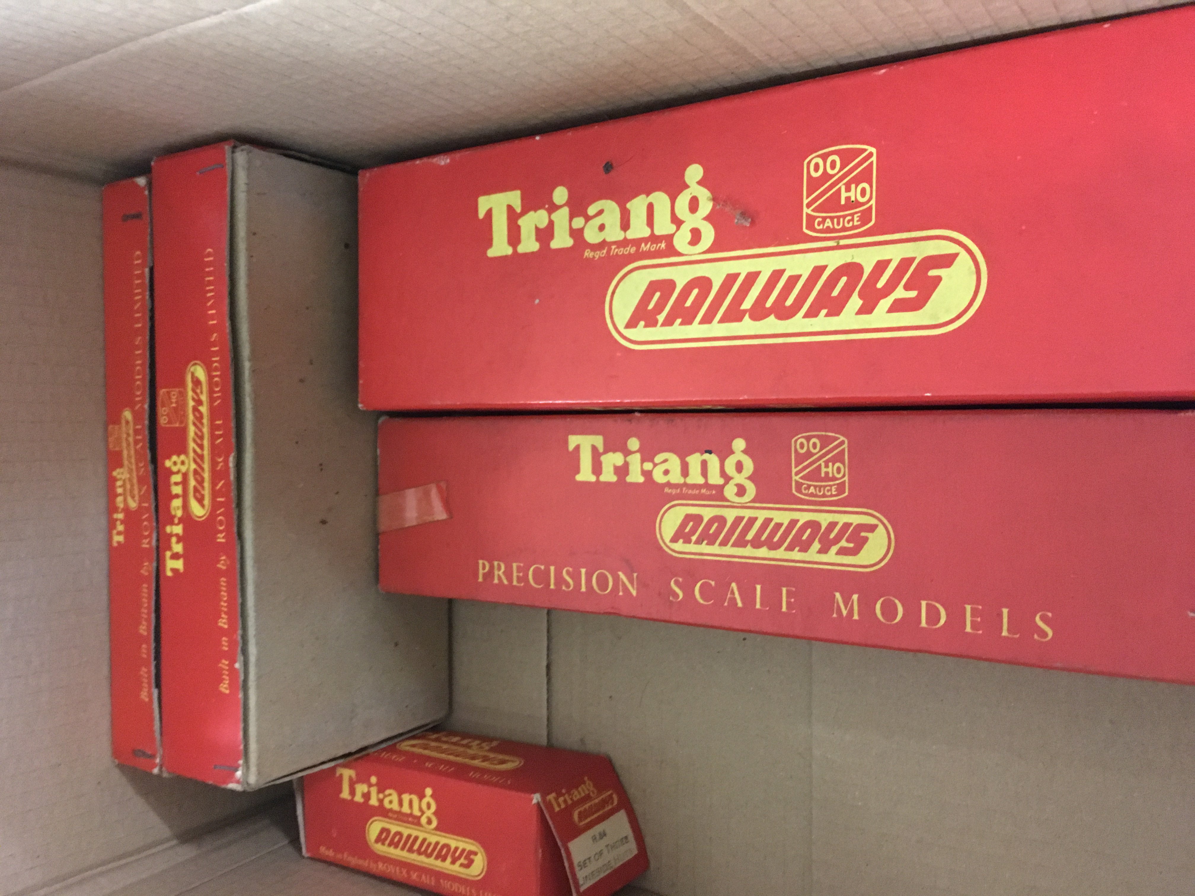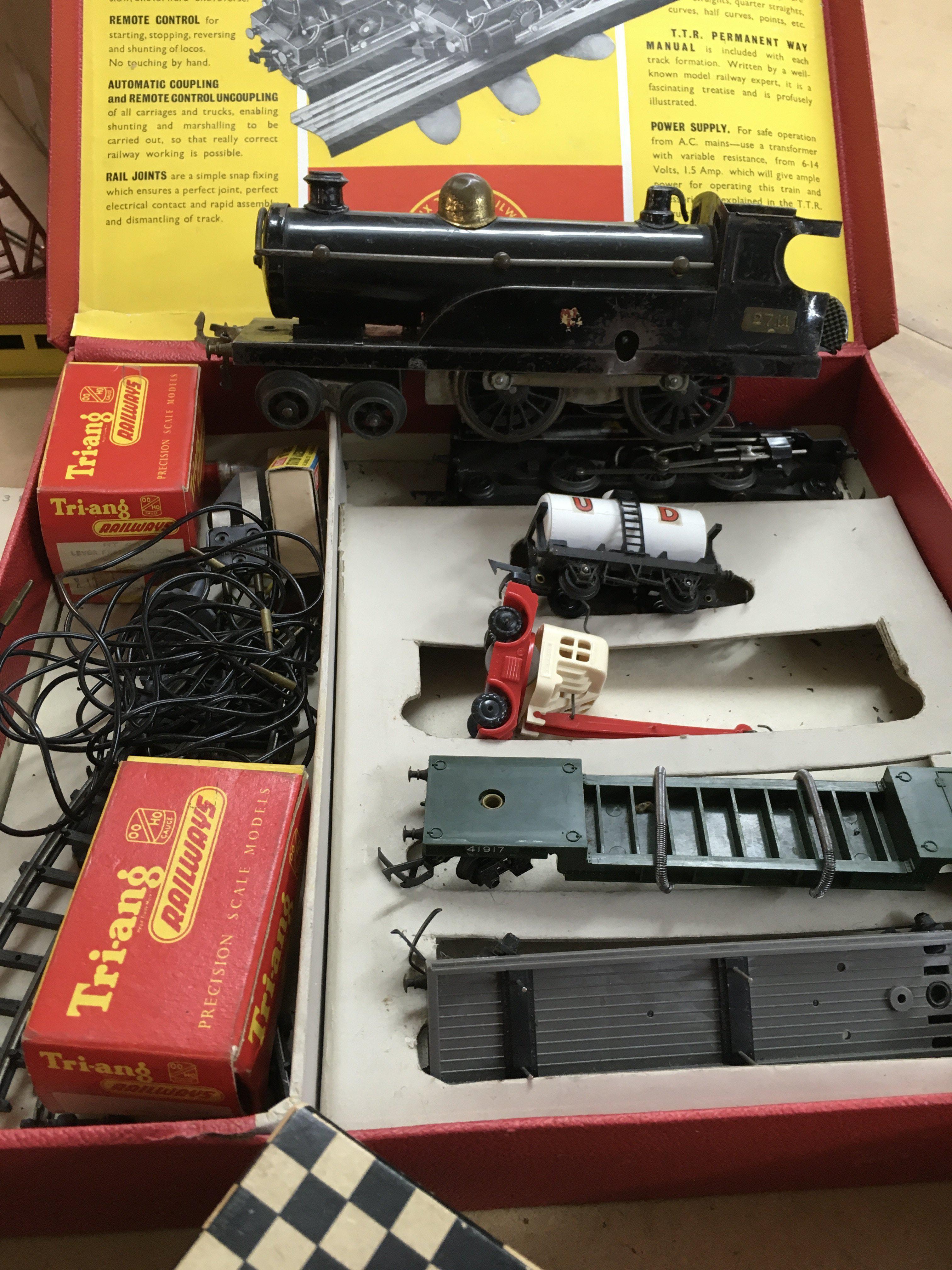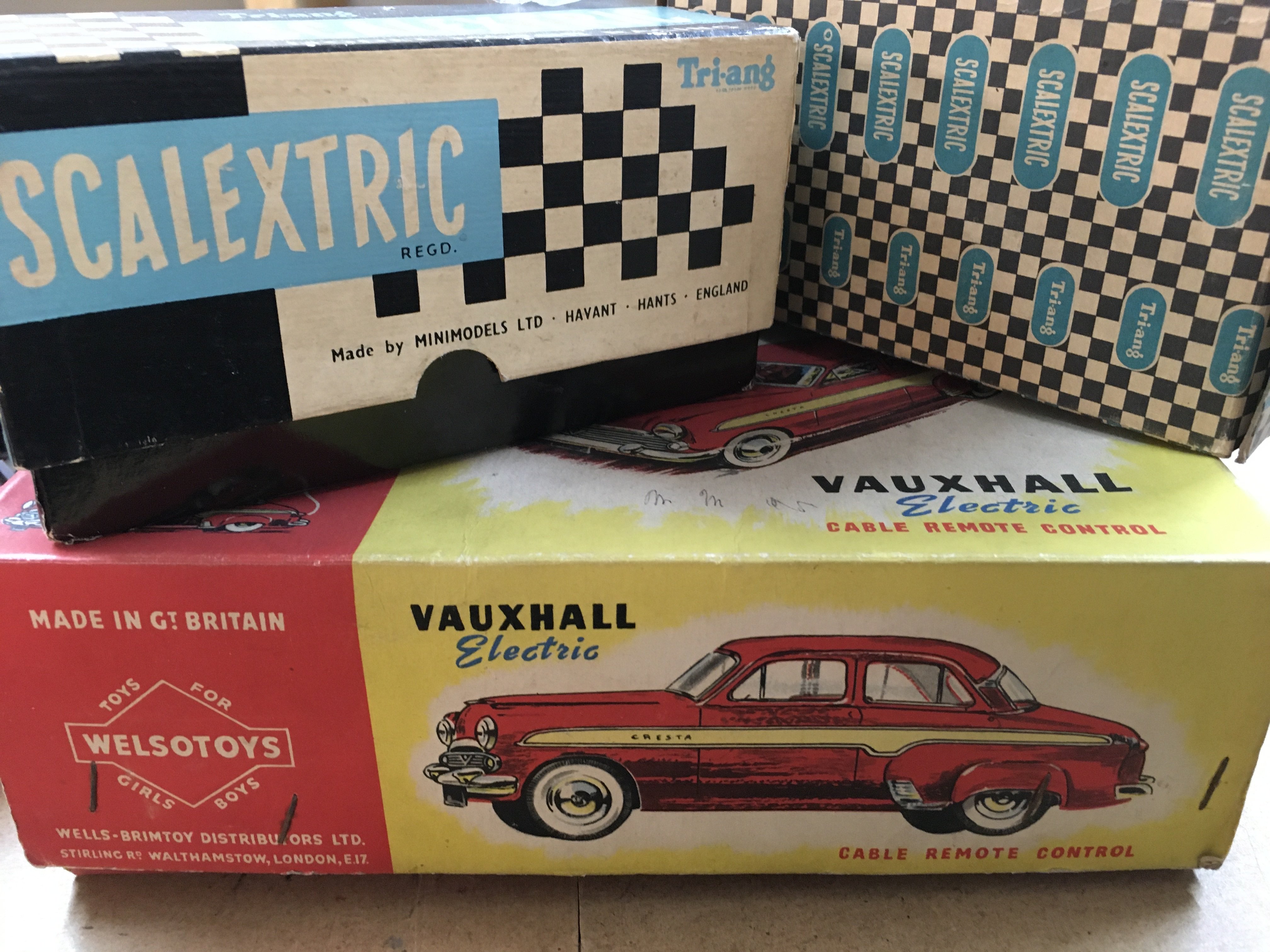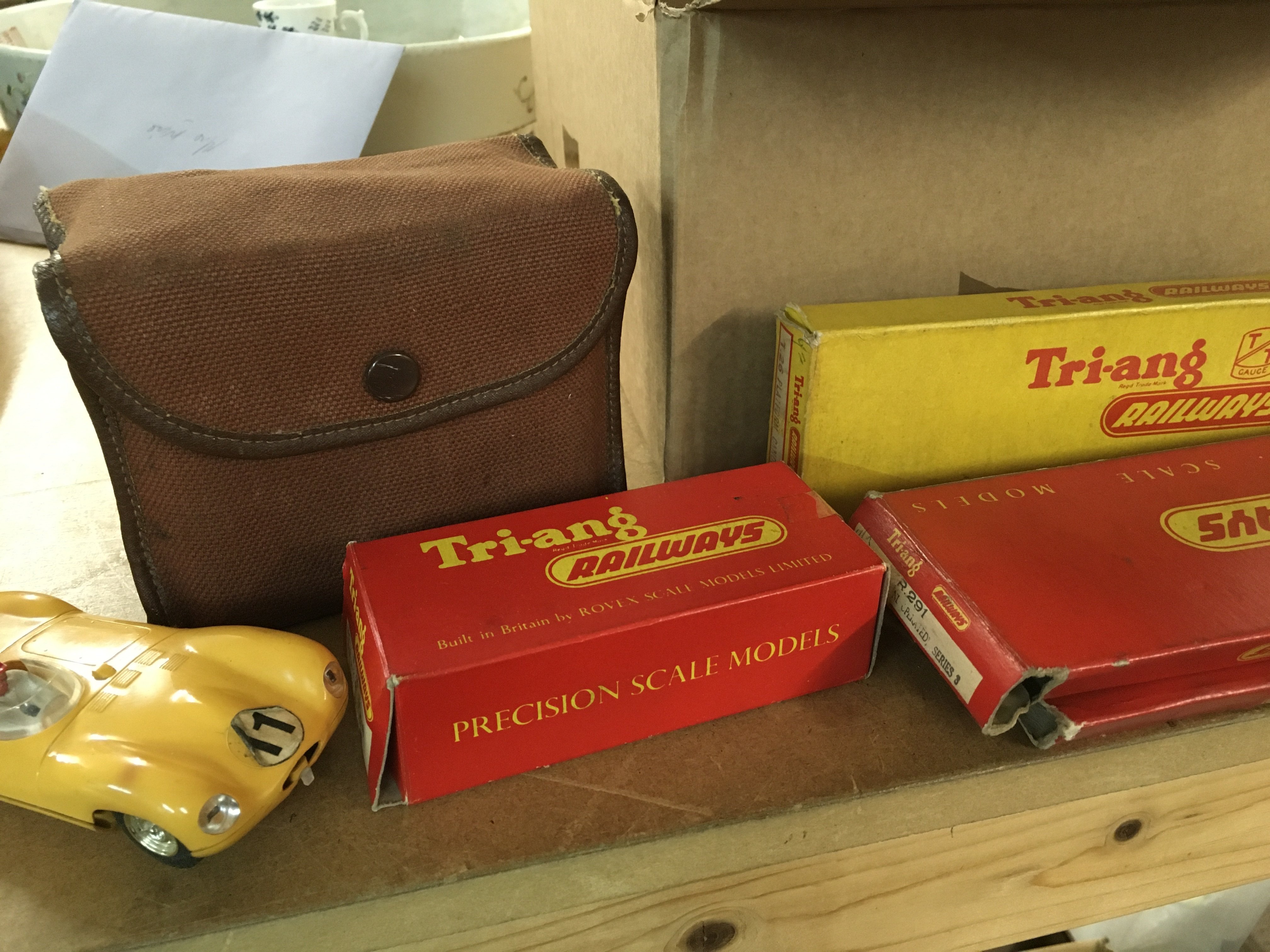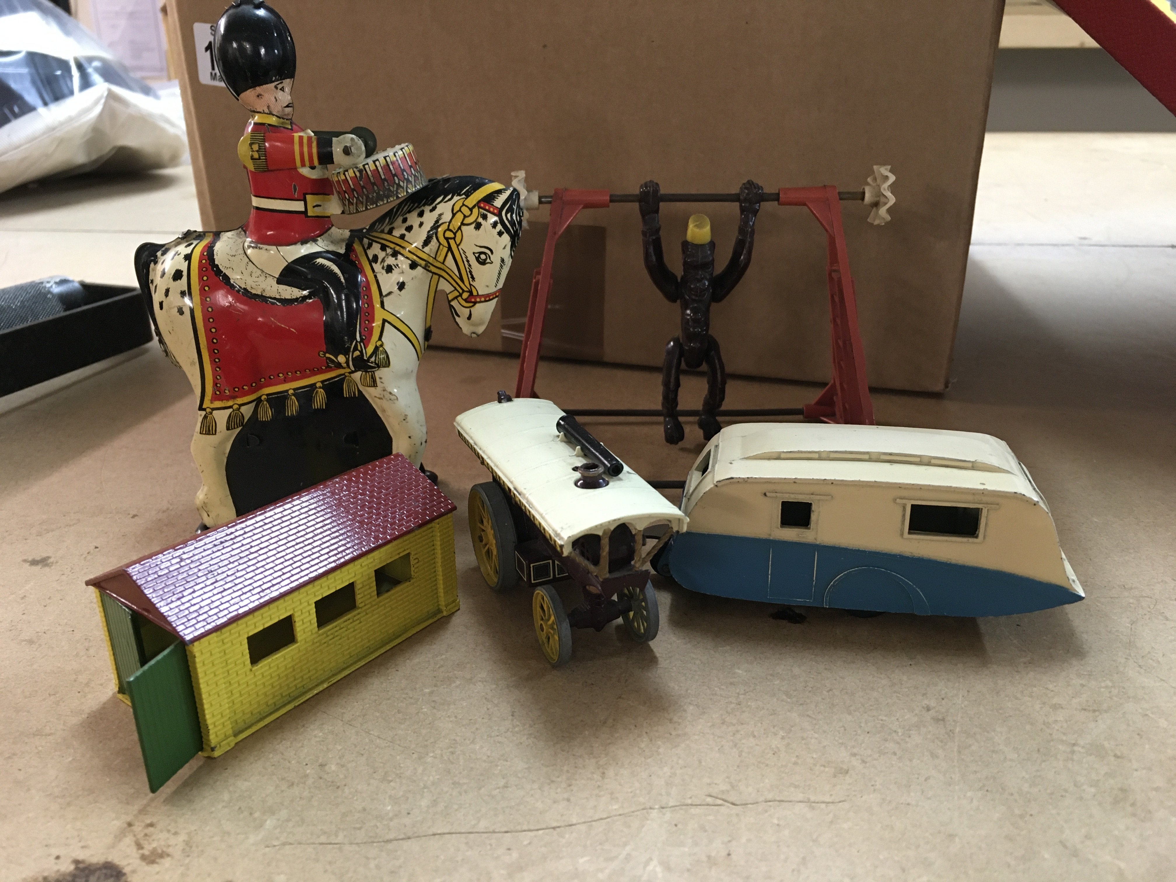 Two boxes containing toys including Scalextric Trix twin railway and tin plate solider on horse back .