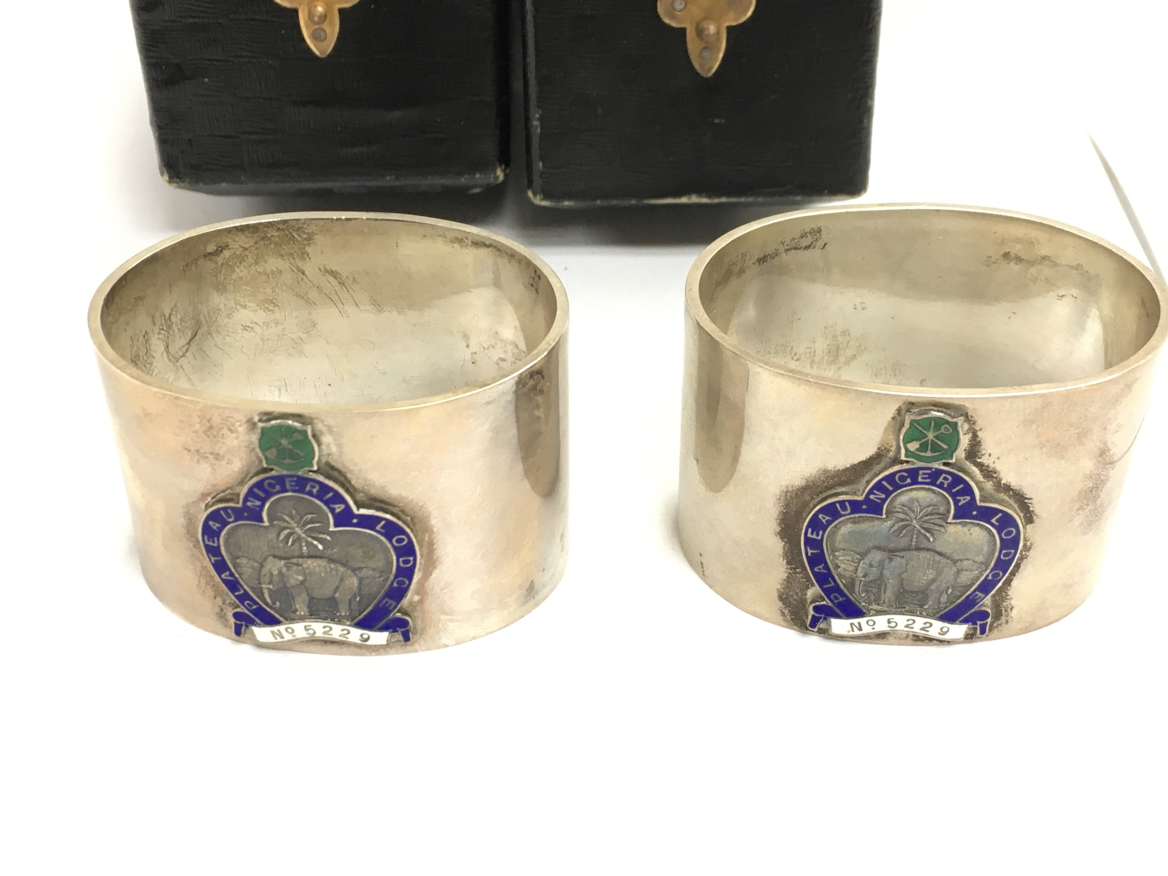 Two silver masonic and enamel Nigeria napkin rings with box. Circa 1931. 122.8g total. Postage B