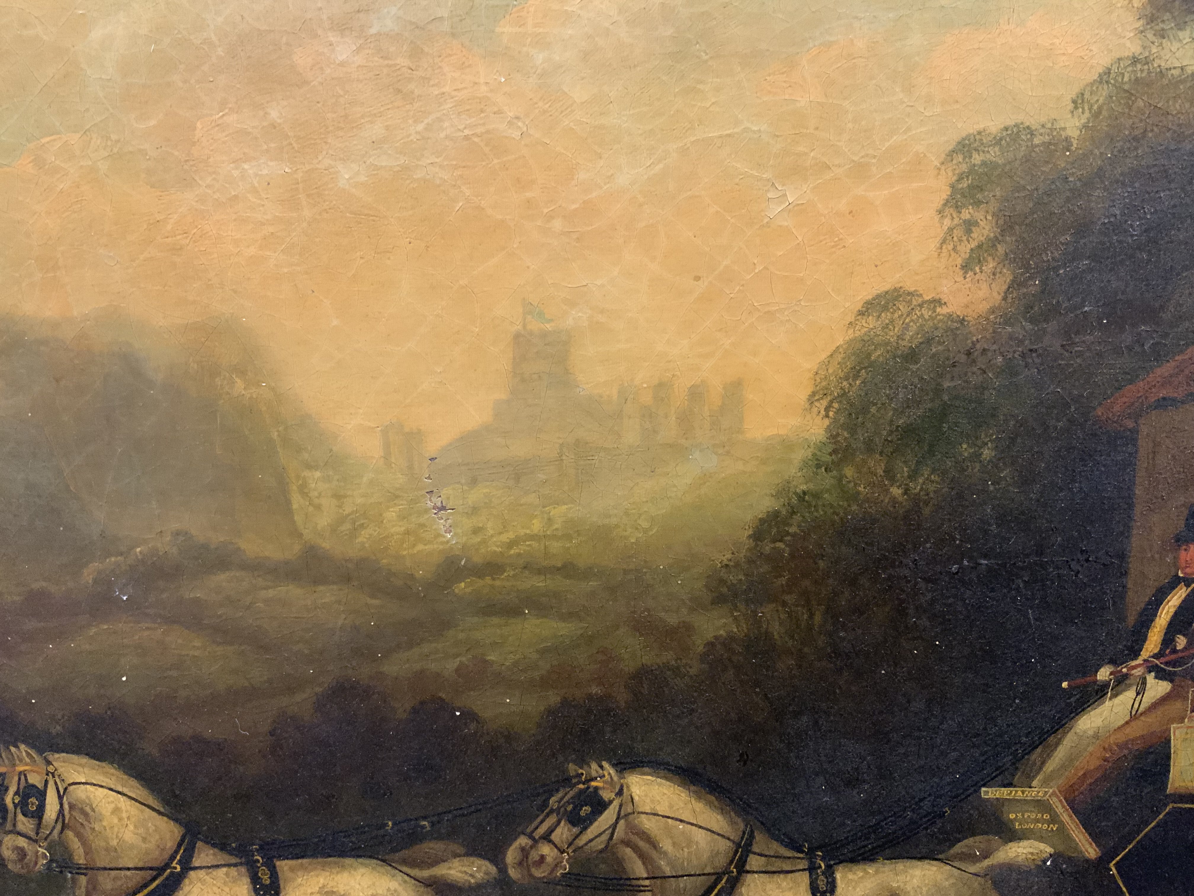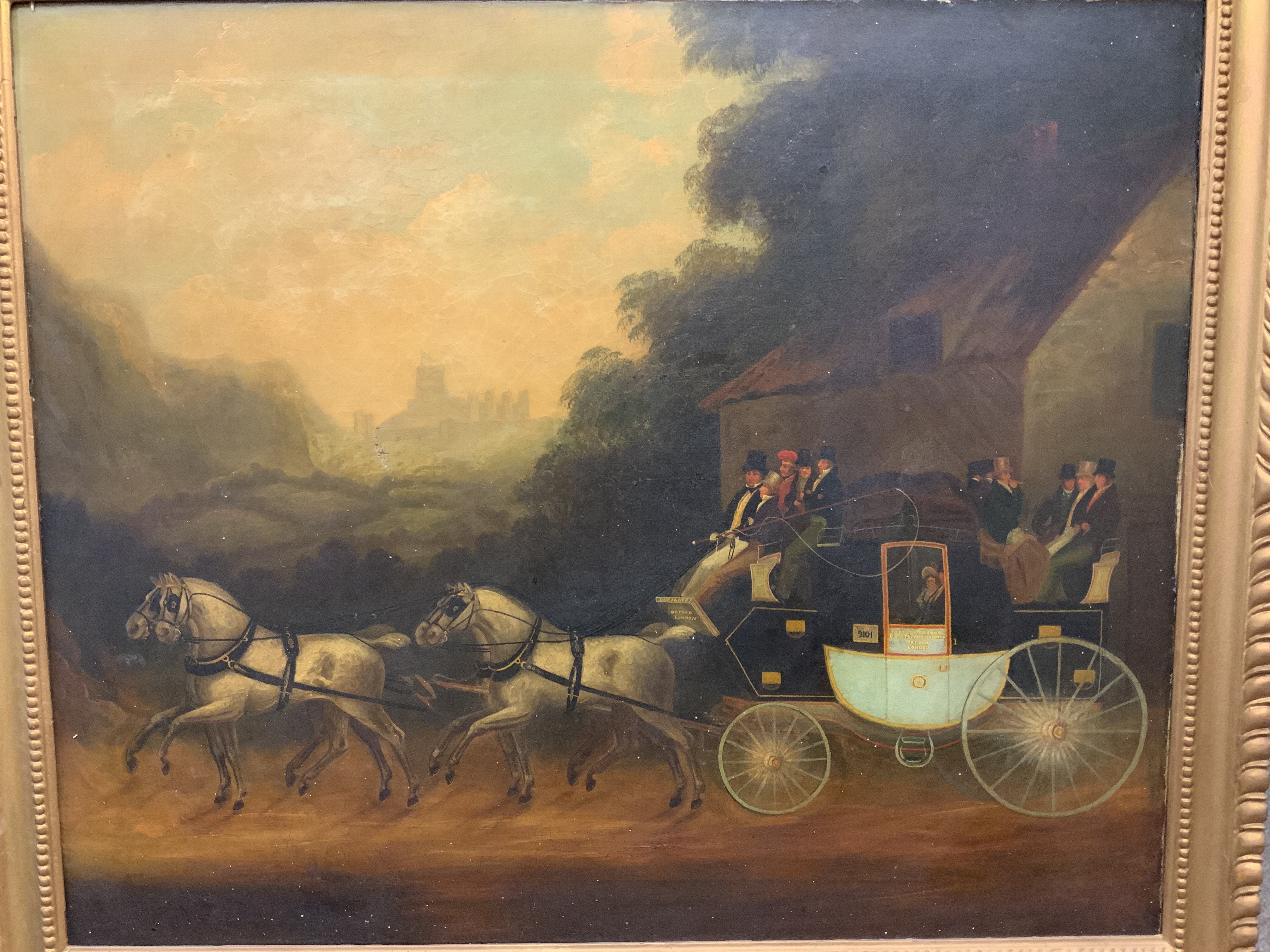 A Victorian oil on canvas painting depicting the Oxford to London Stage Coach, named carriage Robert Nelson & Christopher Waddell. 86cm x 74cm. Gilt frame.