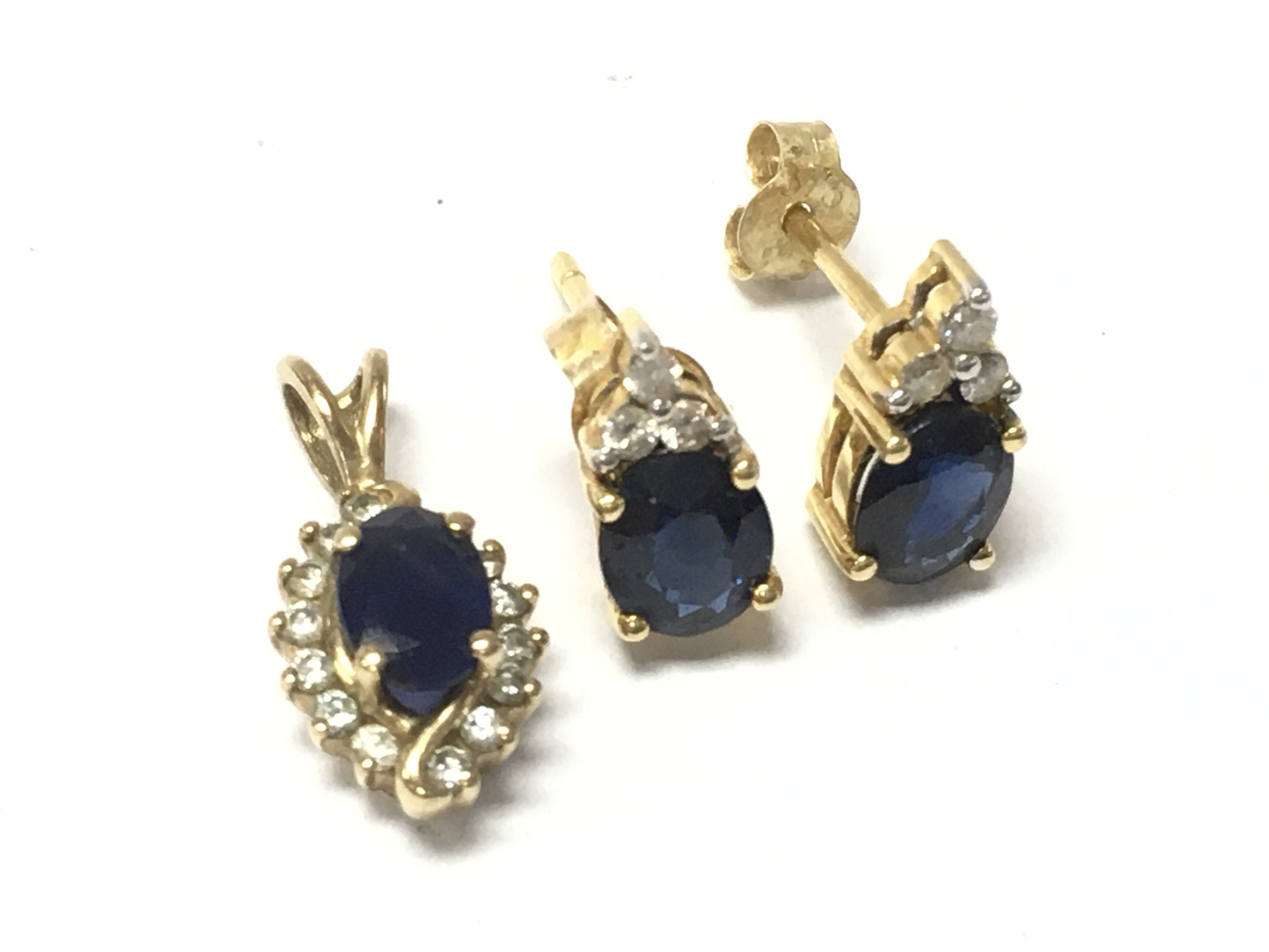 9ct gold sapphire and diamond pendant and earring set, 2.9g total weight. Postage category A