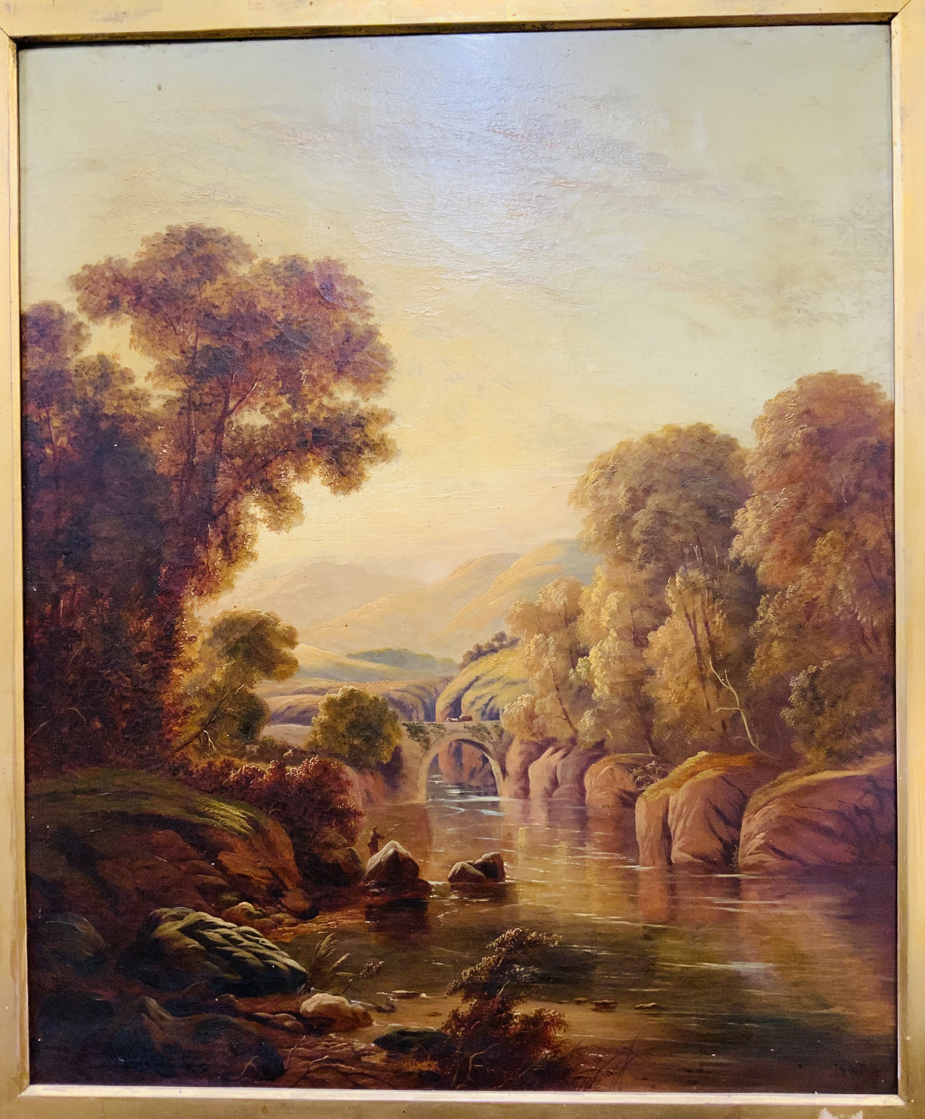 A large gilt framed oil on canvas landscape scene, indistinct artist signature. 99cm x 87cm.