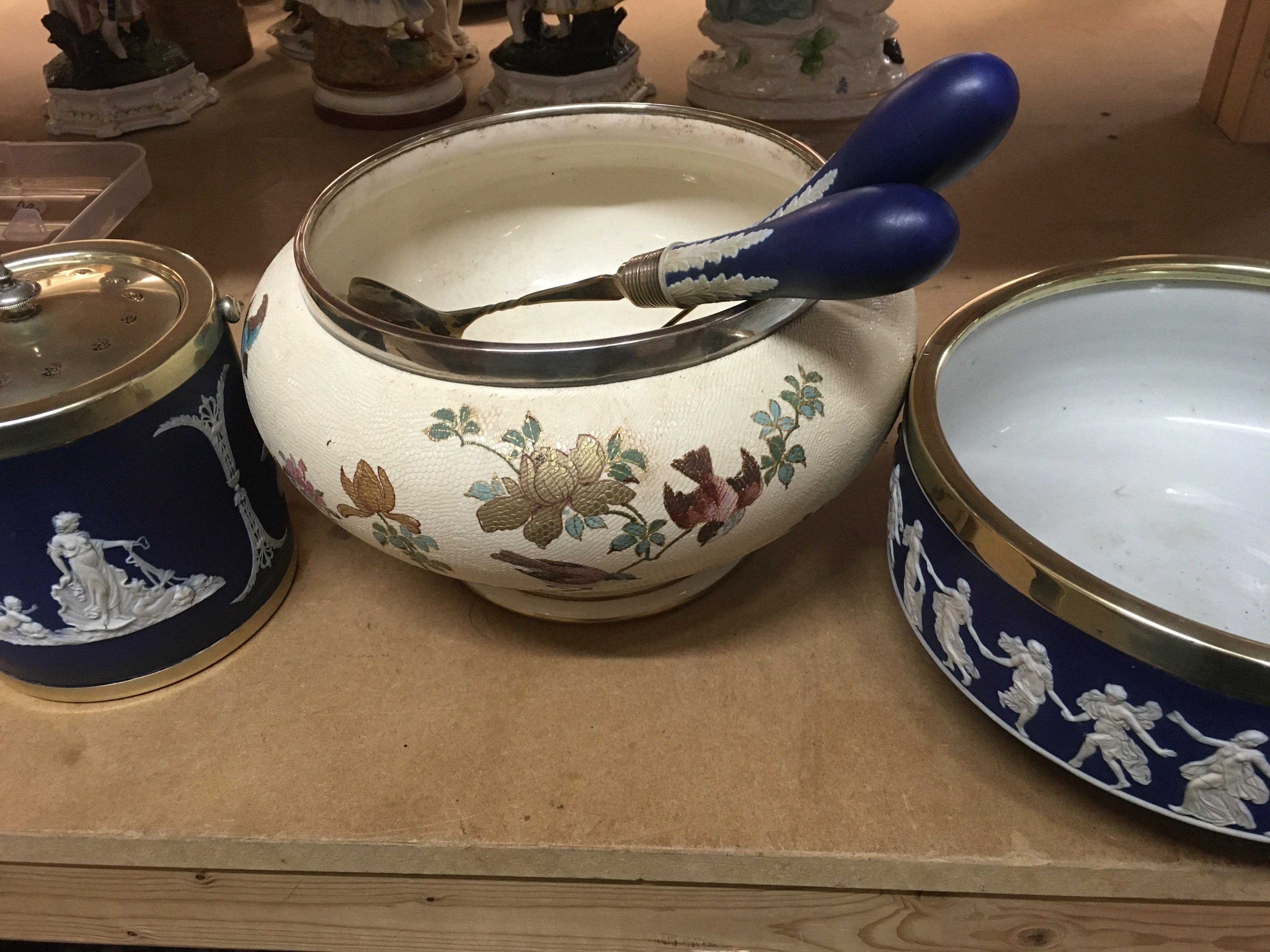 A Wedgwood salad bowl and biscuit barrel together with a Doulton bowl with silver rim .