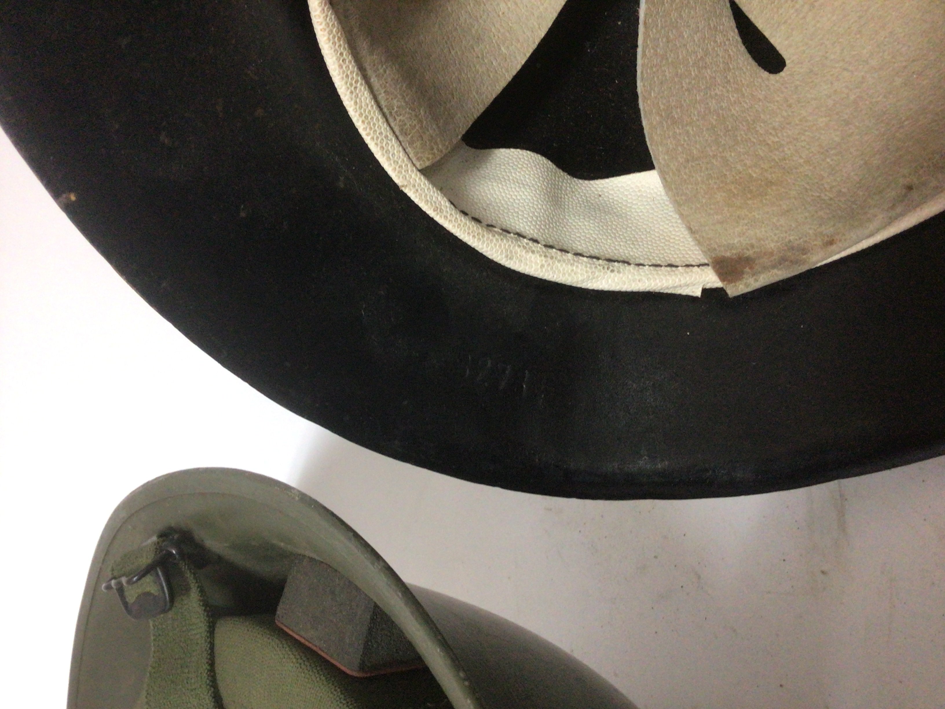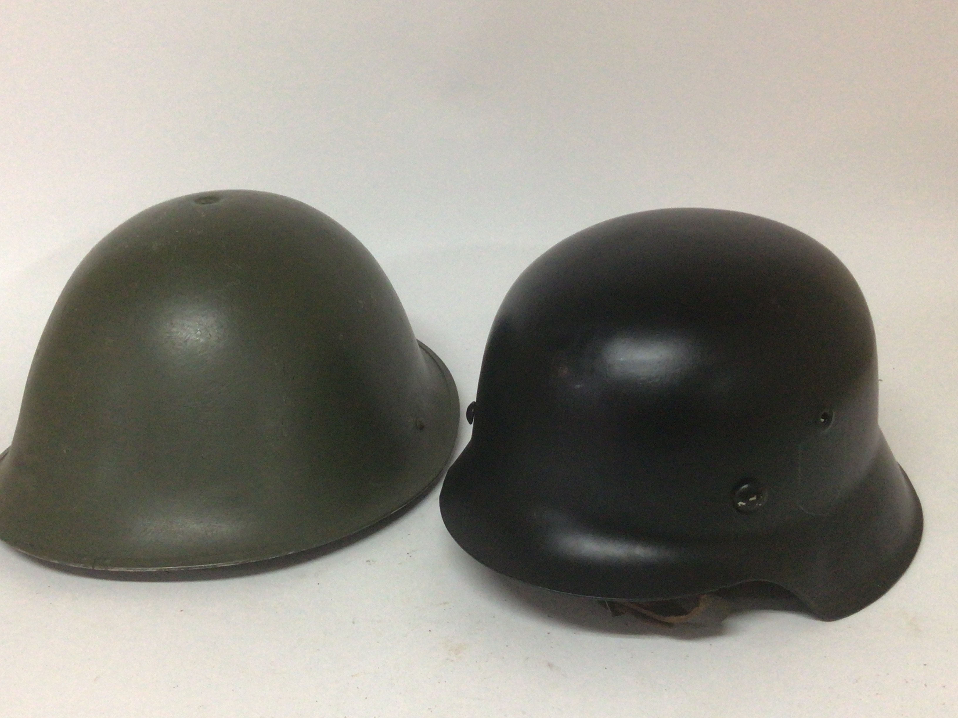 A British Military Hat 1977 M.W.S and a German Third Reich type black painted helmet with a white liner and stamped 3273 (2)
