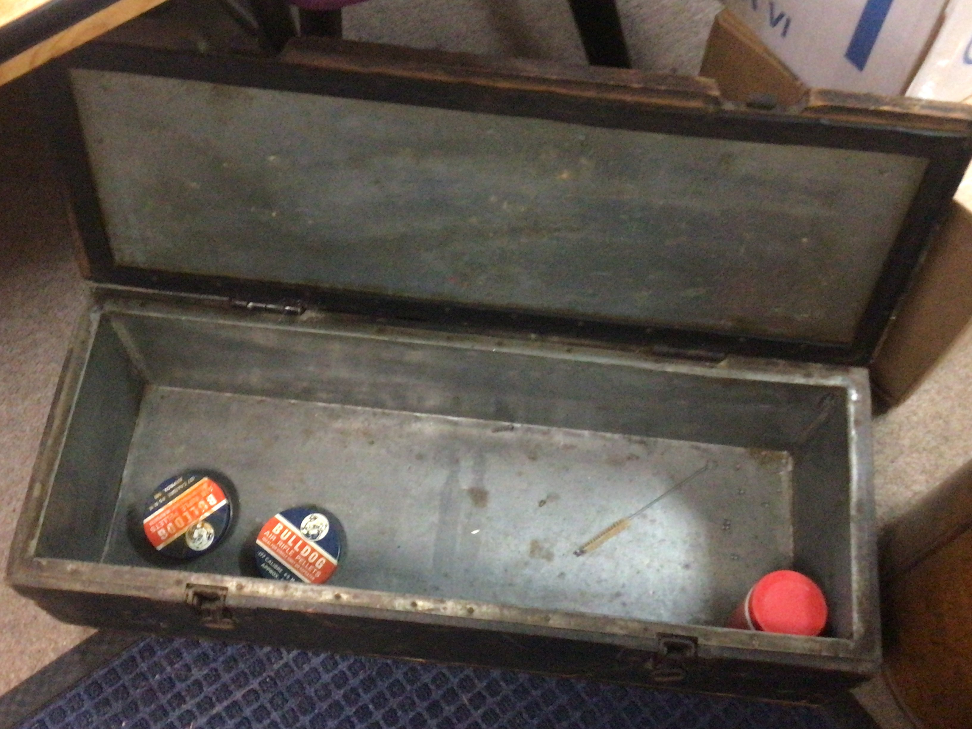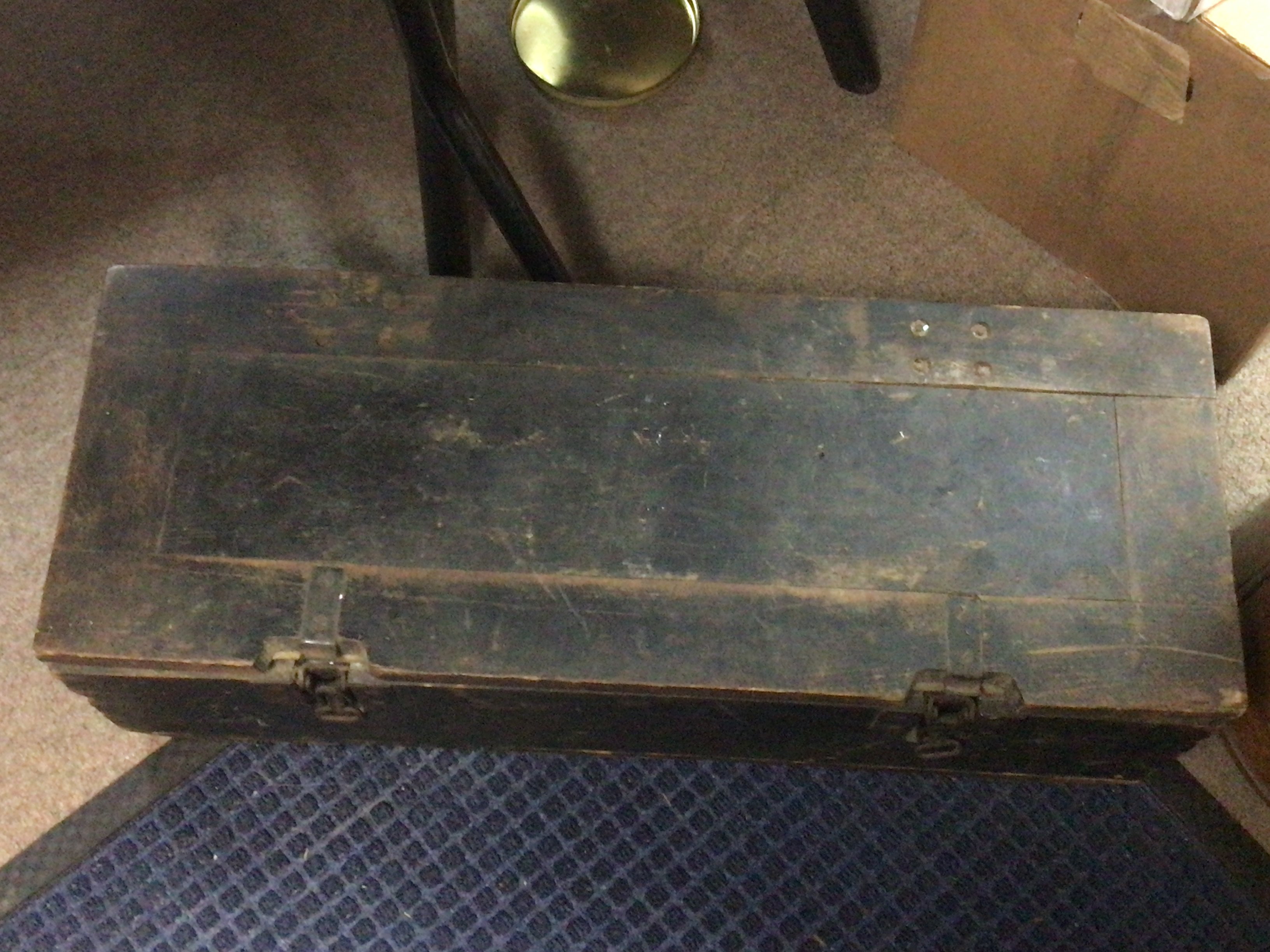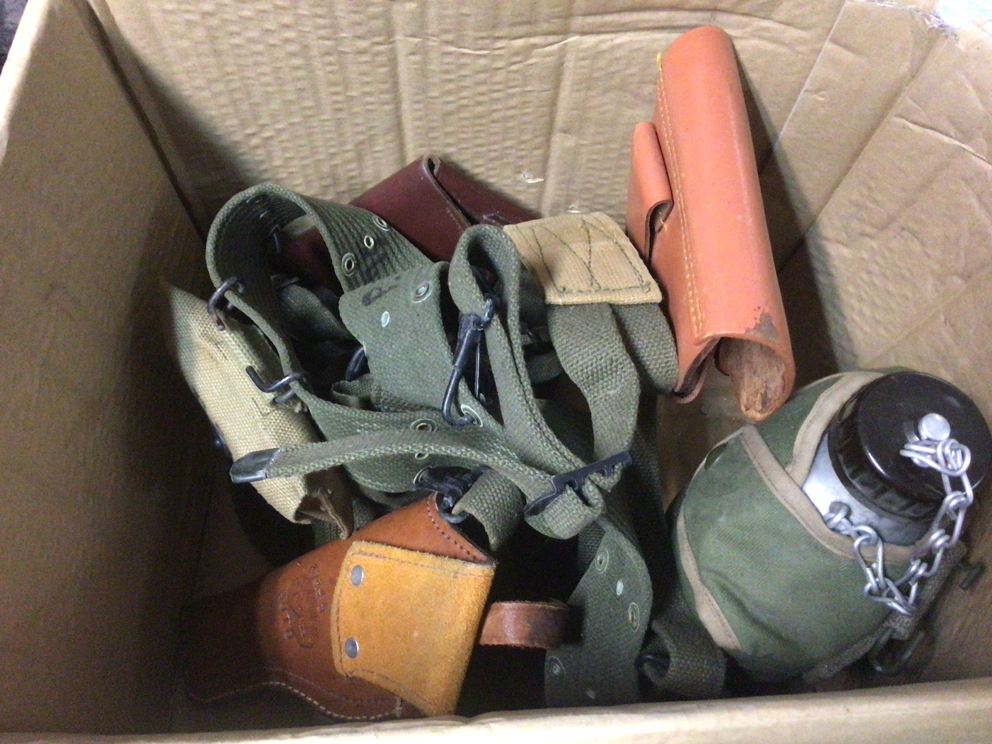 A box containing military webbing a military wooden box with liner and non military leather pistol holsters and other oddments.
