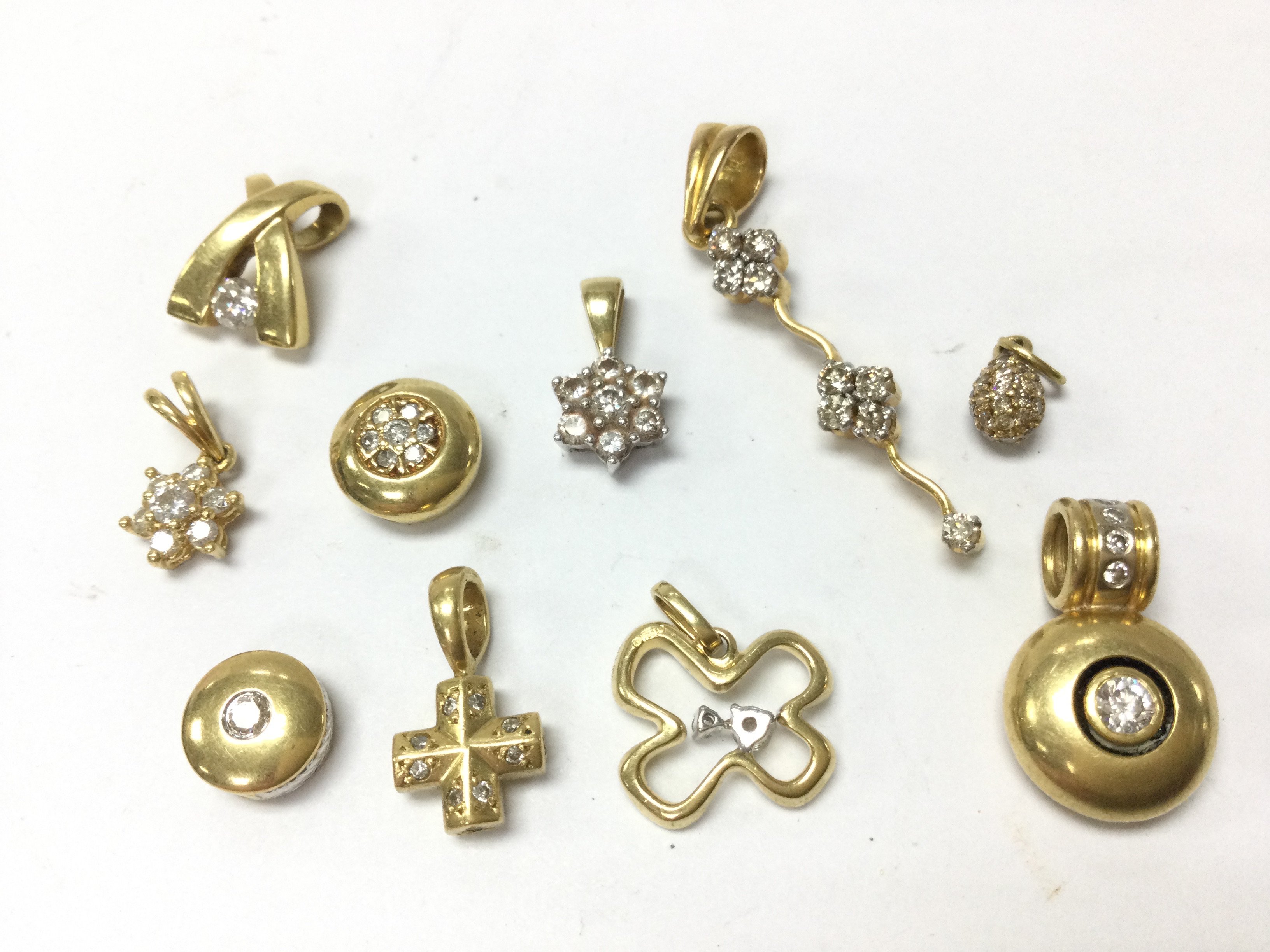 A collection of 18ct gold diamond inset pendants , 15.1g total weight . Postage category A