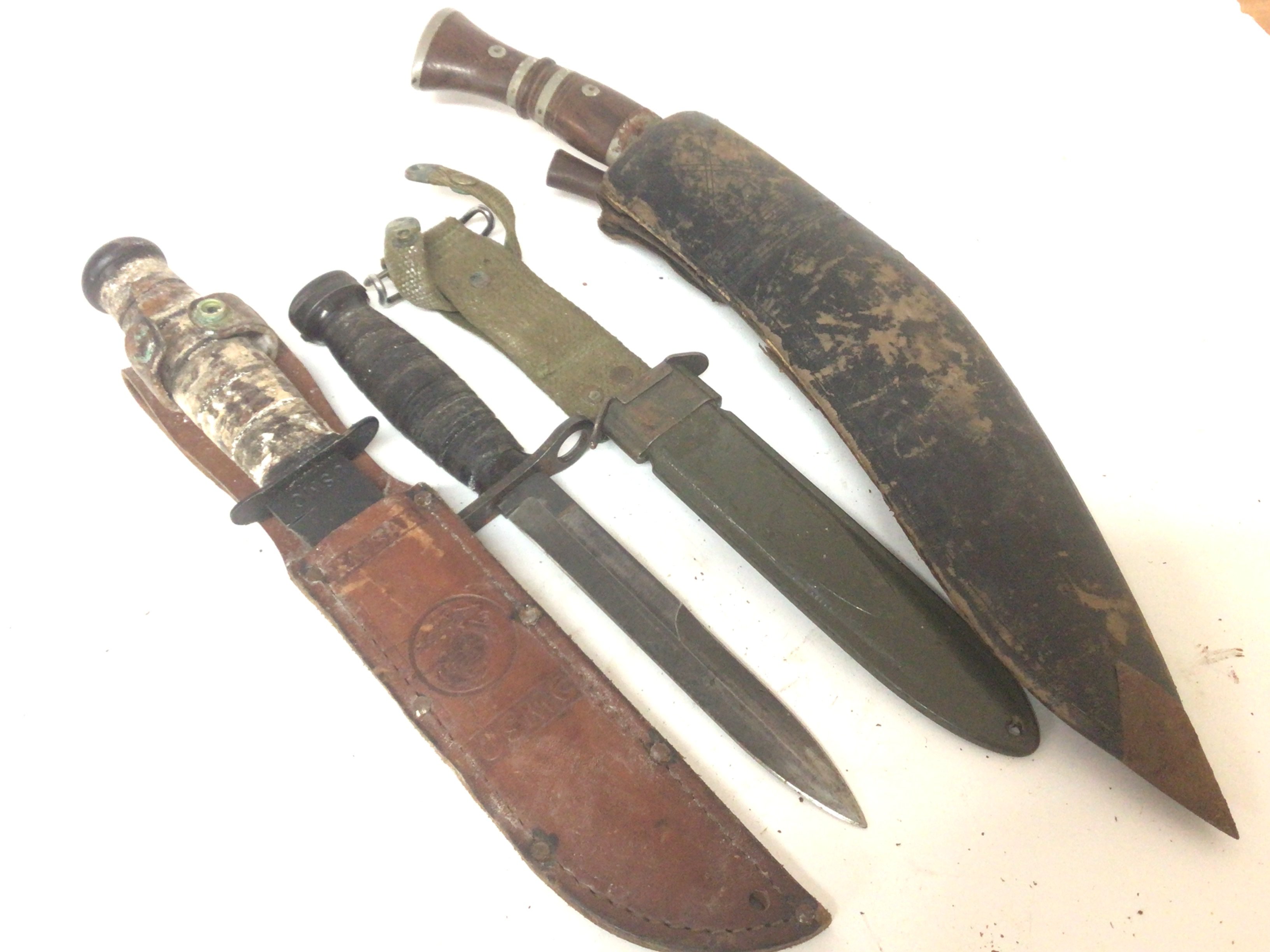 An American Military bayonet a Kukri knife and a USMC hunting knife.