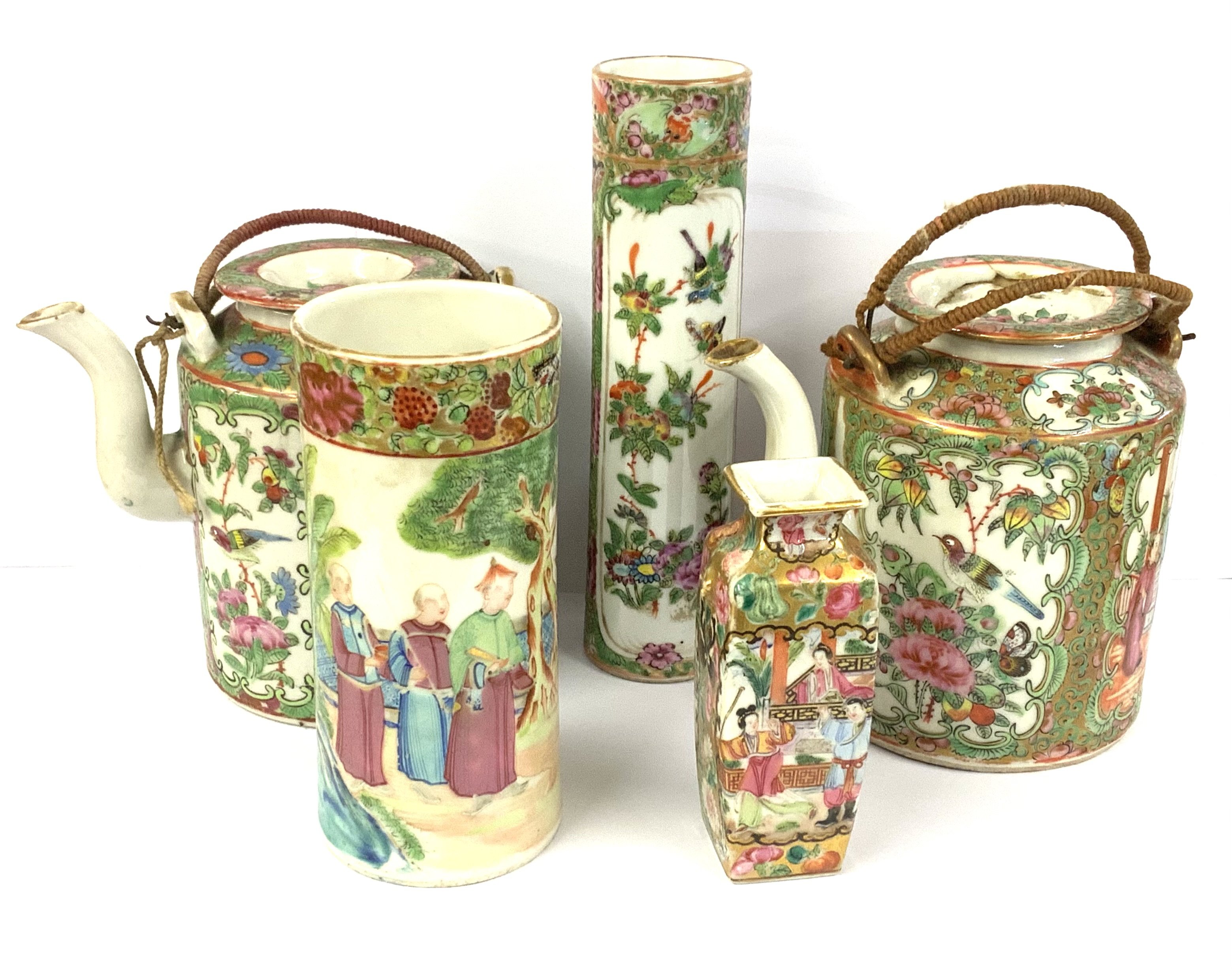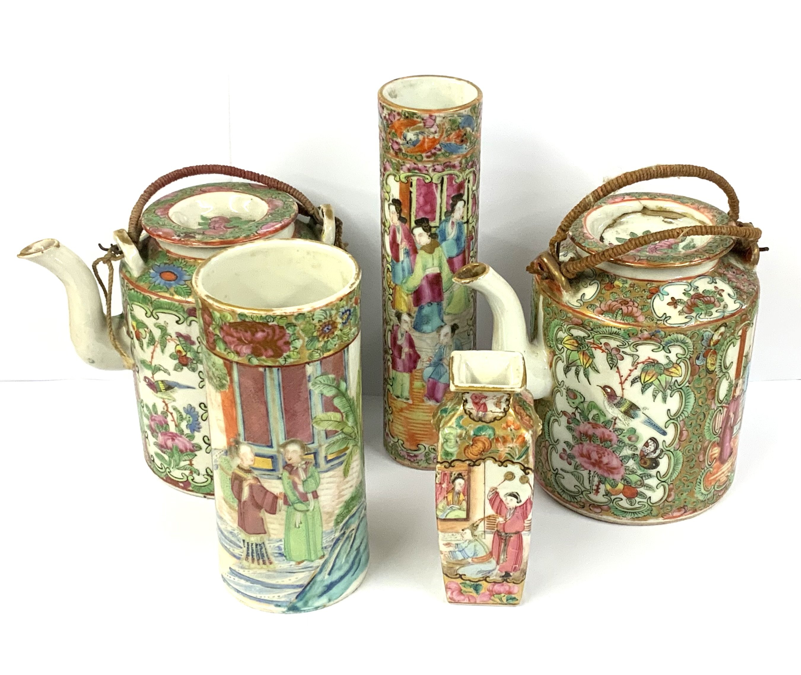 A small collection of Chinese Cantonese porcelain. (5), (some damage to the lid of one teapot/small chip to top rim of miniature vase).