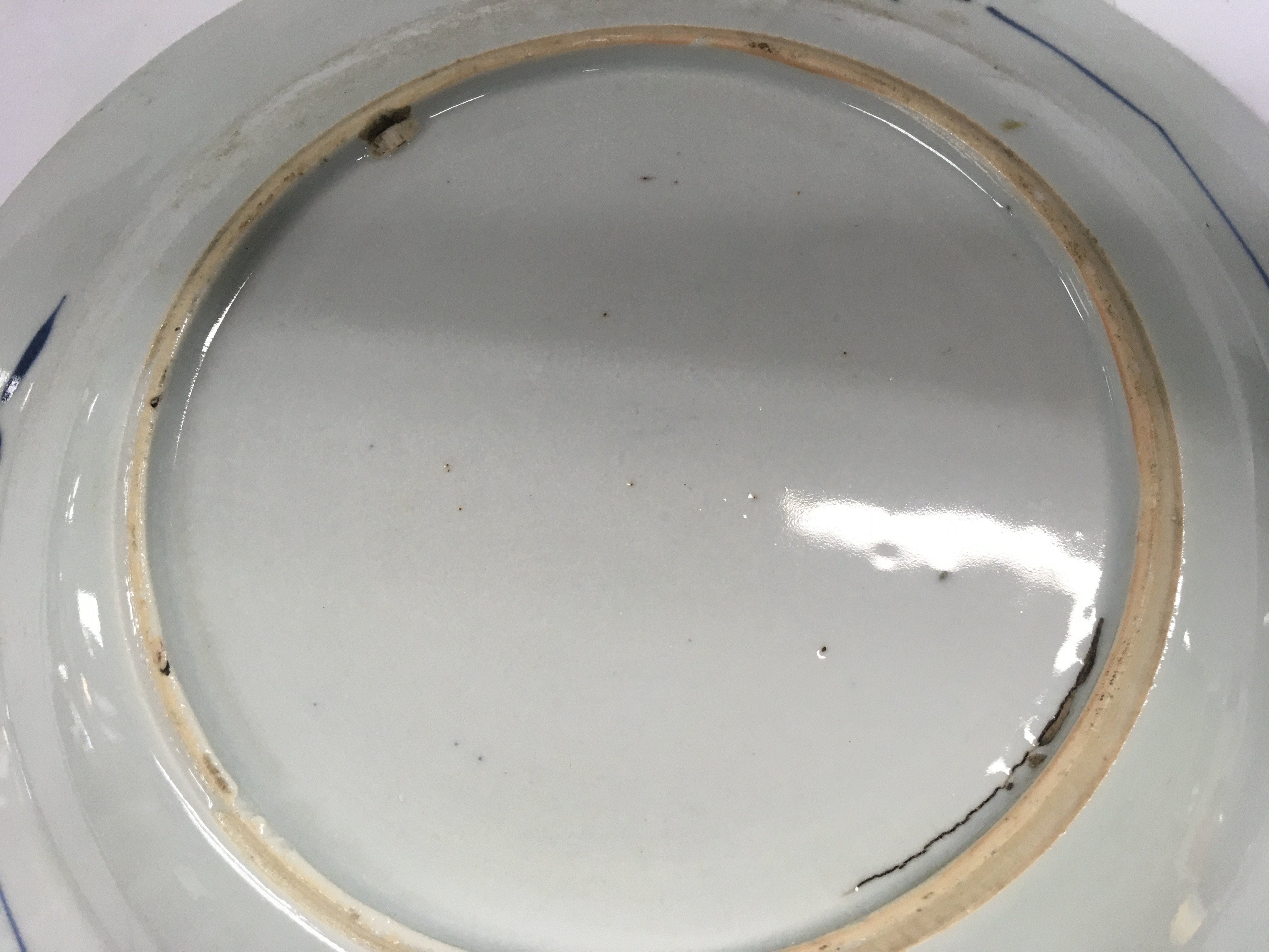 Three Early 19 th Chinese blue and white plates decorated with birds flowers and foliage.