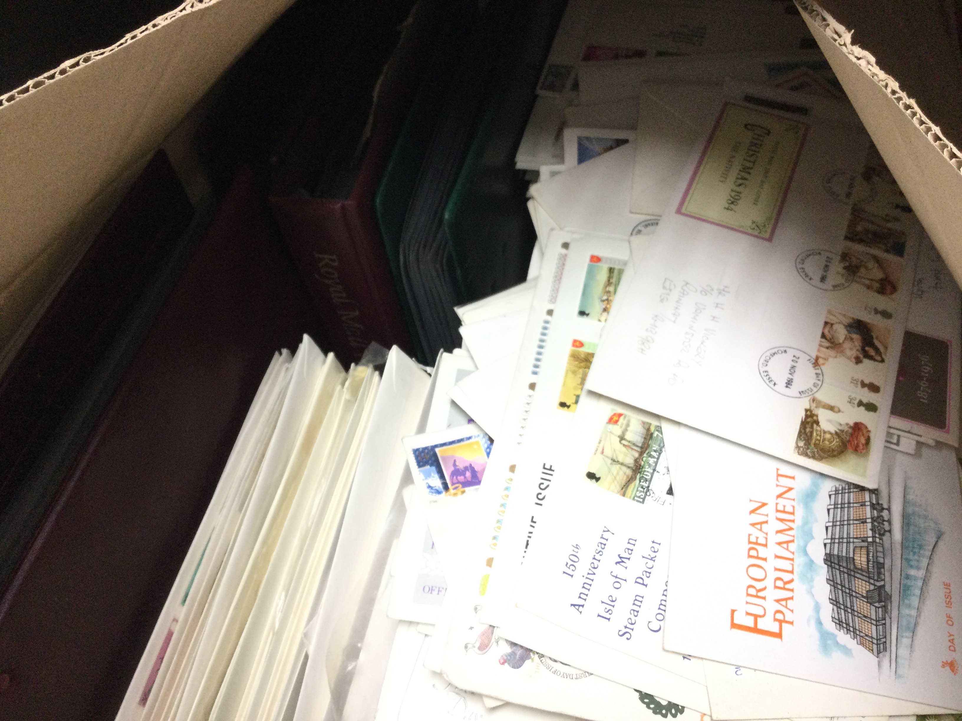 Three large boxes containing first day covers and some stamp albums. This lot cannot be posted