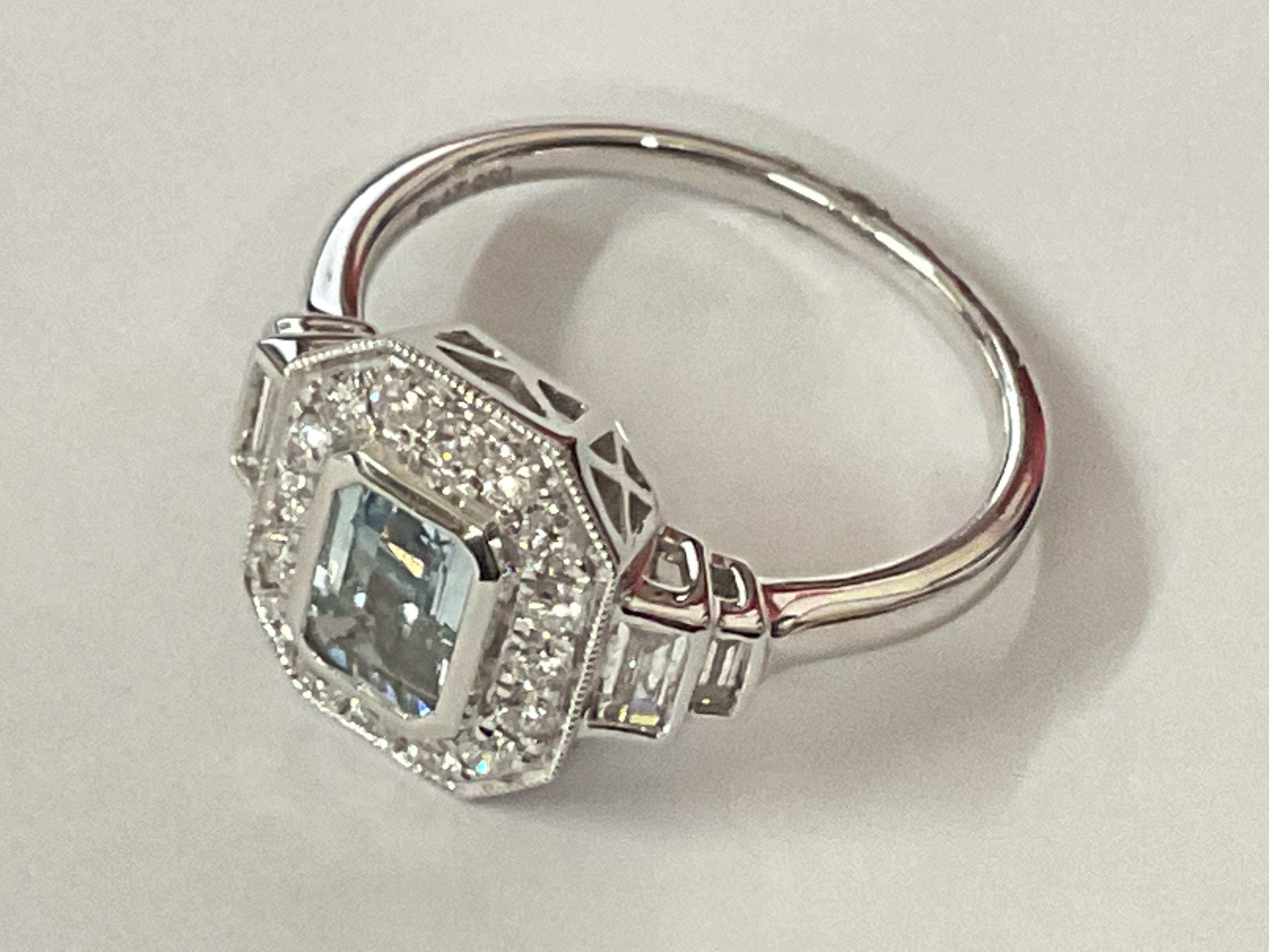 Platinum art deco style ring set with central step cut aquamarine and RBC and baguette cut diamonds. Aquamarine 0.82ct. Diamonds 0.60ct. Postage category A.