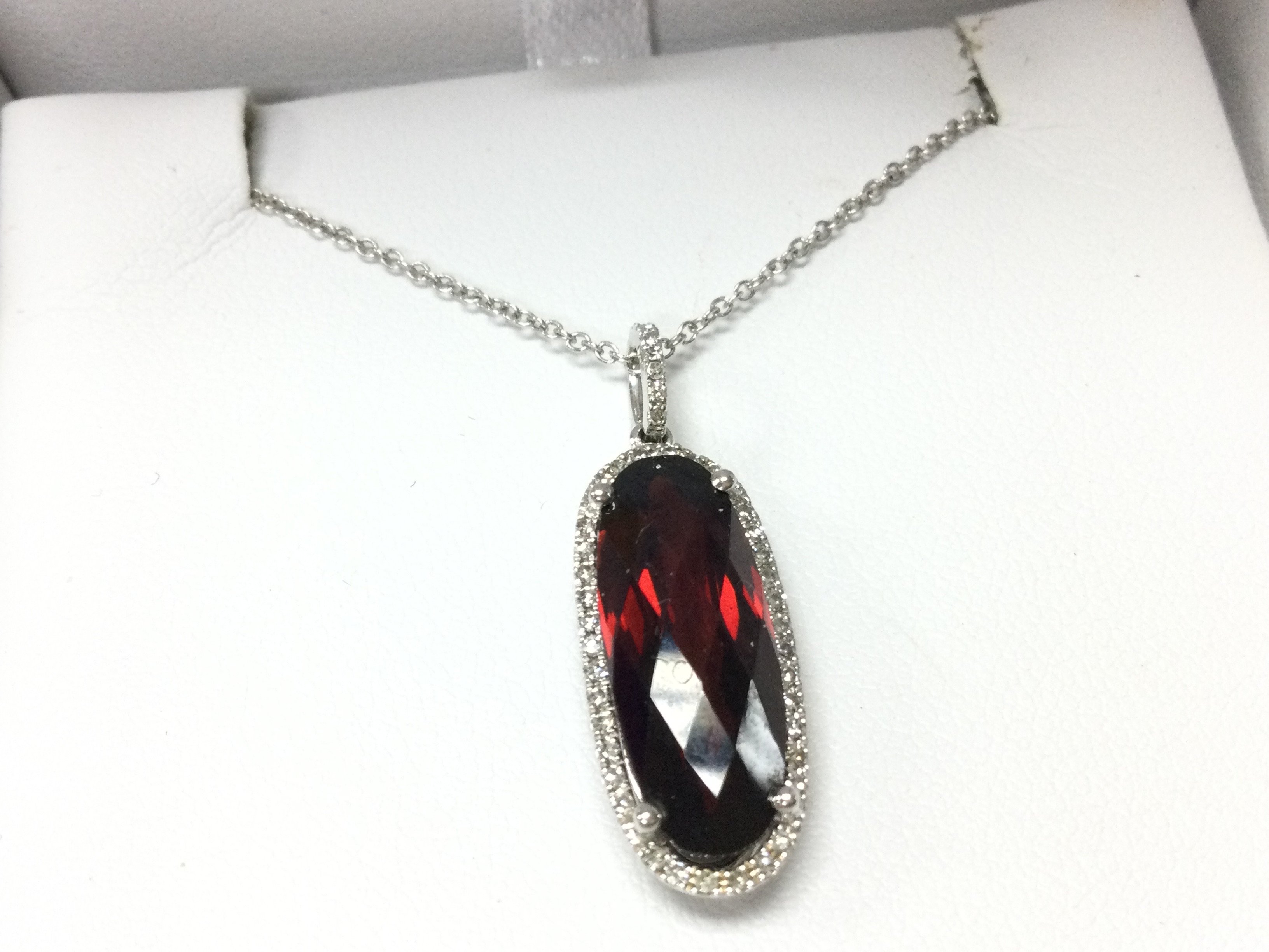 A 9ct white gold garnet and diamond necklace , 3.2g total weight. With receipts . Postage category A