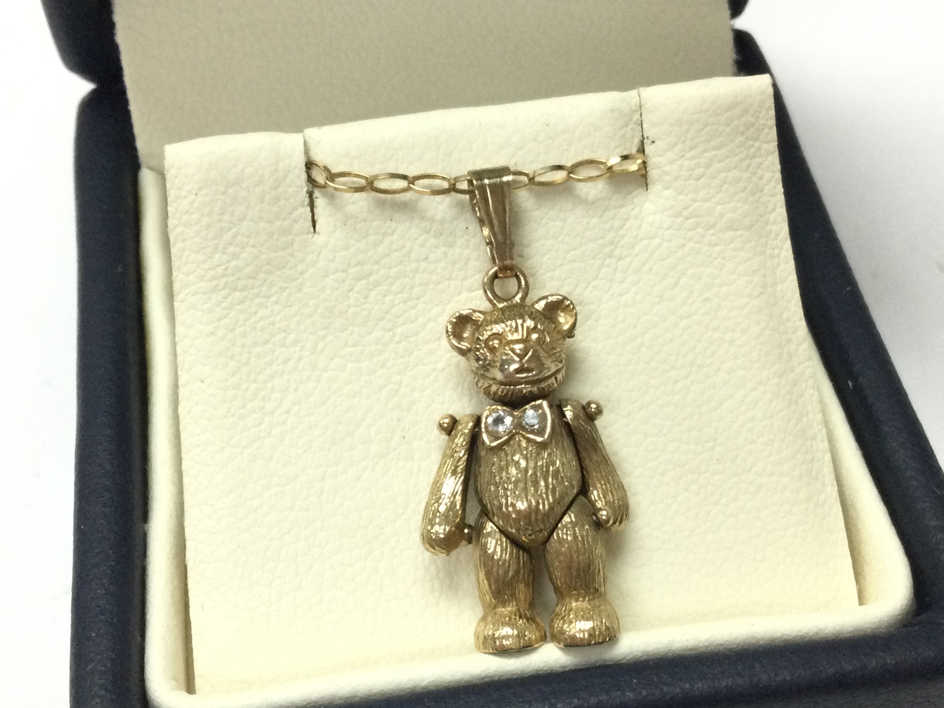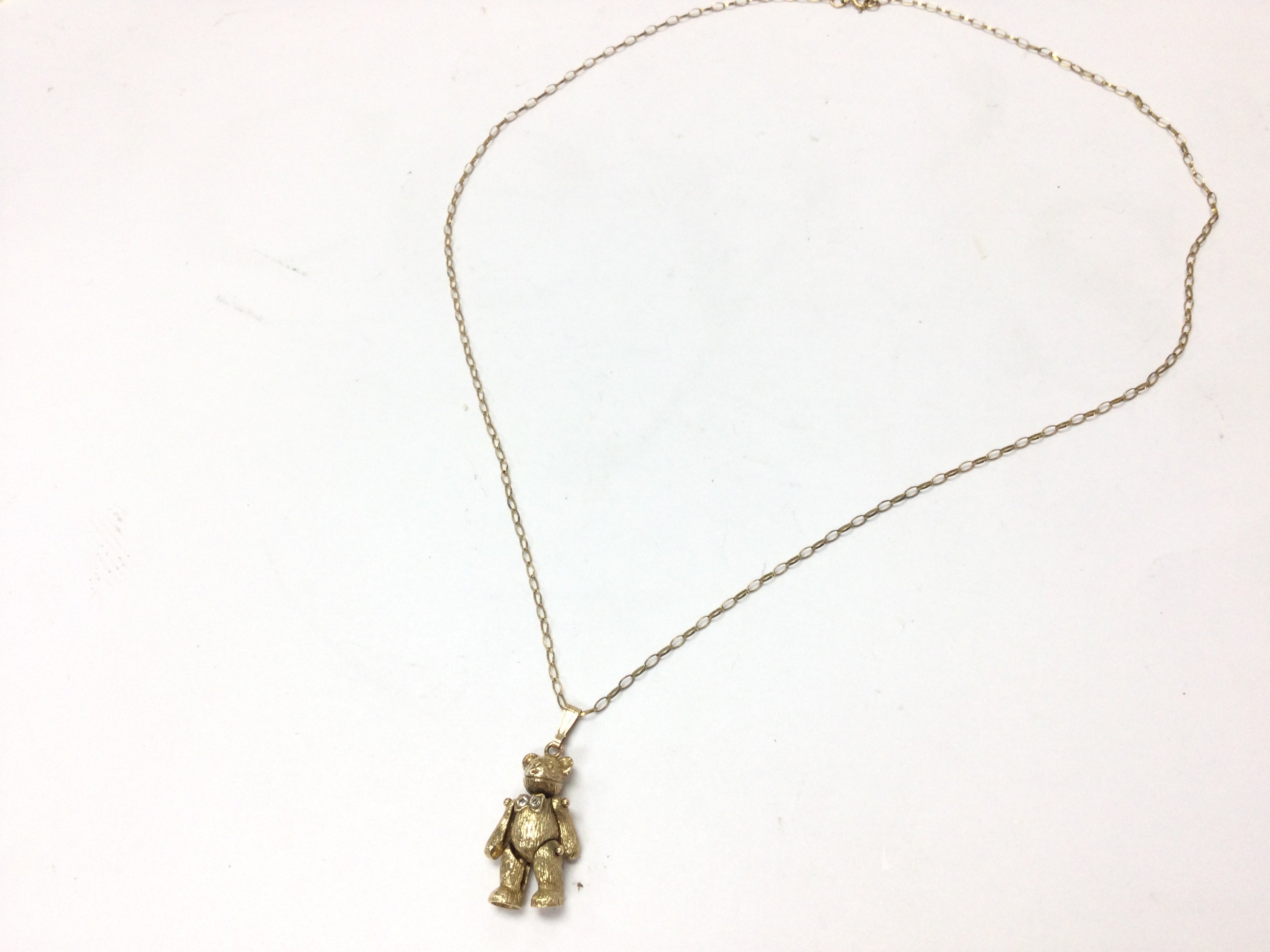 A 9 carat gold Teddy pendant on a 9ct chain, 3.5g . Postage category A