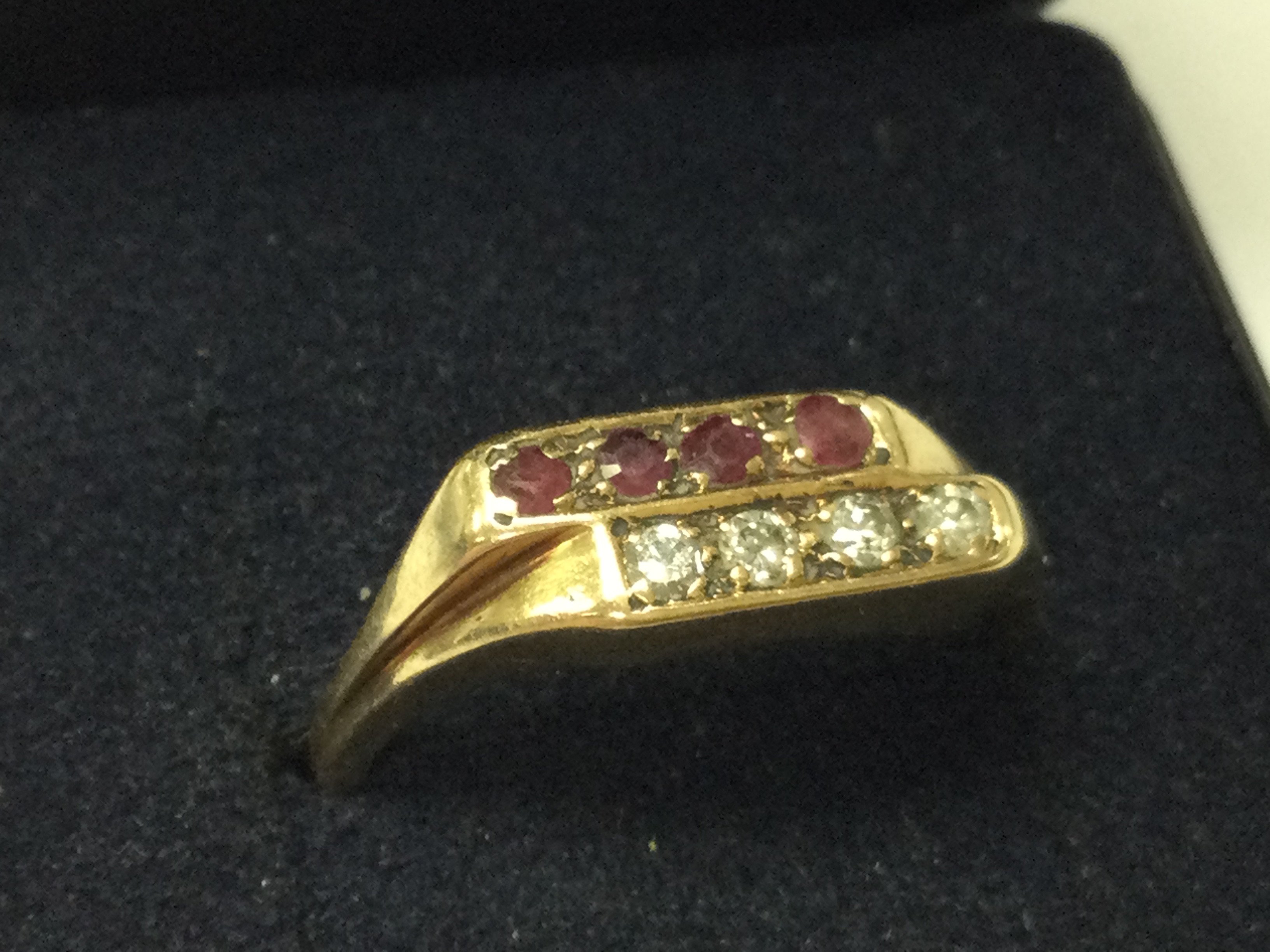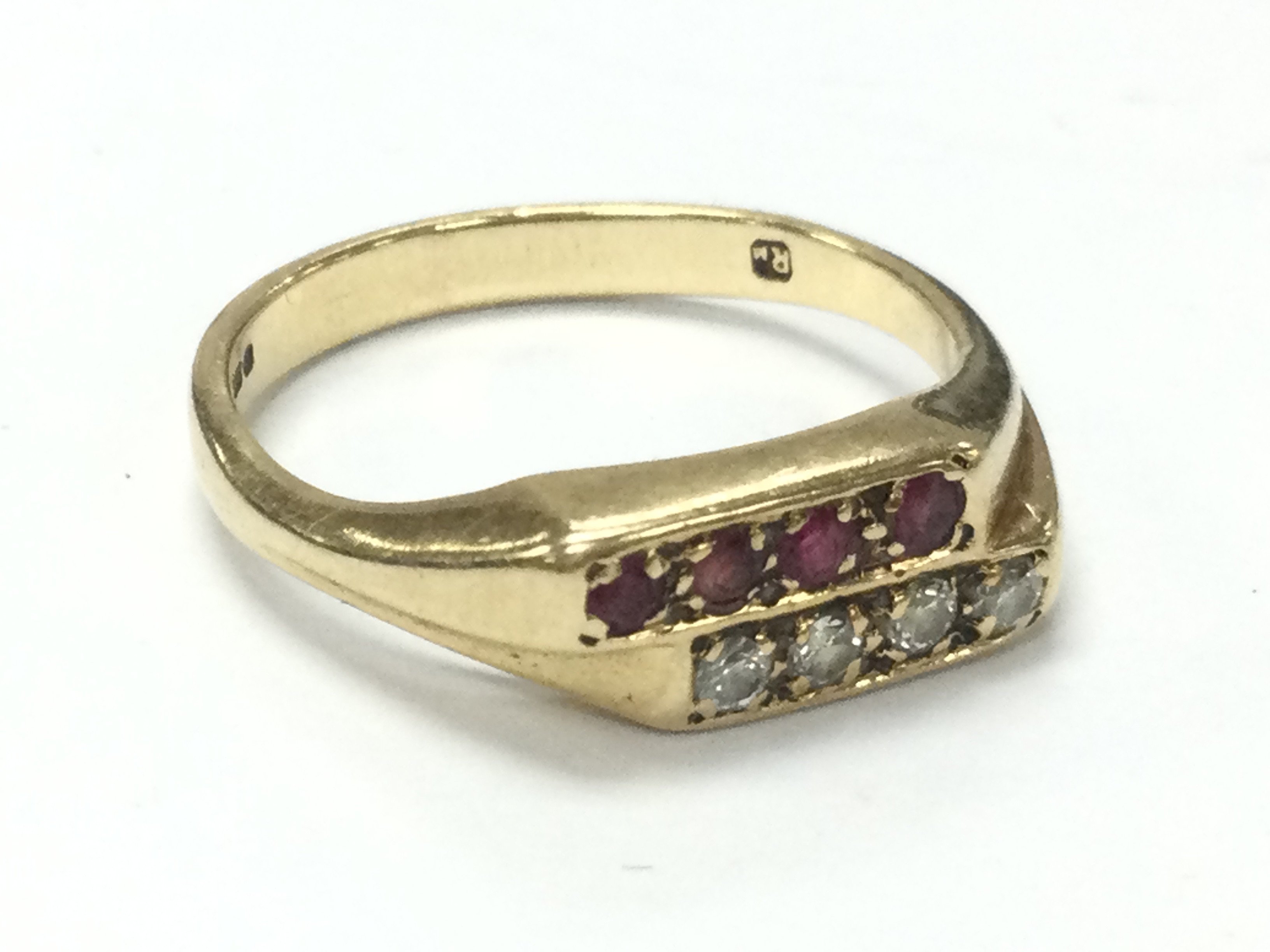 A 9ct gold diamond and ruby ring , size O. 2.9g total weight. Postage category A