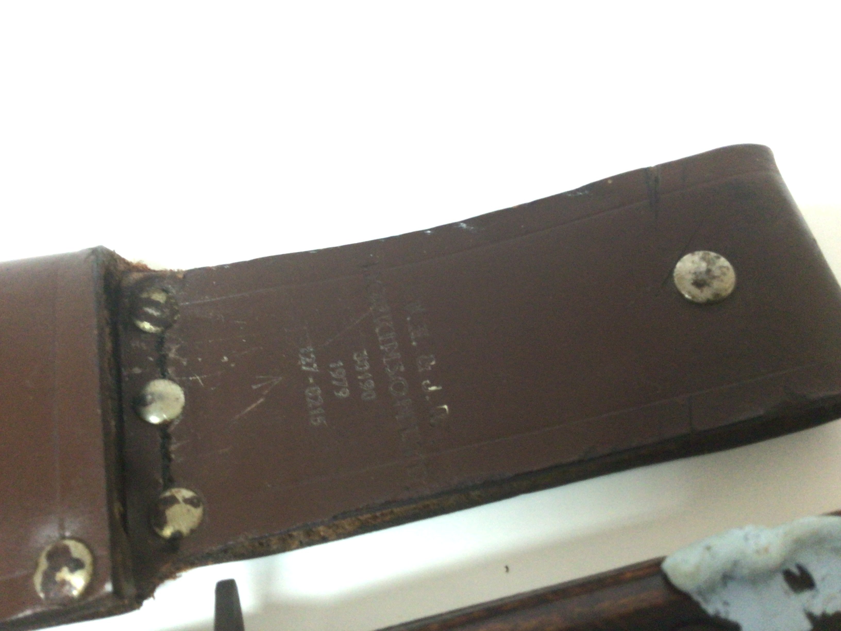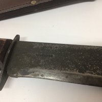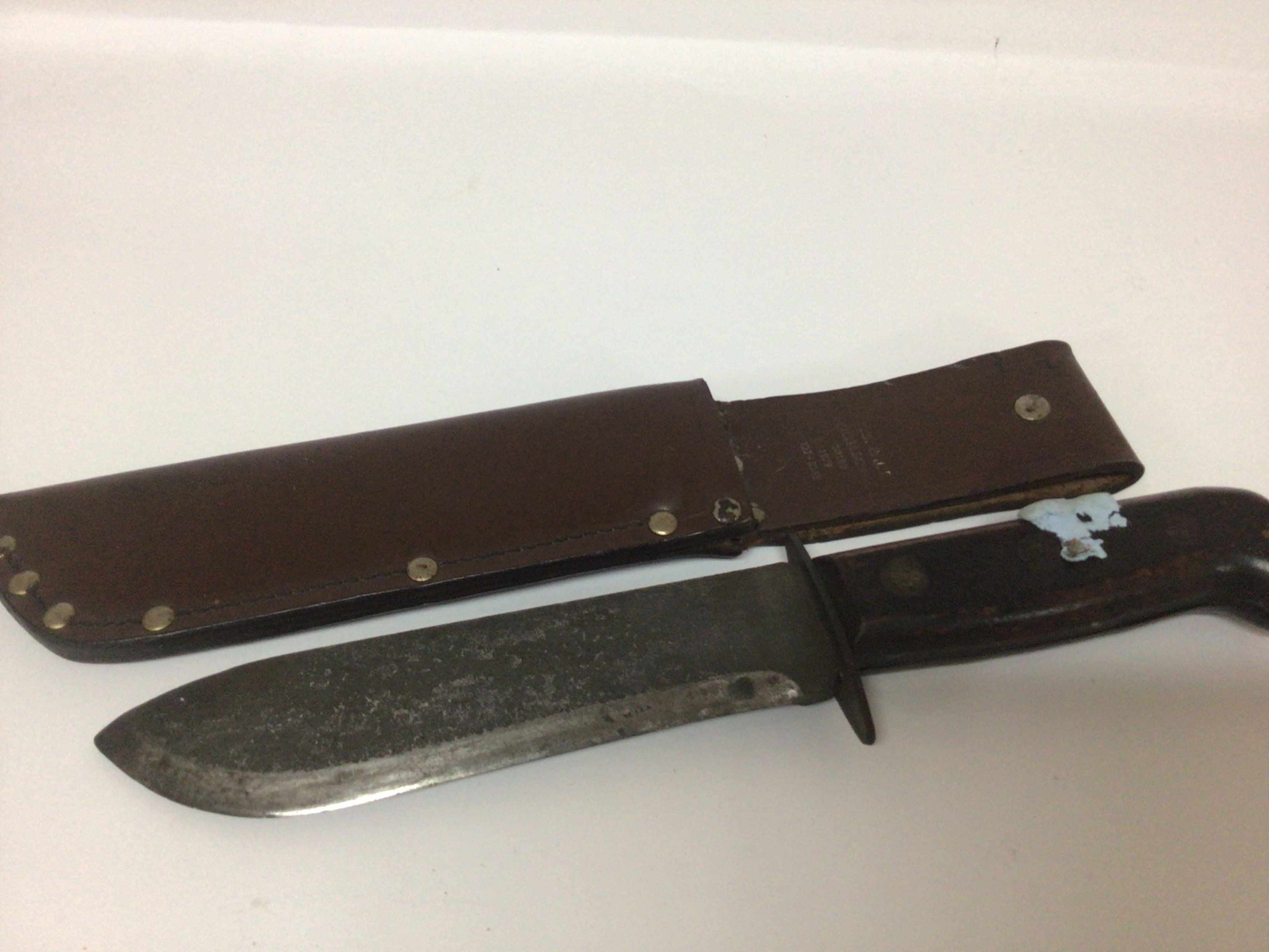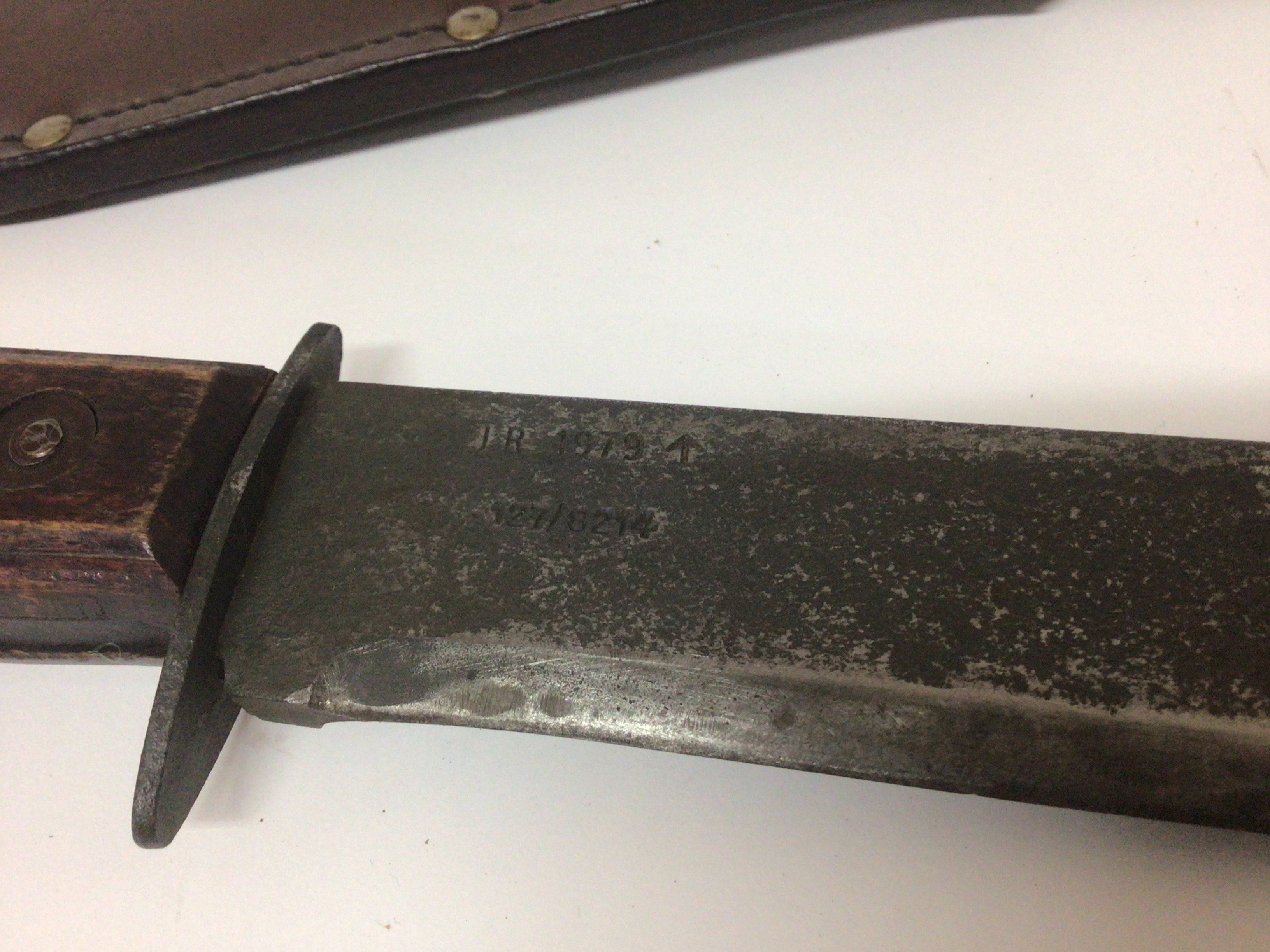 A British Military knife with leather scabbed both knife and scabbard with military marks and makers marks FE Hopkinson Ltd JR 1979 127/8214 length 34cm
