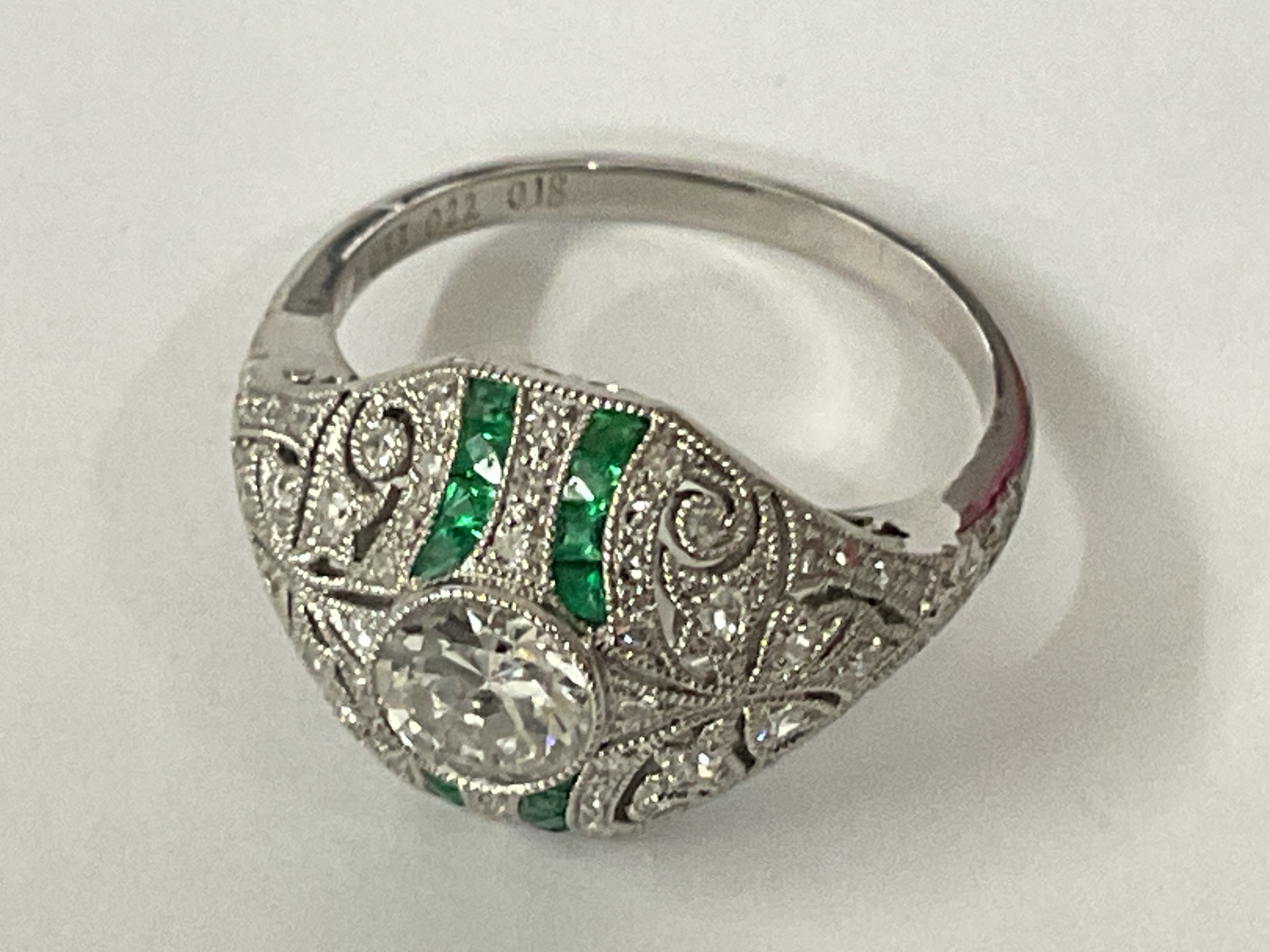 Platinum emerald and diamond dress ring with ornate, beaded setting. Centre diamond 0.57ct. Calibre cut emeralds 0.18ct. Accent diamonds 0.22ct.