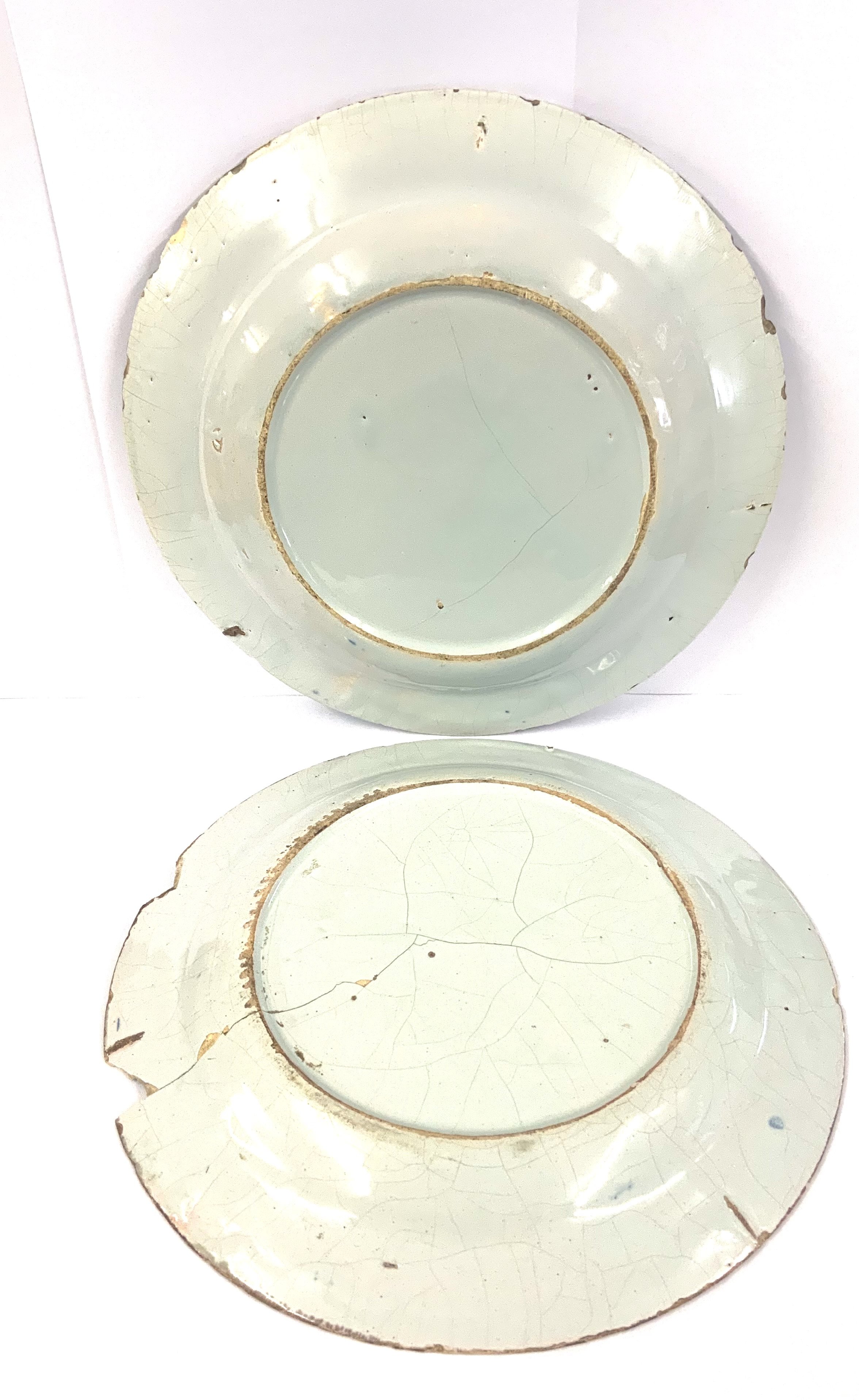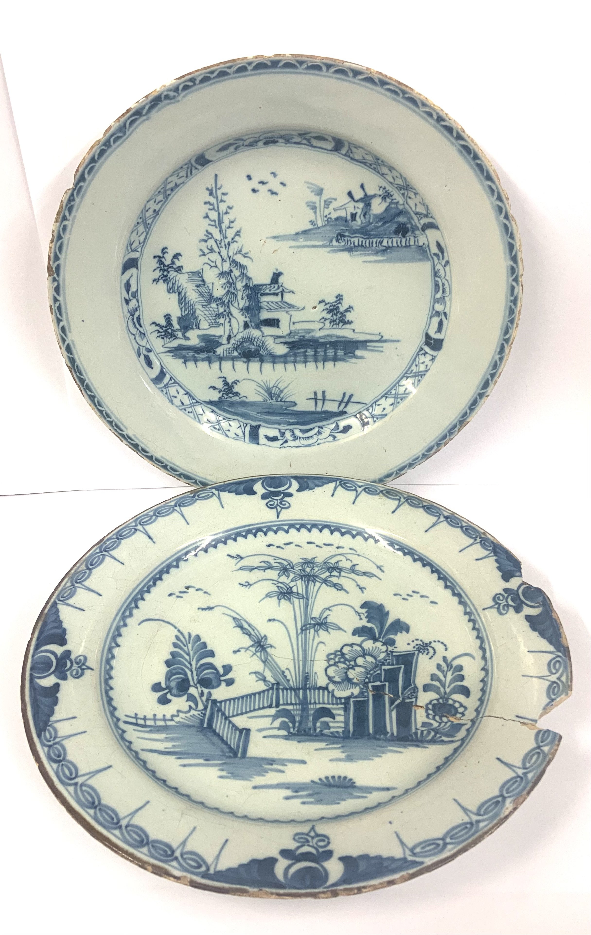 18th century English Delft pottery chinoiserie style blue and white plate together with a similar example. 22.5cm.