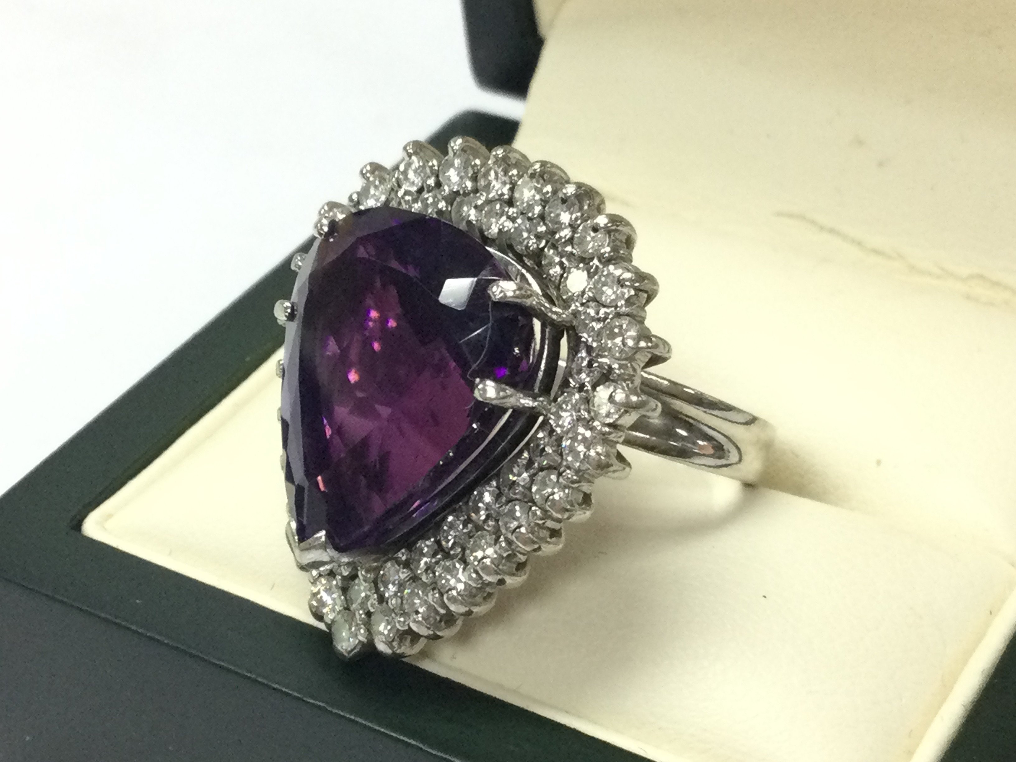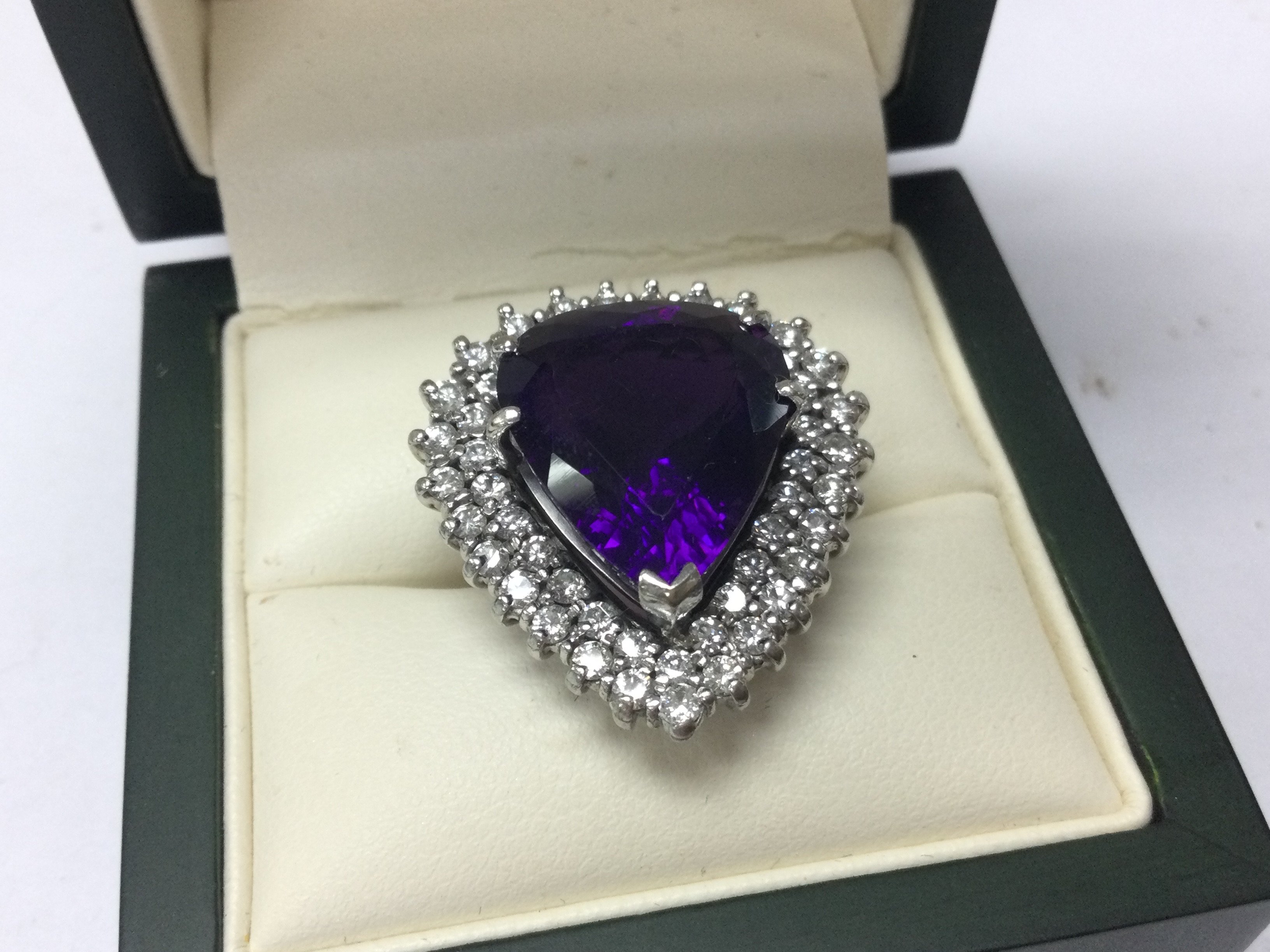 An 18ct white gold pear shaped amethyst ladies ring , 13.75ct deep purple 22 stones diamond total approx 1.6ct . Size L/M . 14g total weight. Postage category A