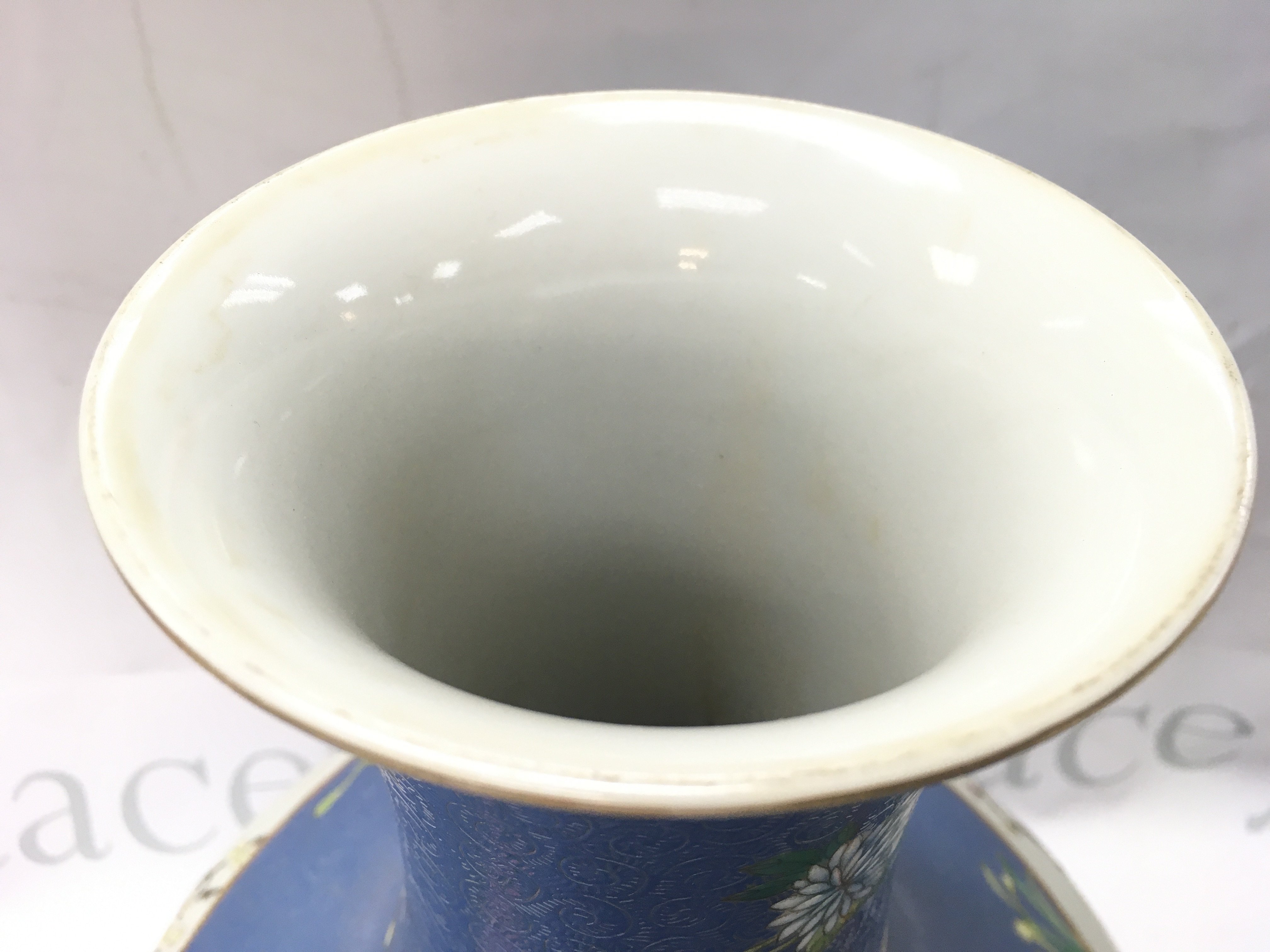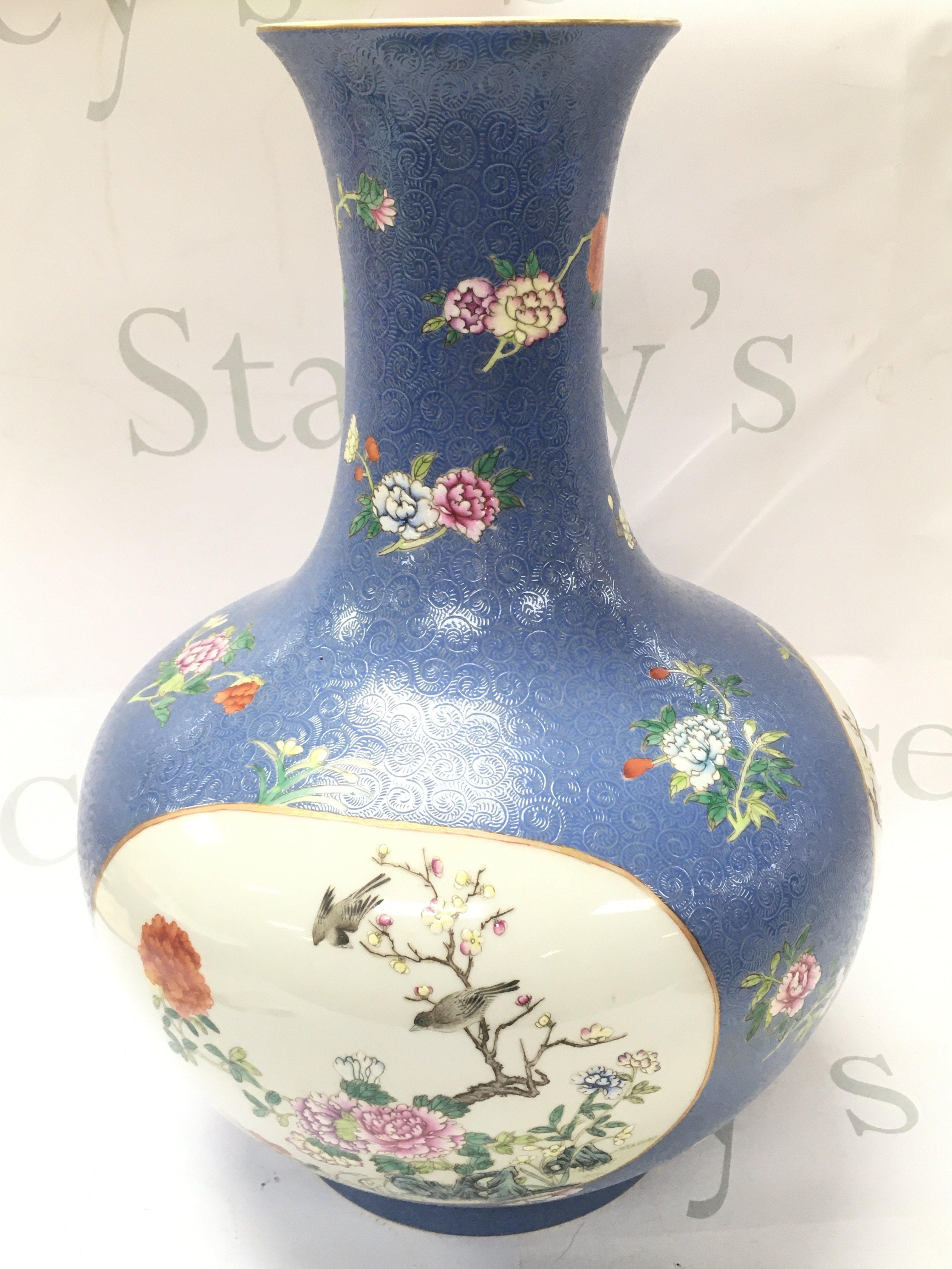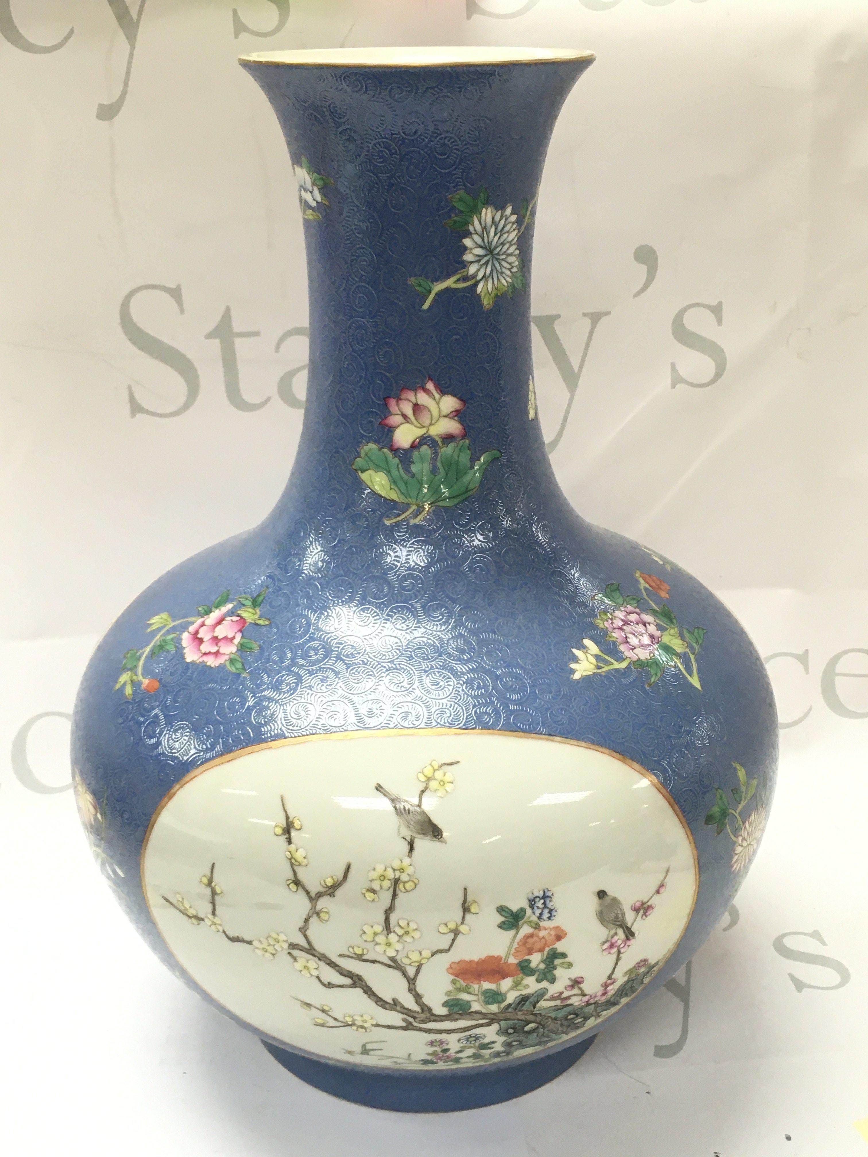 A Chinese Qianlong marked vase with hand painted panel design of birds and flowers. No obvious damage or restoration, some flaws in the glaze. 35cm tall. This lot cannot be posted