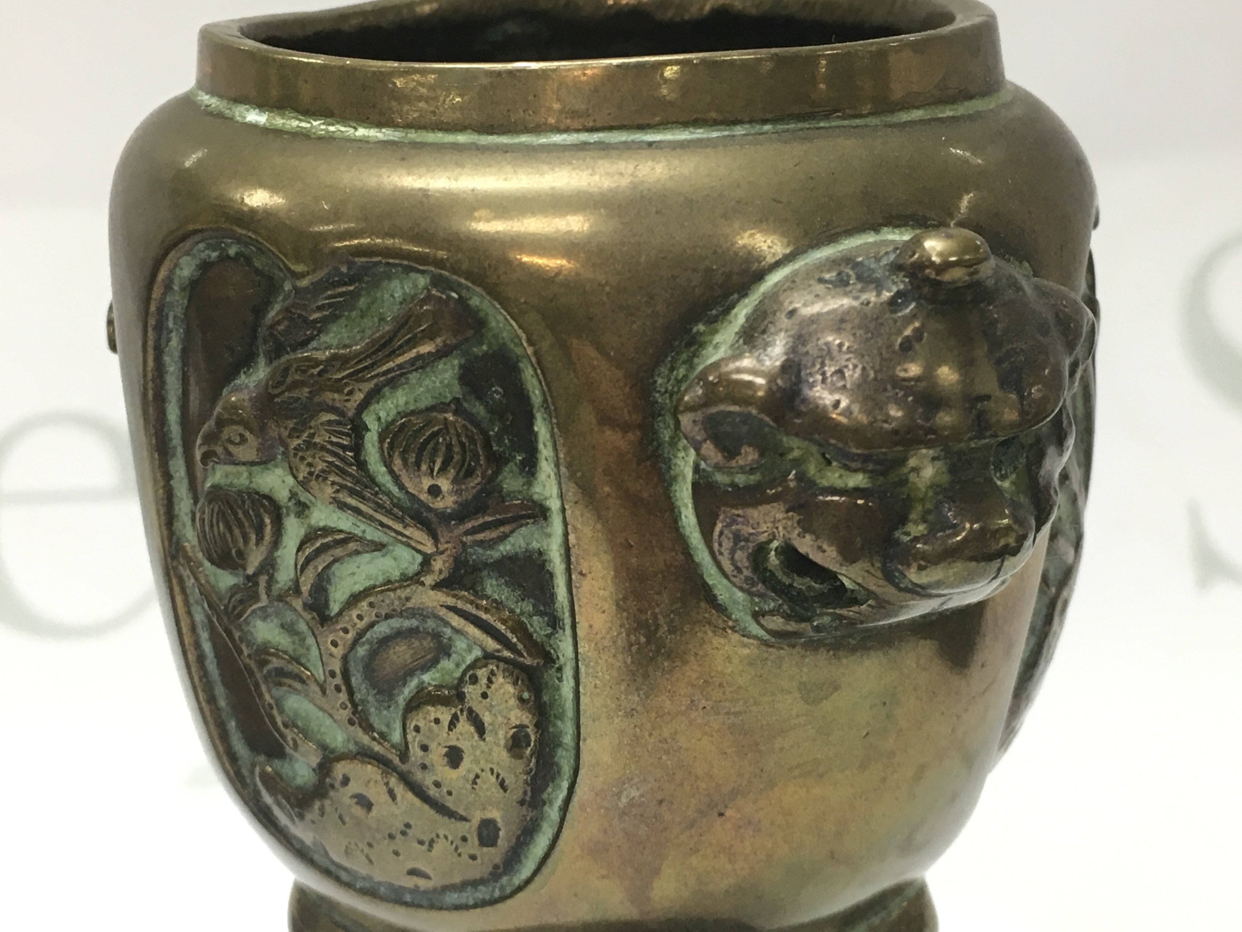 Chinese Bronze censer with a six character mark to the base and a bronze tripod incense burner with Dragon head and insect design, with wooden stand . Censer 7Cm tall , burner 14cm tall. Postage category B