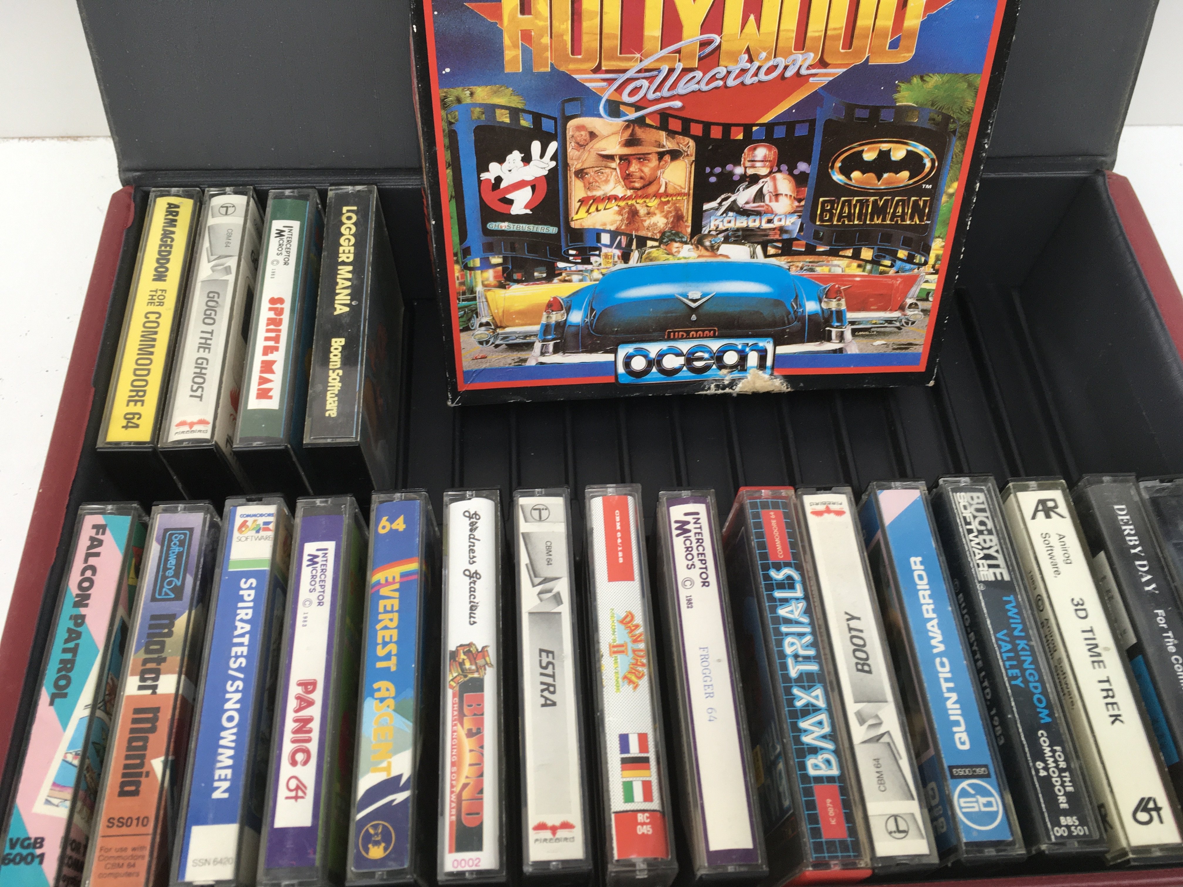 A collection of boxed game cassette tapes for Commodore 64. Includes storage case. No reserve