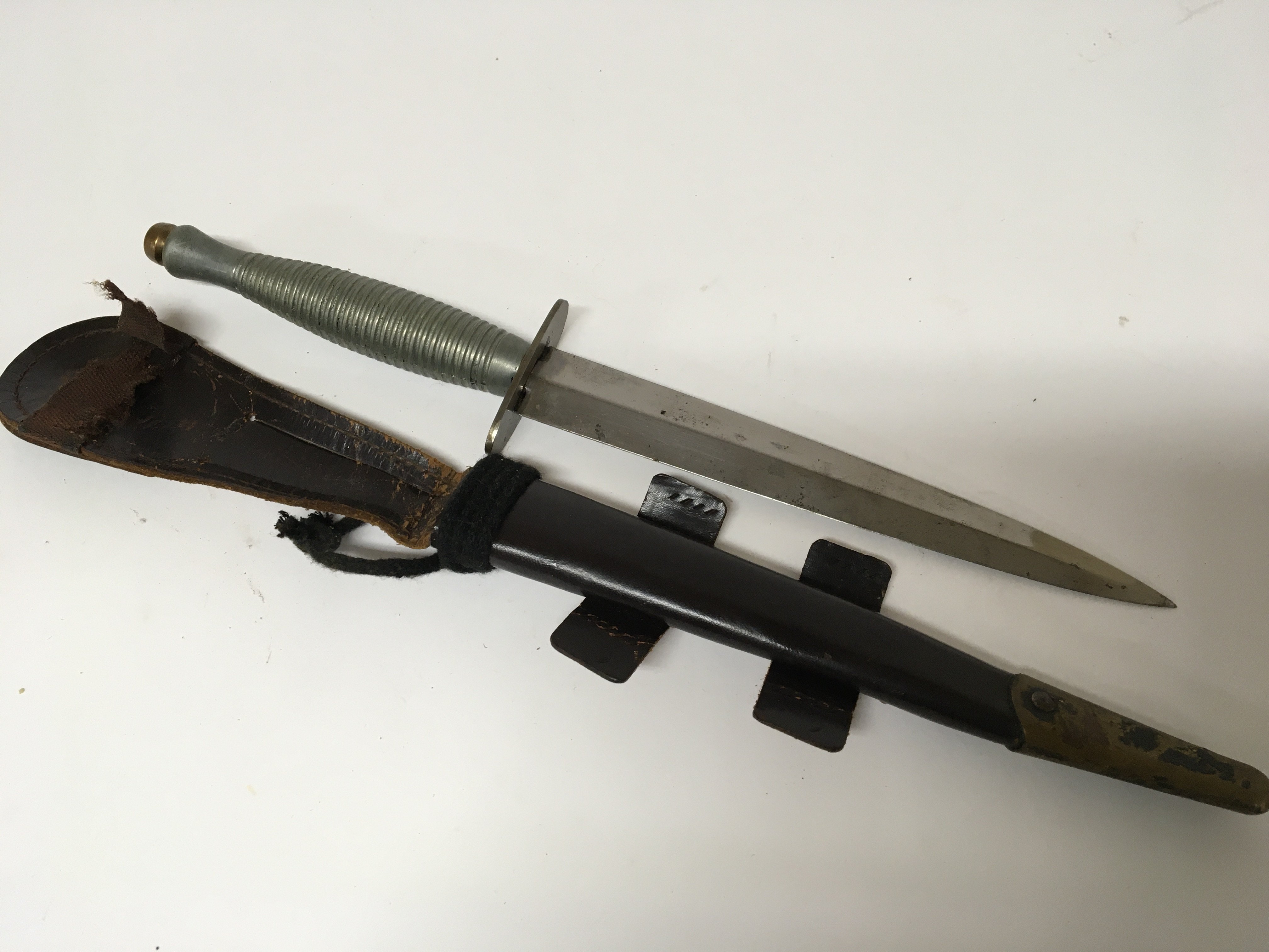 A Fairbrain Sykes Commando fighting knife with an aluminium coloured cast handle in a leather scabbard.