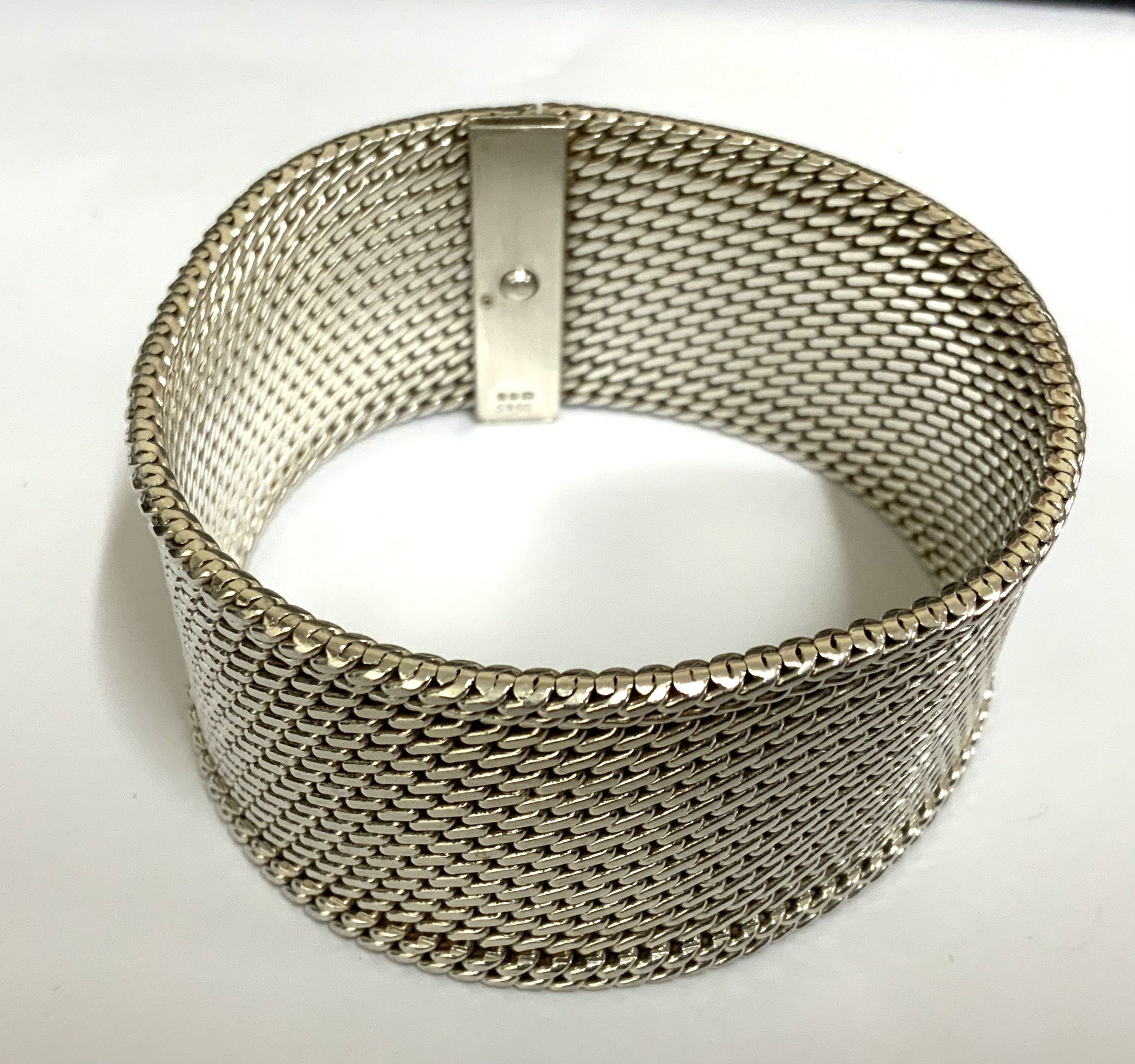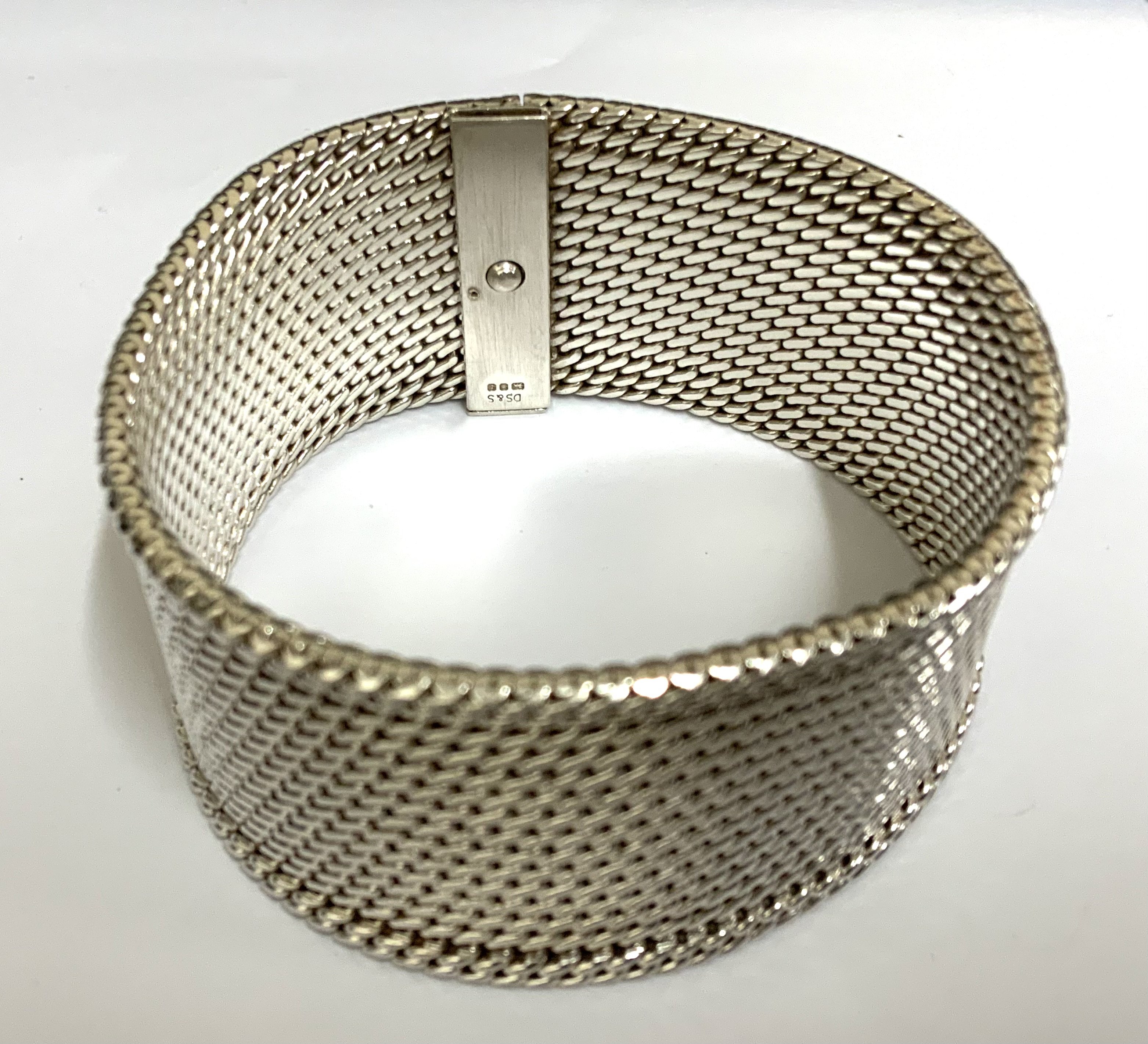 A heavy hallmarked sterling silver woven mesh bracelet. 19cm x 3.1cm wide. (A)