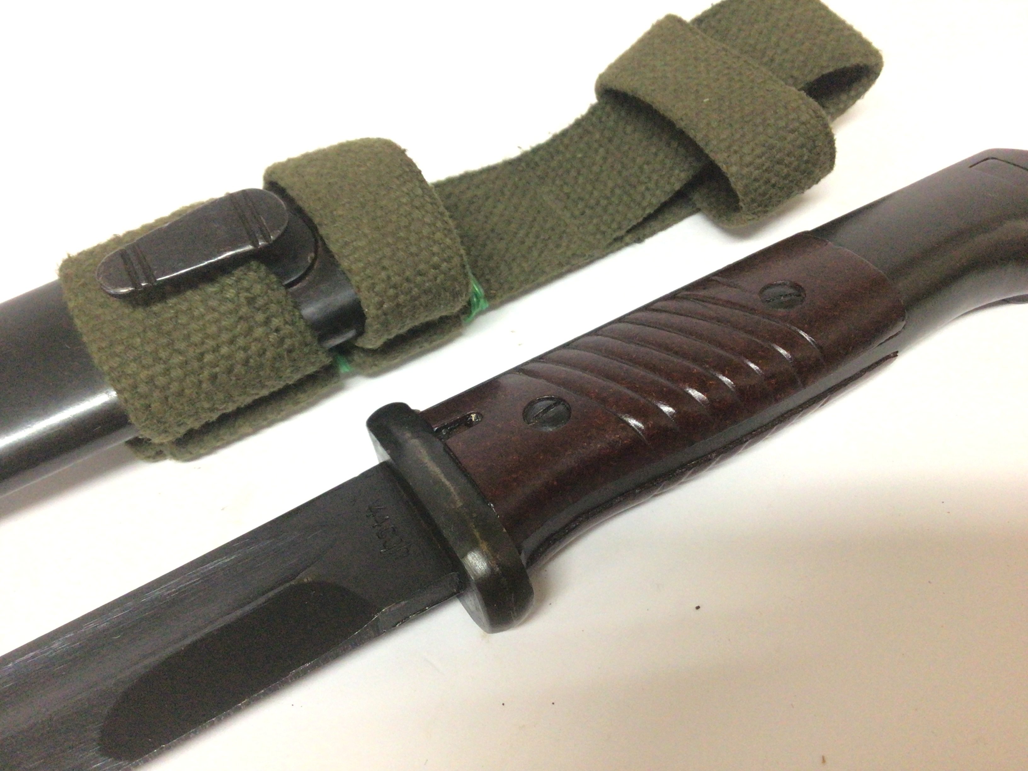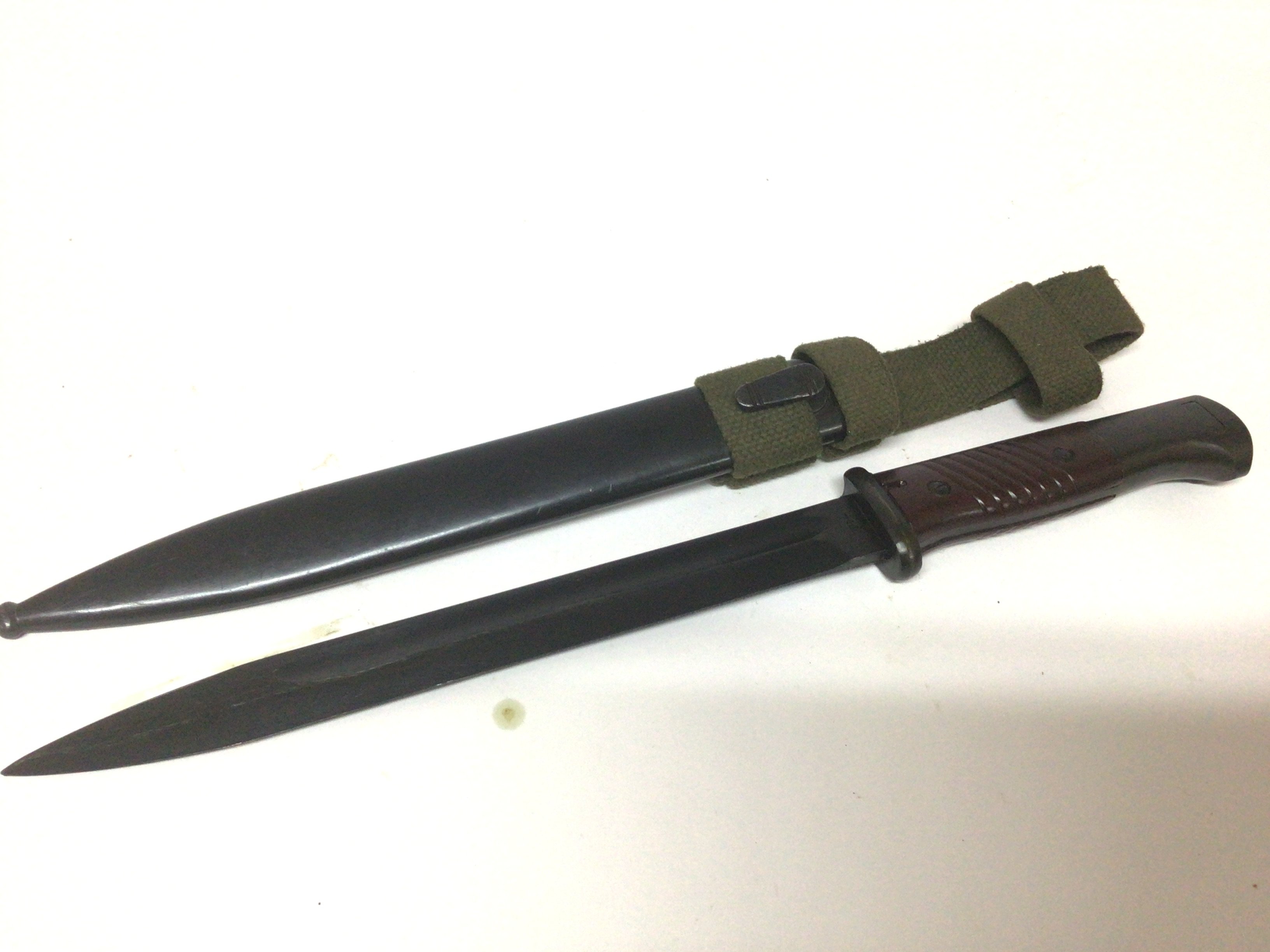 A German Third Reich K98 bayonet with unusual stamp mark 44cqh maker Steitengewchr with metal scabbed and later green woven frog attached.