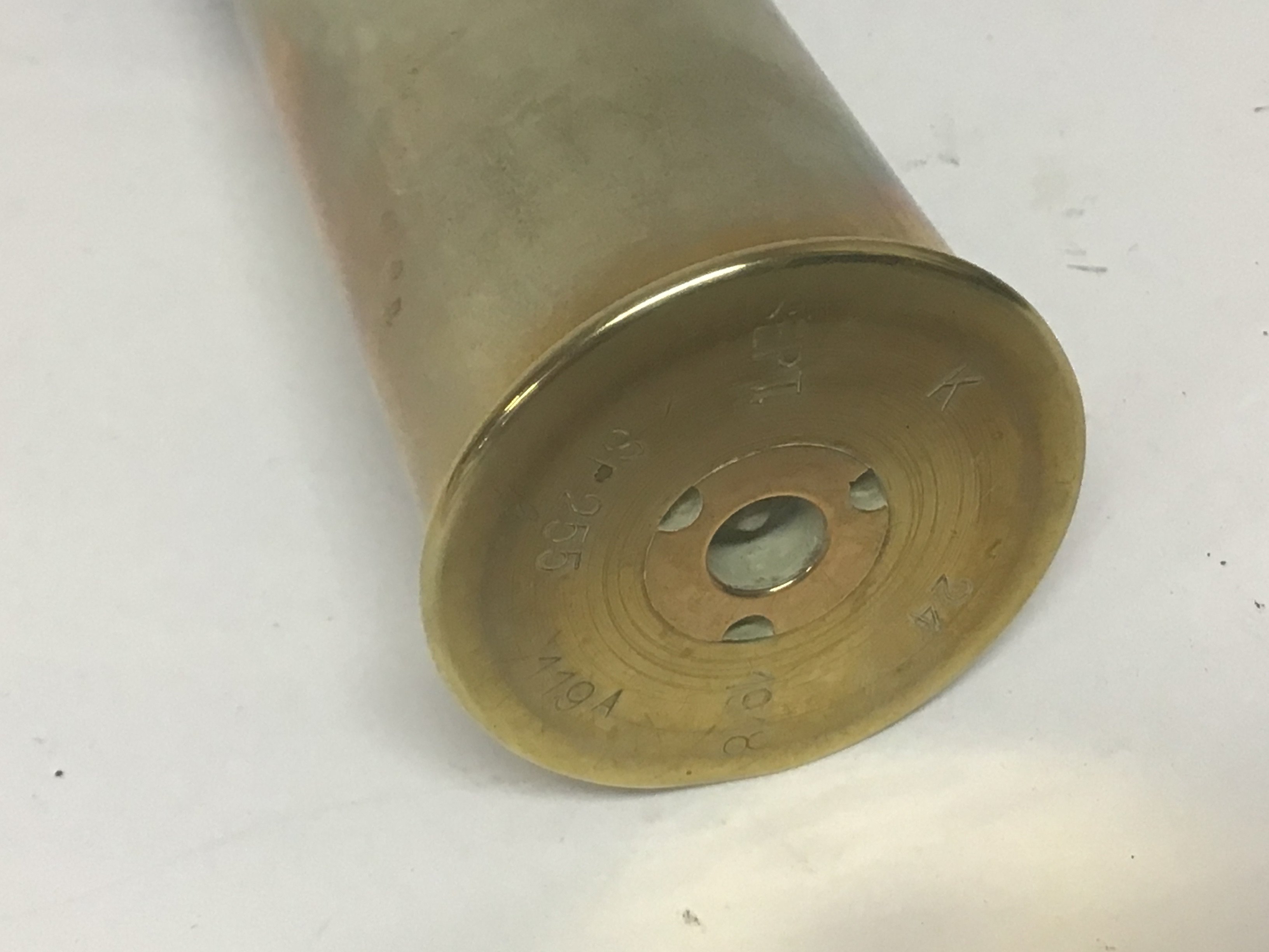 A British I world war inert artillery shell stamped sept 1918 with other marks to the base a brass shell with a copper band height 16 cm.