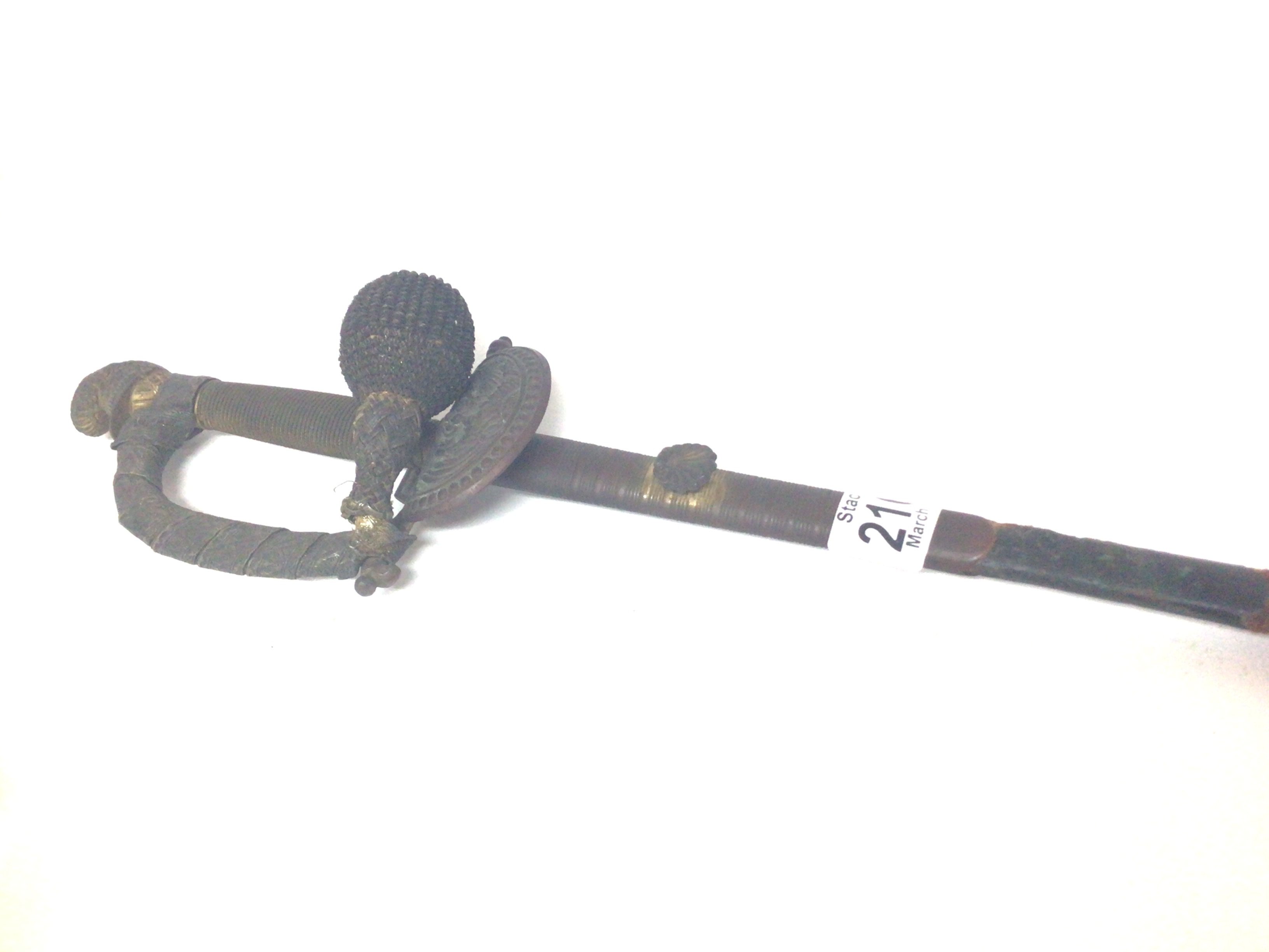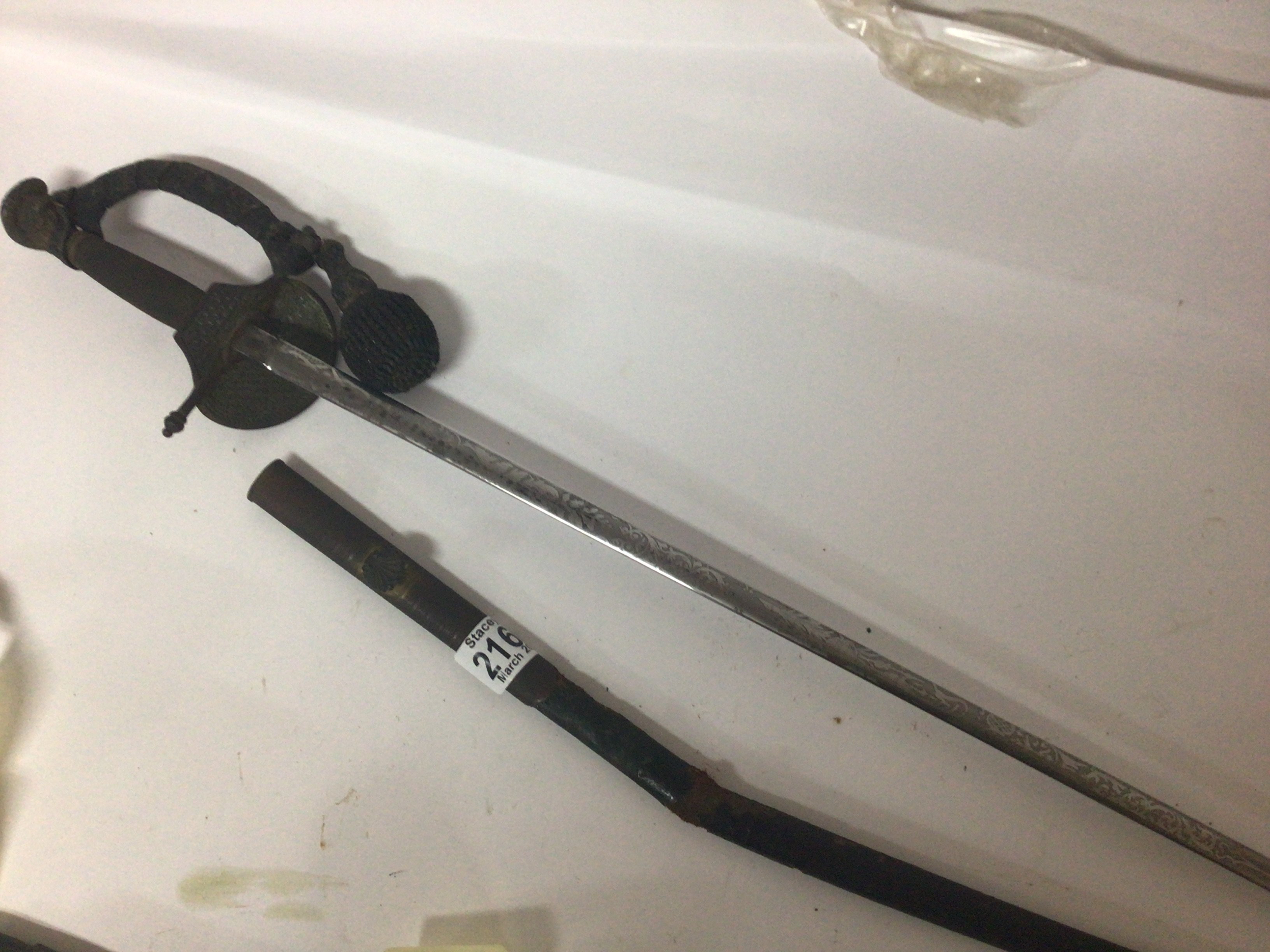 An antique dress sword possible Masonic with an etched blade and brass grip with knight pommel maker E T Hurkle soho London.