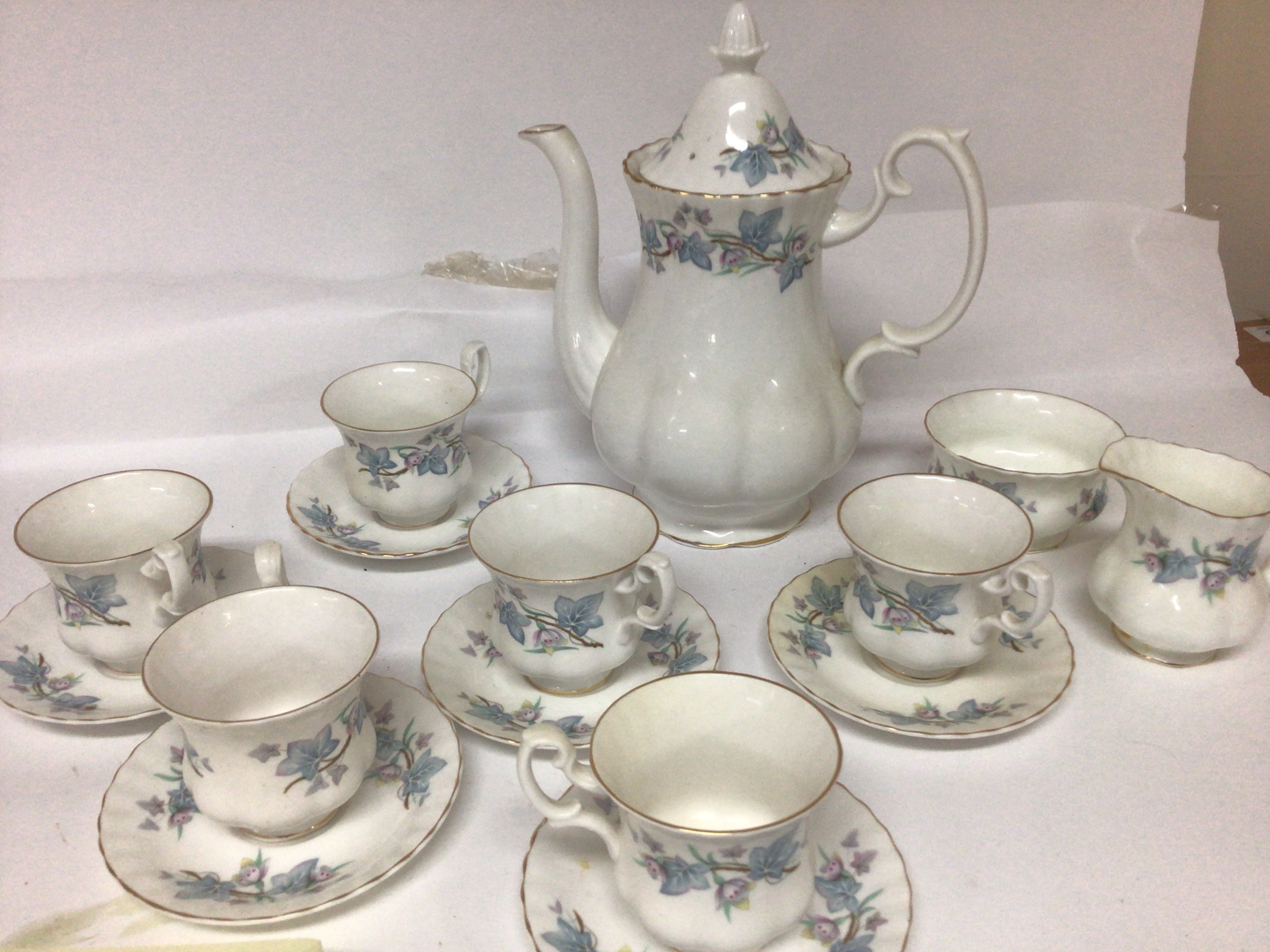 A Royal Kent bone china coffee set six place setting with coffee pot cream jug and sugar bowl with chipped edge.