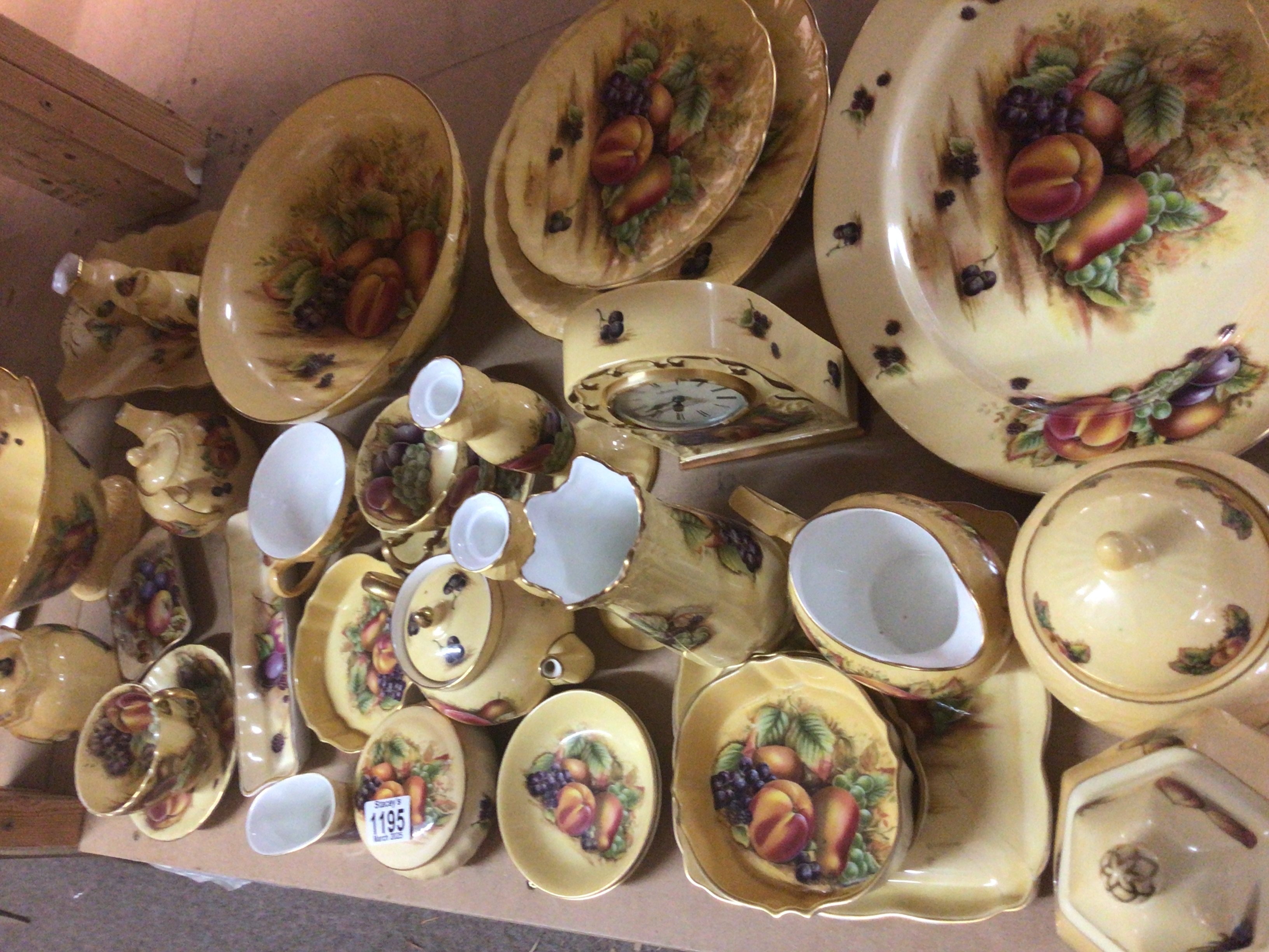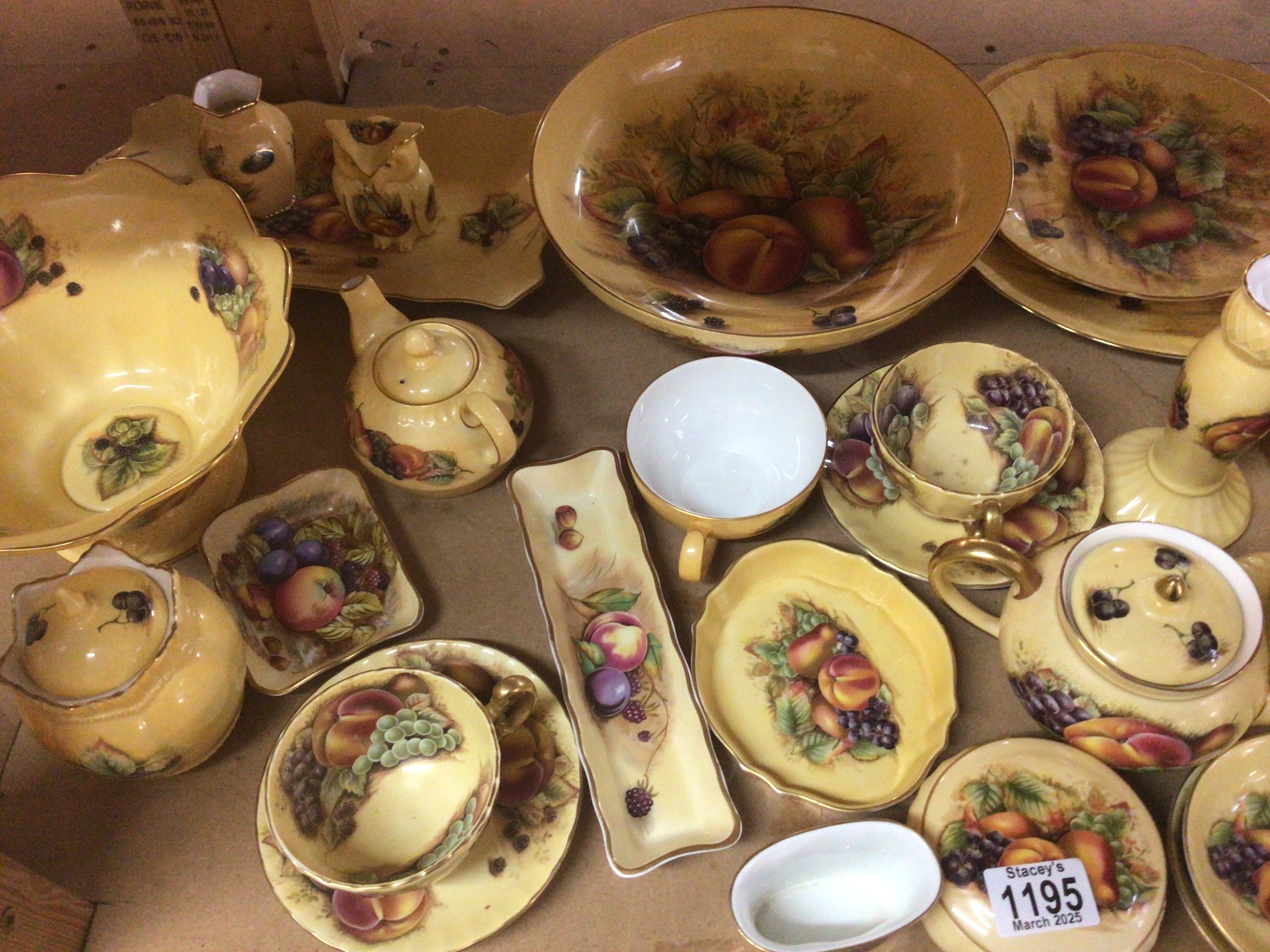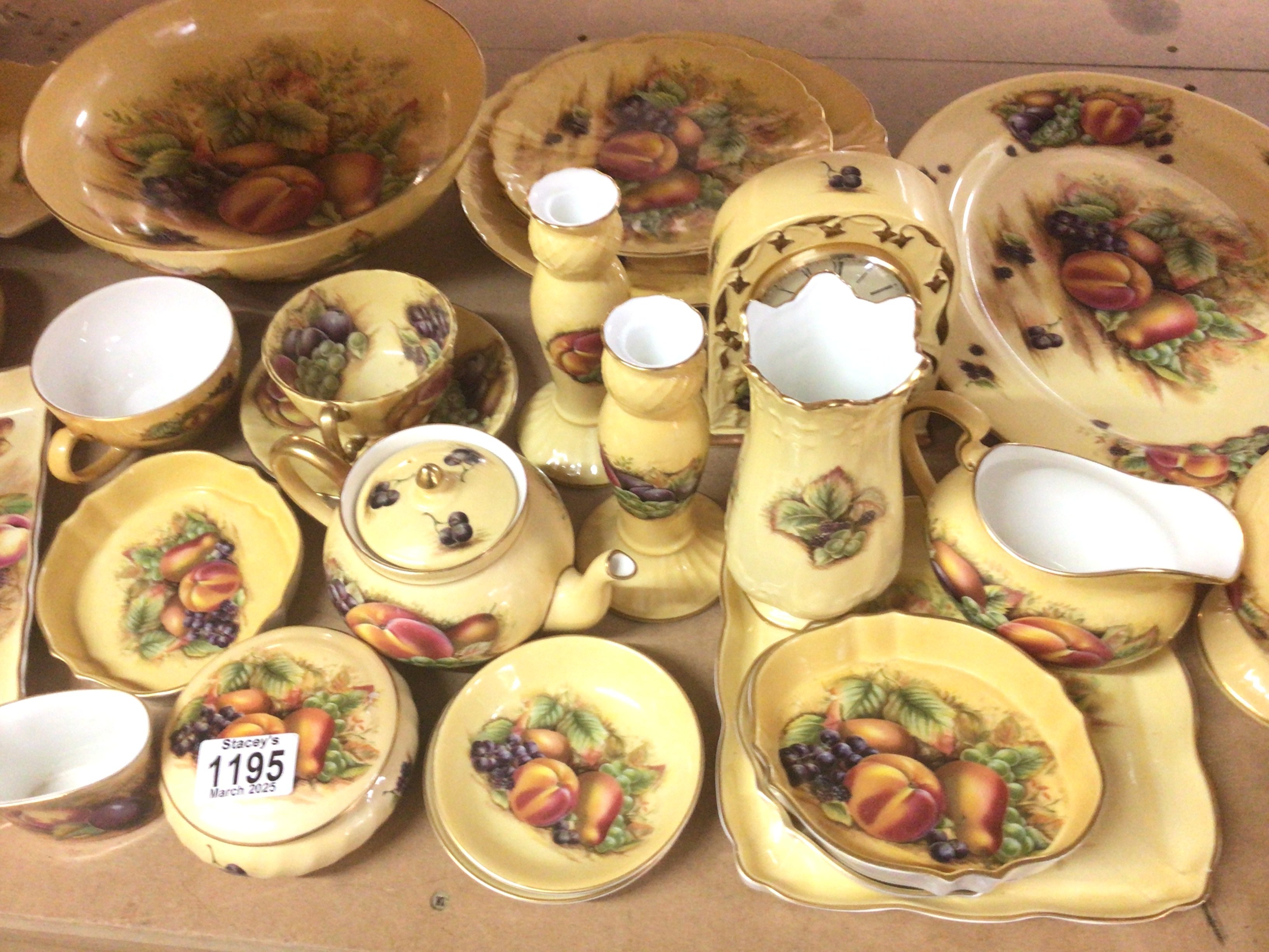 A large collection of Aynsley bone china porcelain The Orchard Gold pattern decorated with scenes of still life fruit and foliage. Bowls tea pots candle sticks a clock vases and others