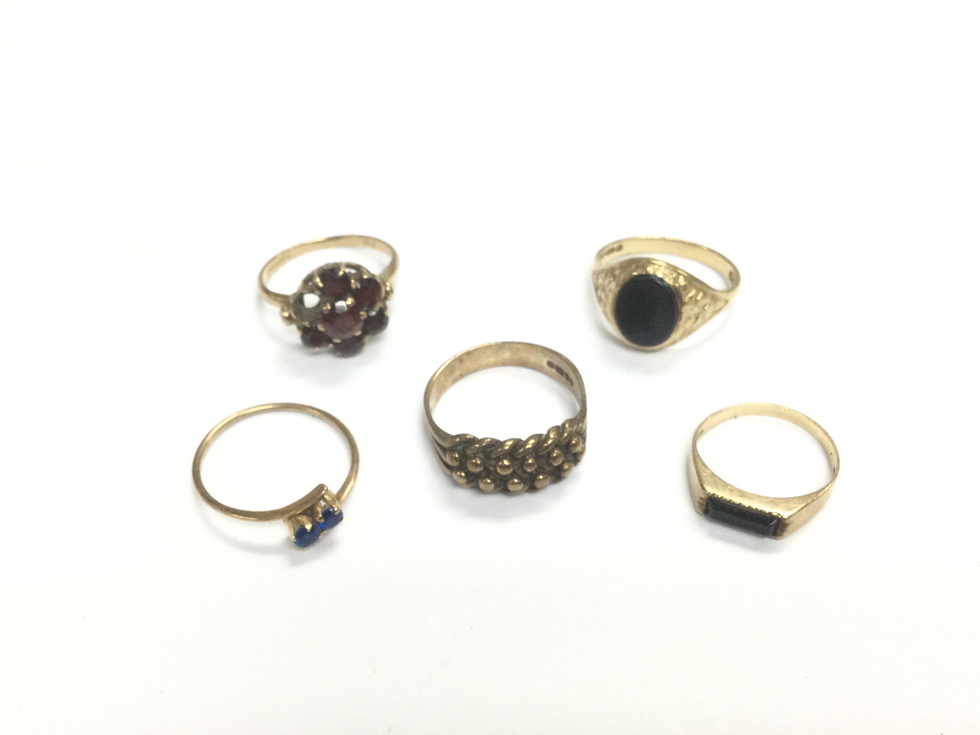 Five 9ct gold rings, mostly set with stones, approx total weight 11.4g. Shipping category A.