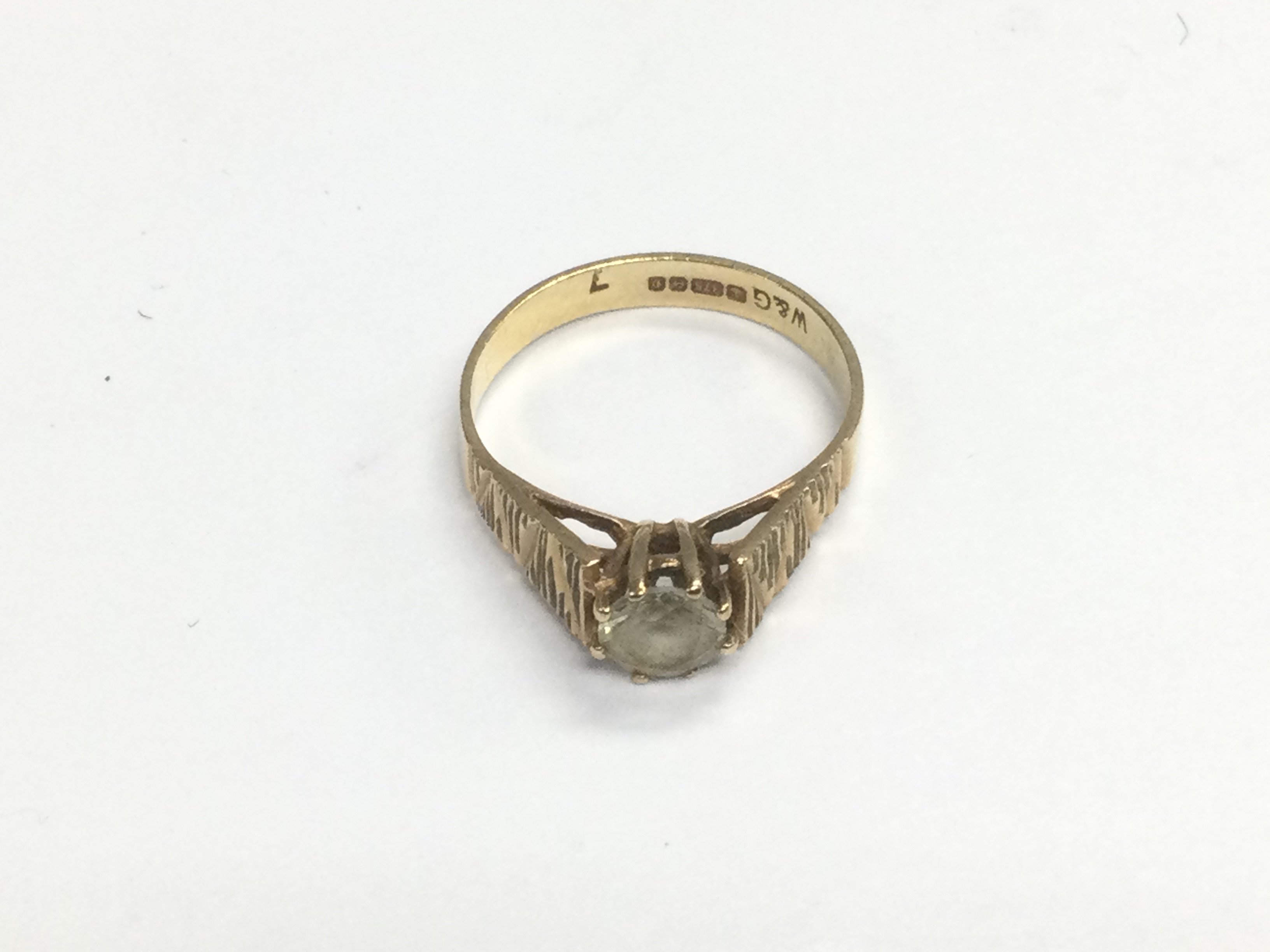 A 9ct gold ring set with a central CZ, approx size K-L and approx 1.8g. Shipping category A.