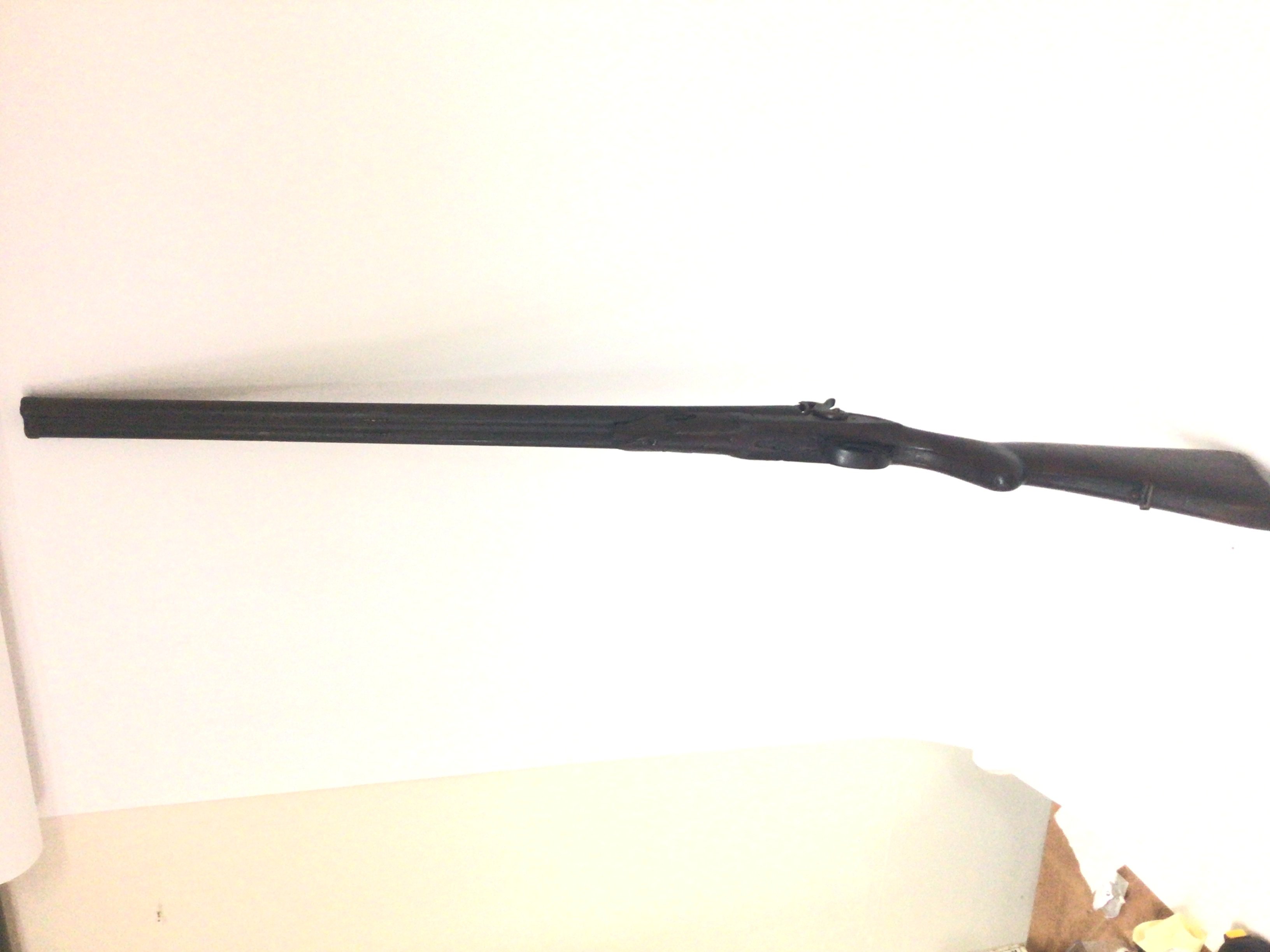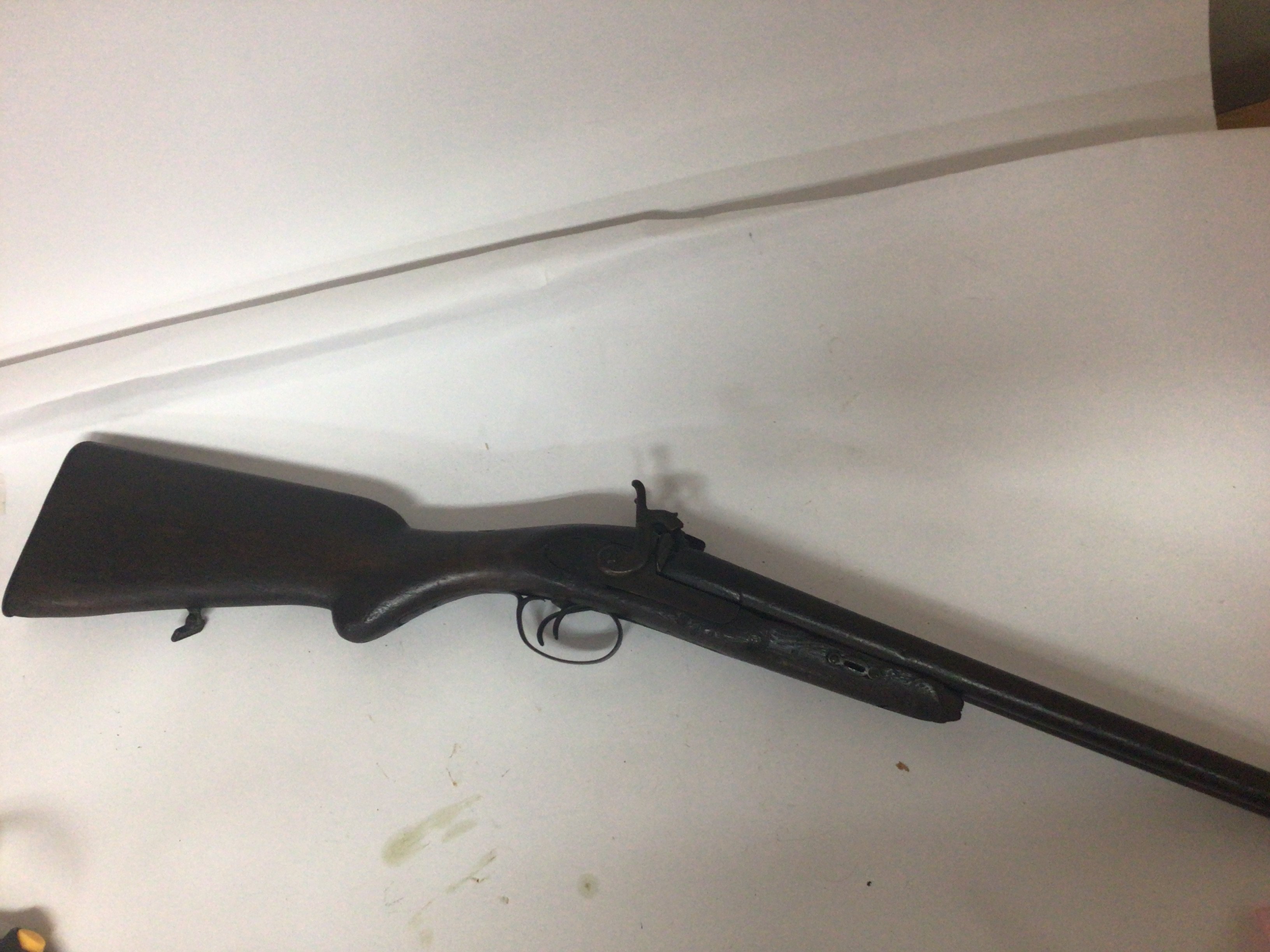 An Antique muzzle load hammer percussion double barrel shot gun. Non functional and for wall ornamentation.