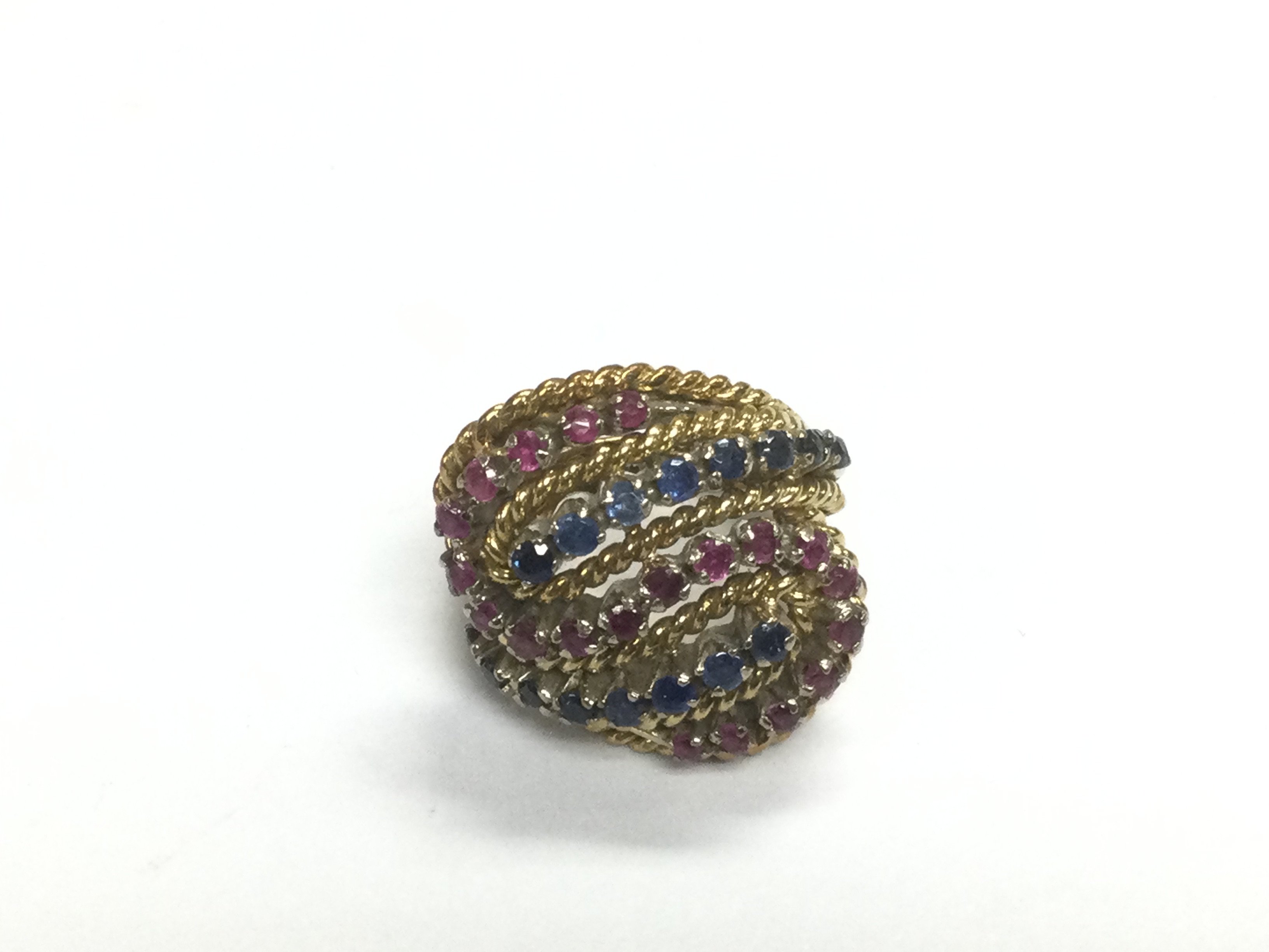An 18ct gold ring set with rubies and sapphires, approx size E-F and approx 8.7g. Shipping category A.