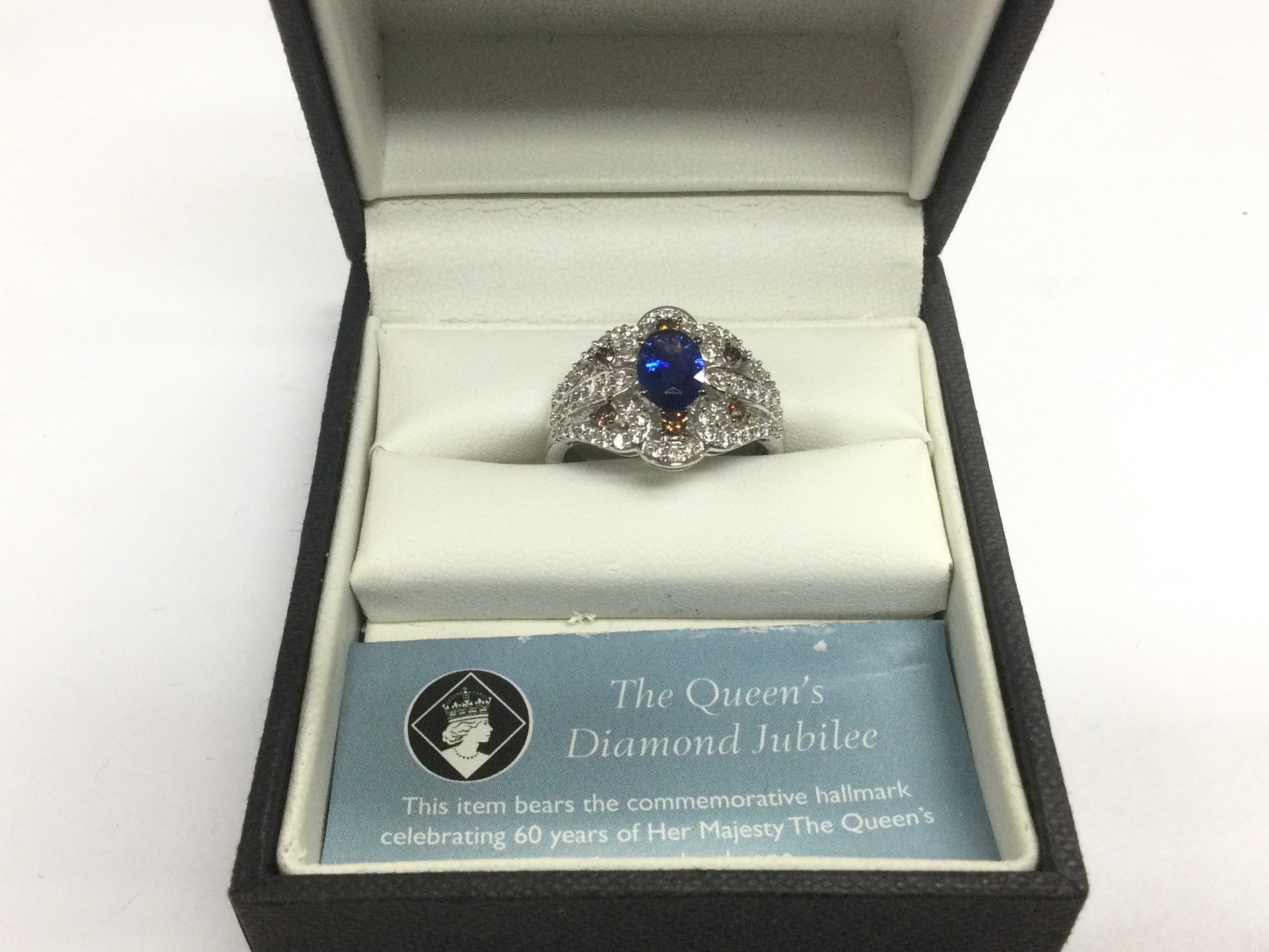 A 14ct white gold ring set with a central blue sapphire and small diamonds, approx size O and approx 5.7g. Shipping category A.