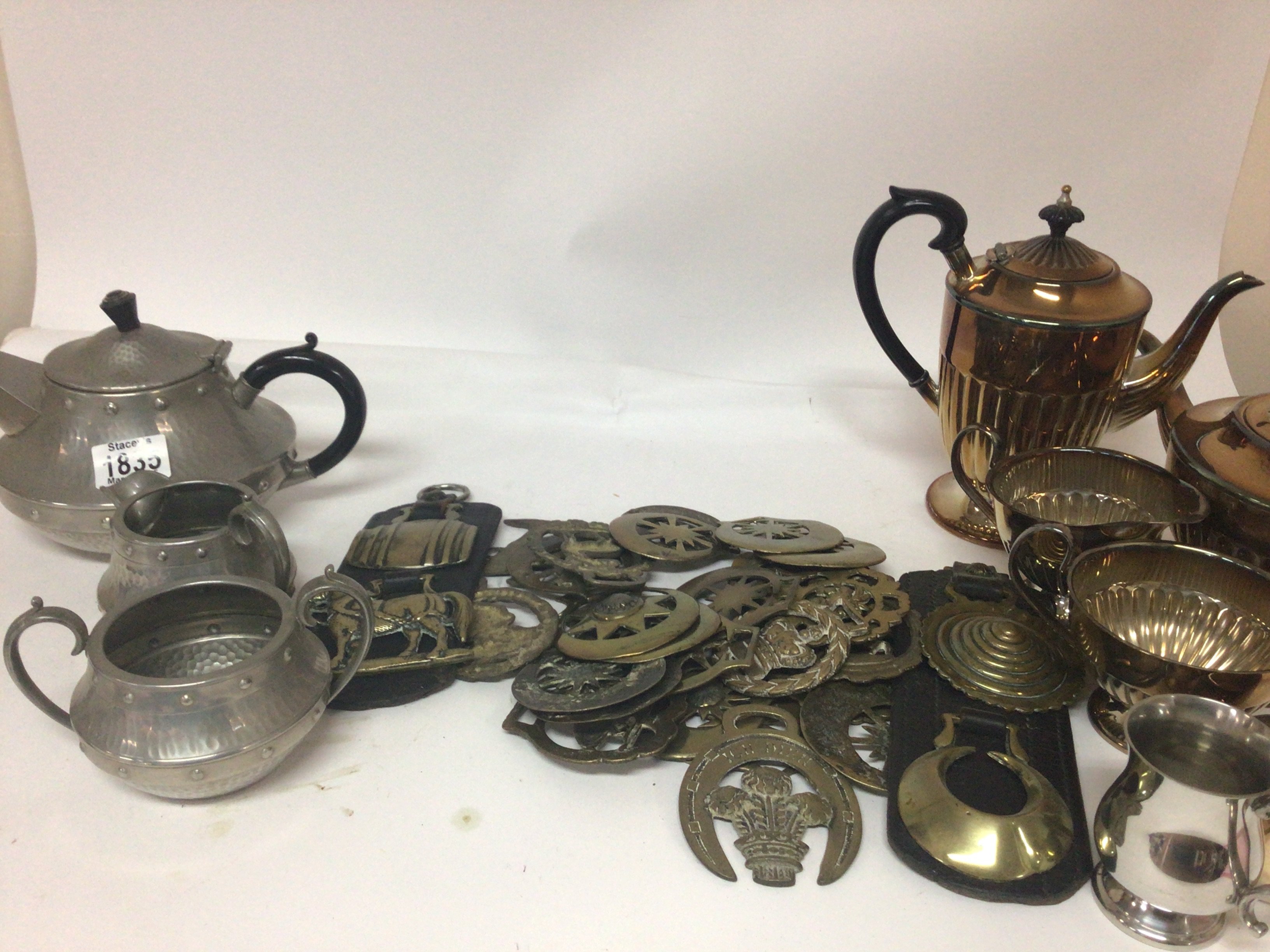 A collection of horse brasses including original 19th and 20 the century a pewter Arts and Crafts tea set a silver plated tea set and other oddments.