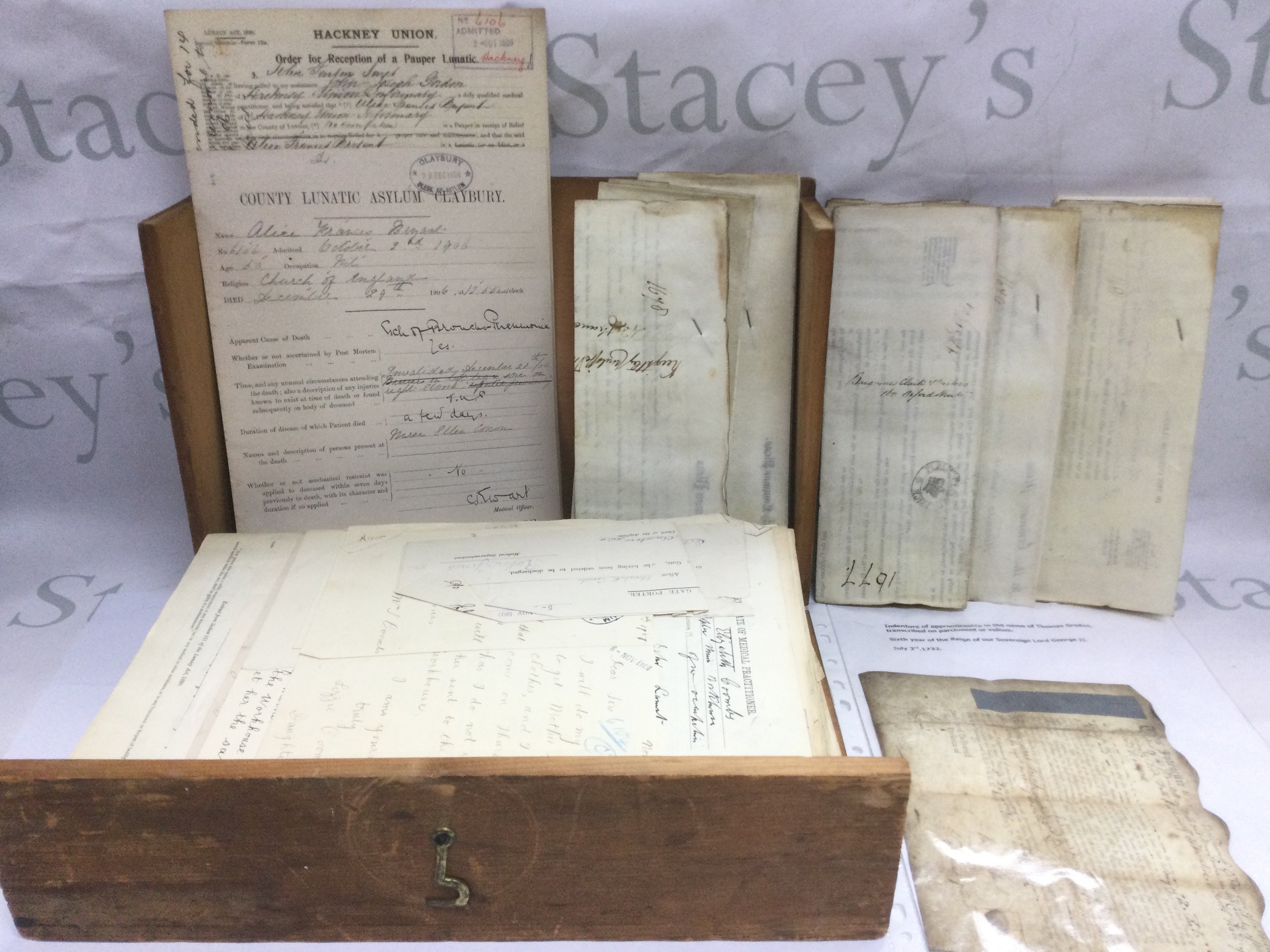 A box containing interesting antique documents including a 1732 indenture and other documents including Hackney Union County Lunatic Asylum, Claybury documentation.