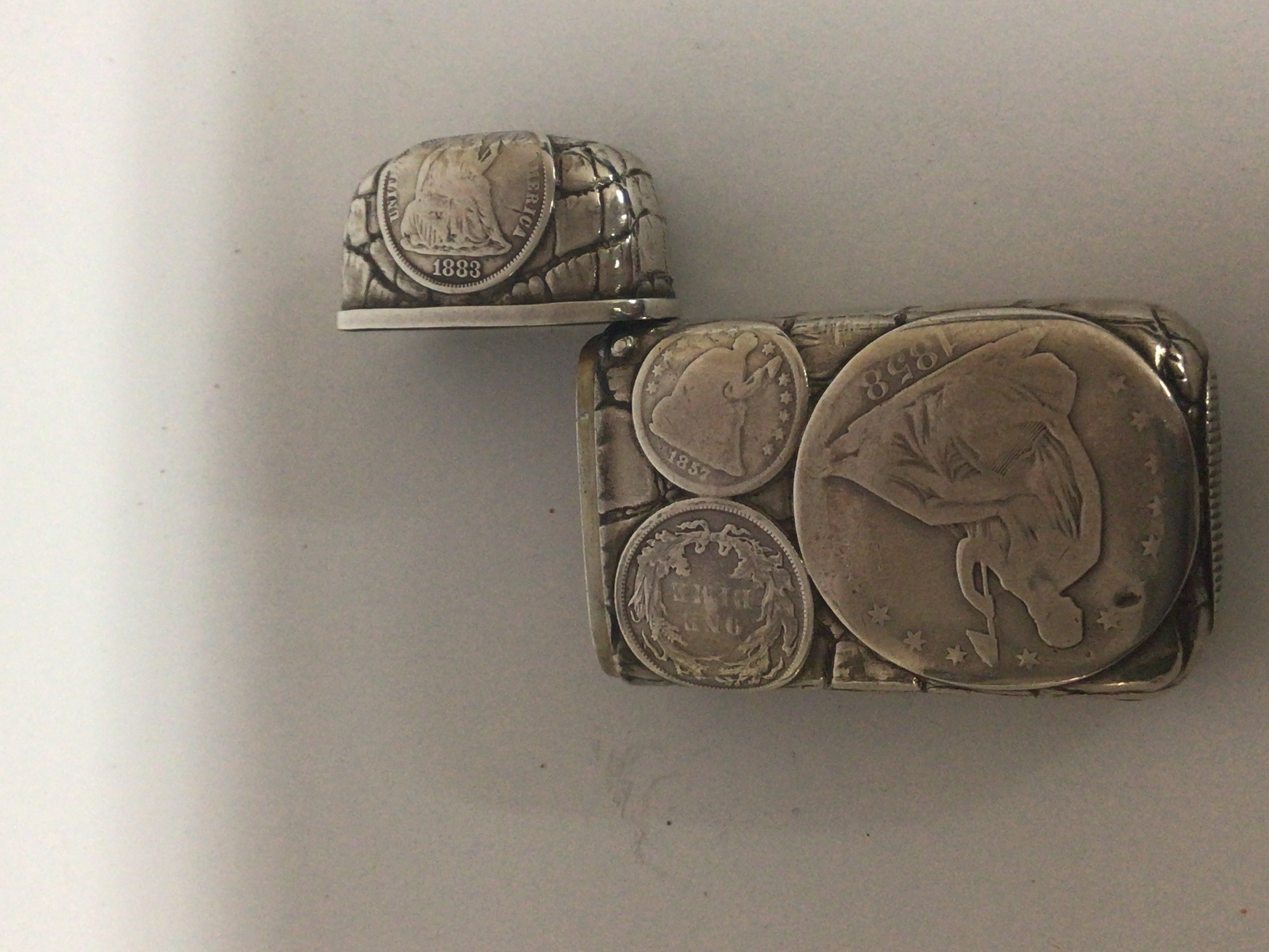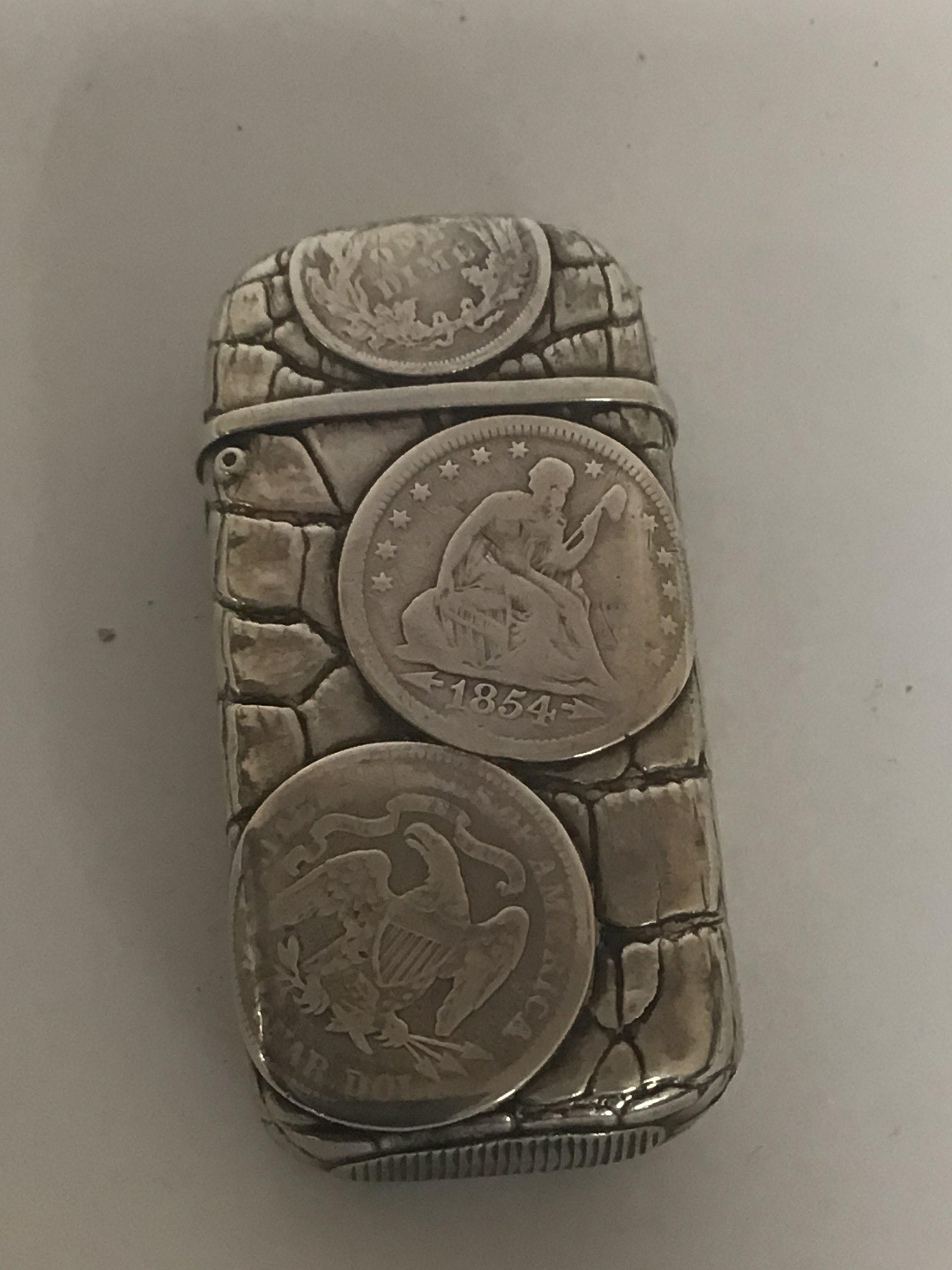 An interesting unique silver white metal vesta cases and made with American 19th century coinage 1854 1858