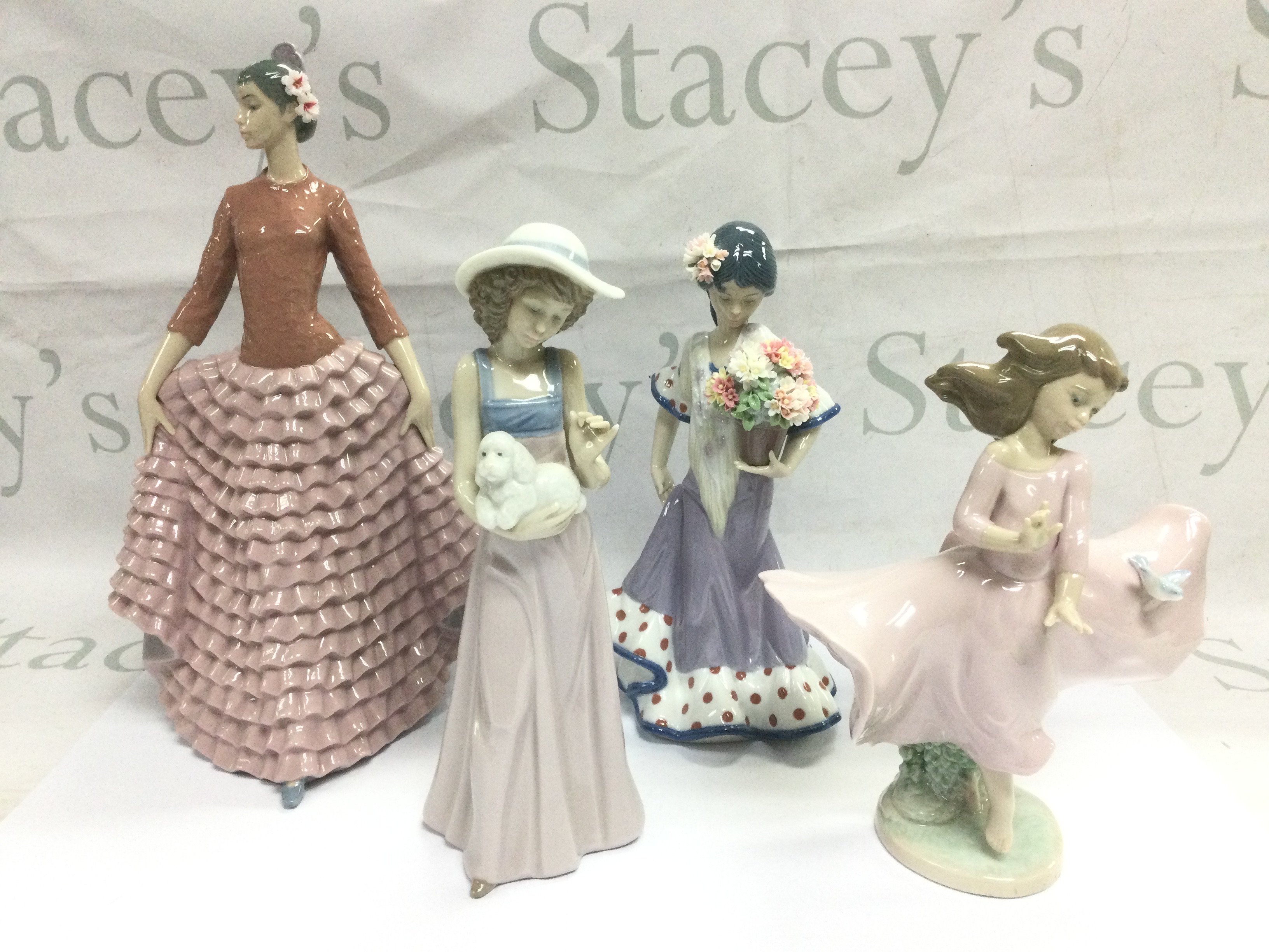 Three Lladro figures and a Nao example including a boxed Flor Maria example. Shipping category D.