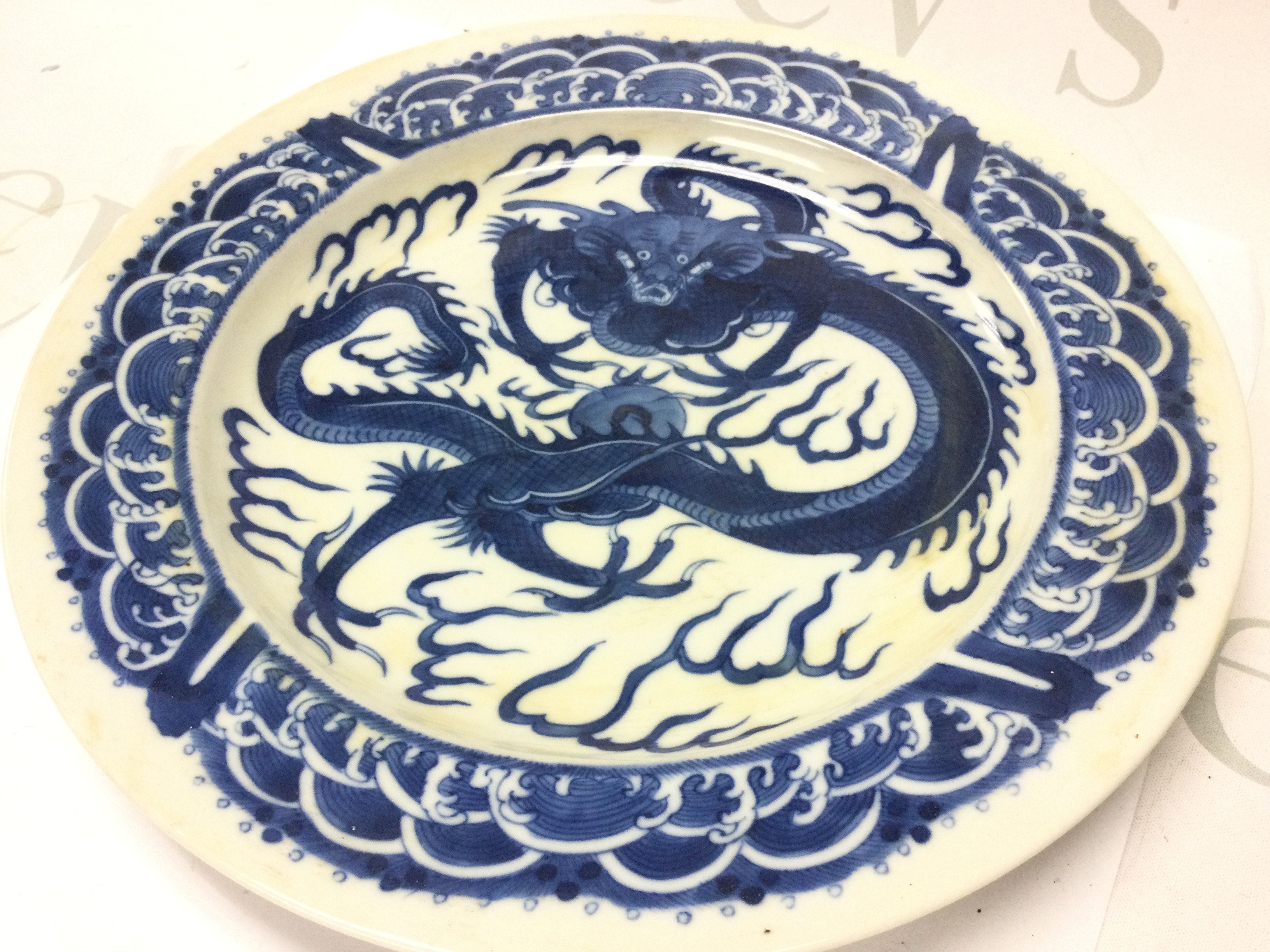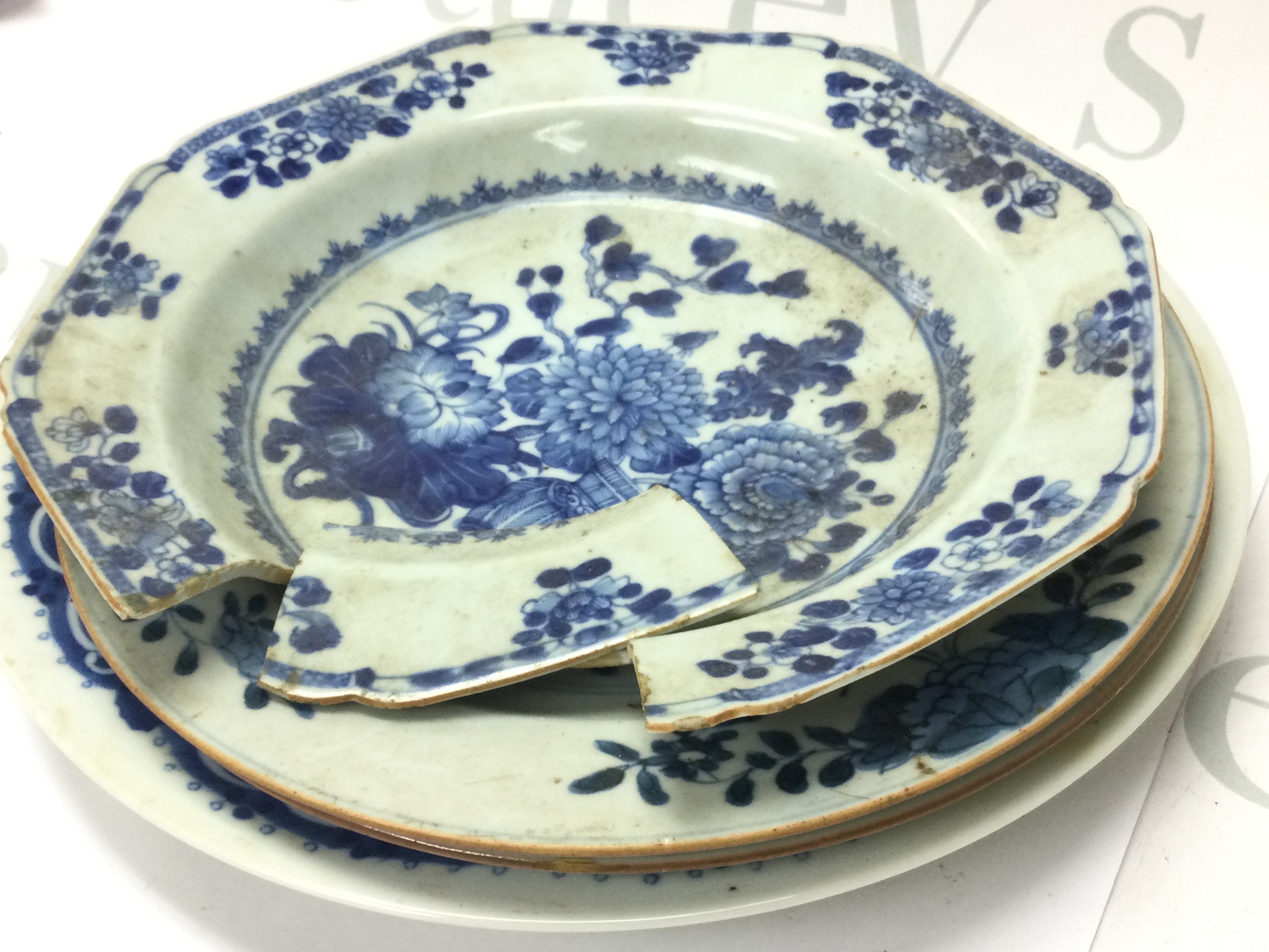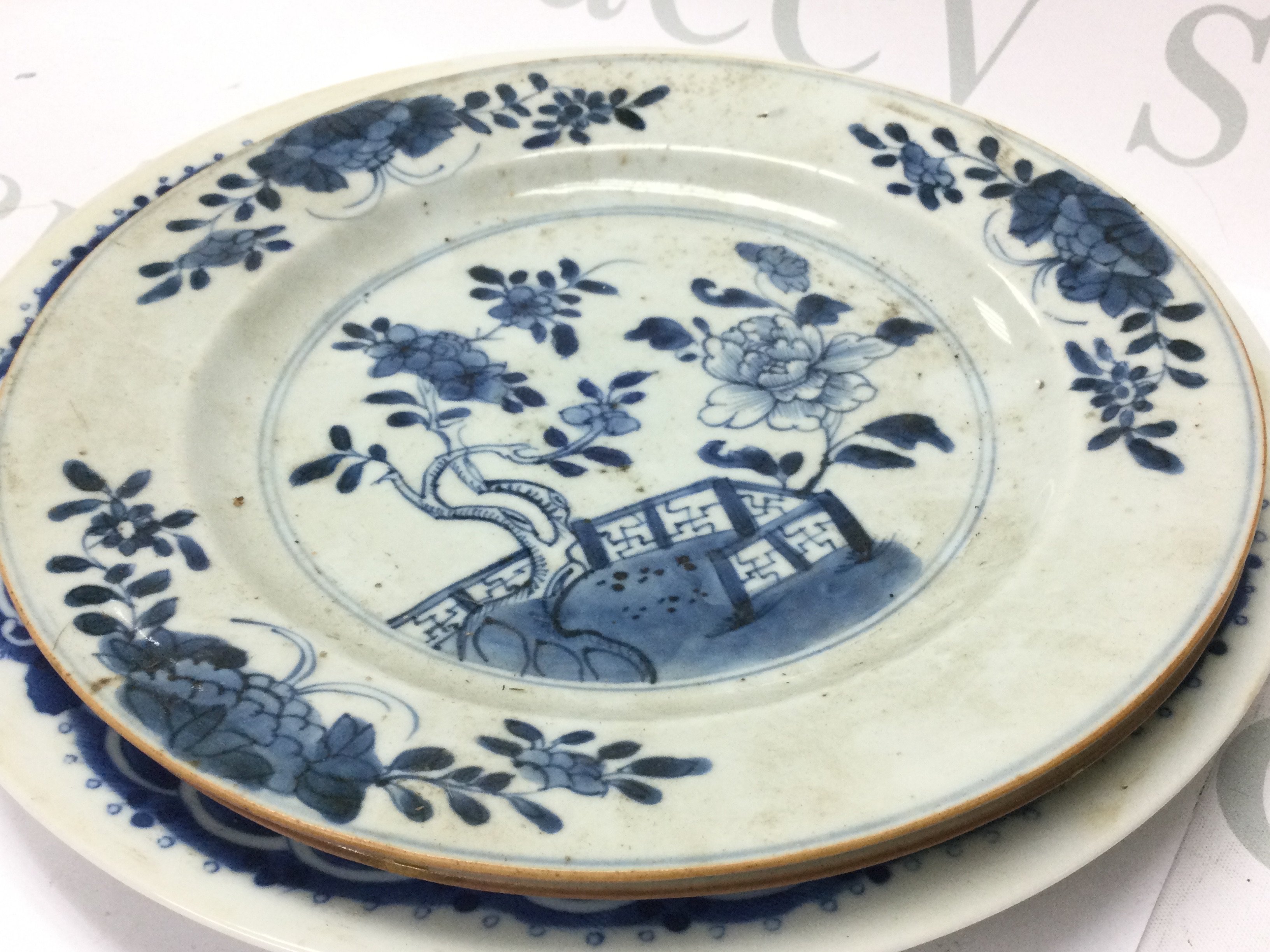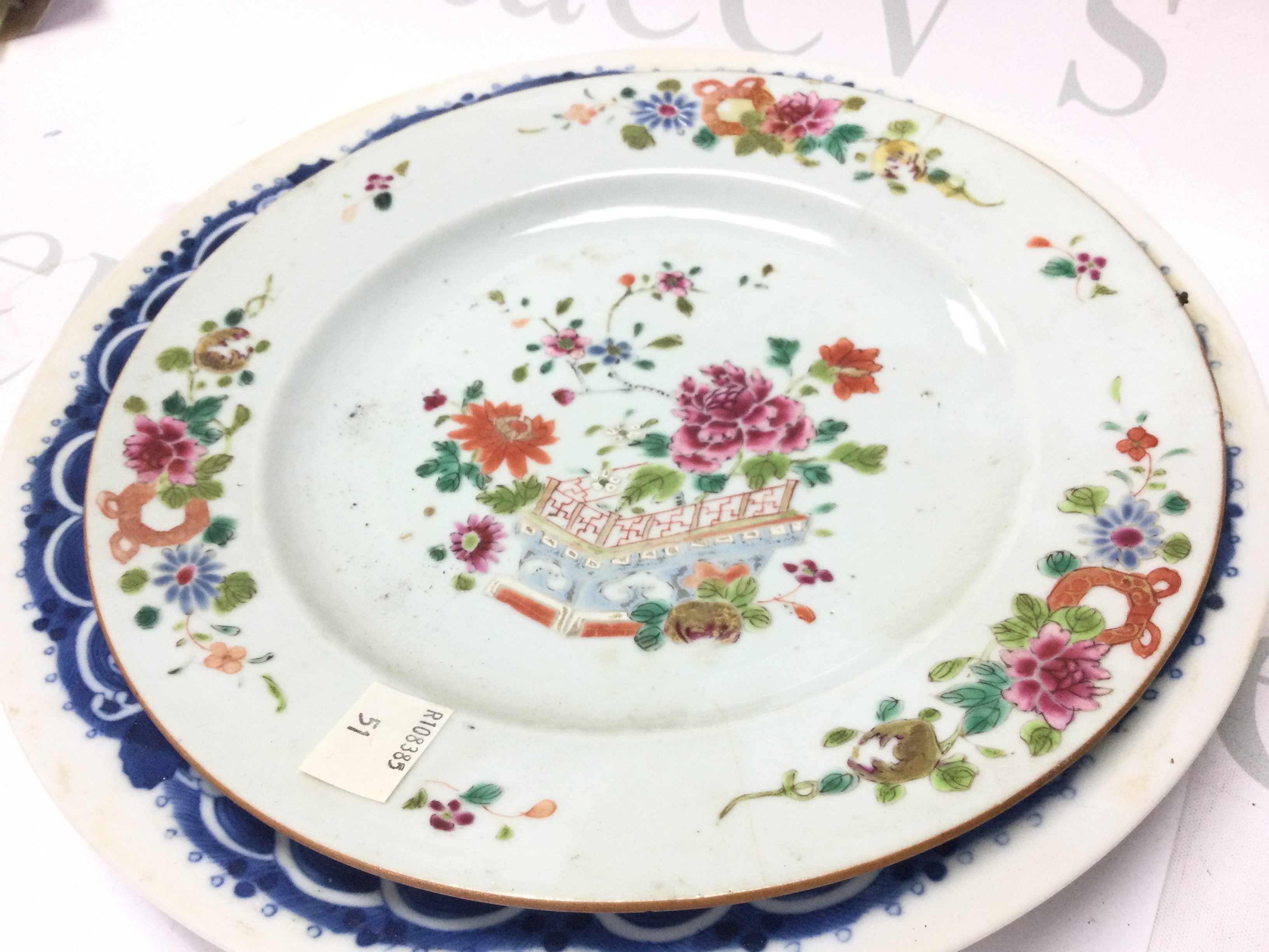 Chinese blue and white plates and a Famille rose plate, this lot cannot be posted