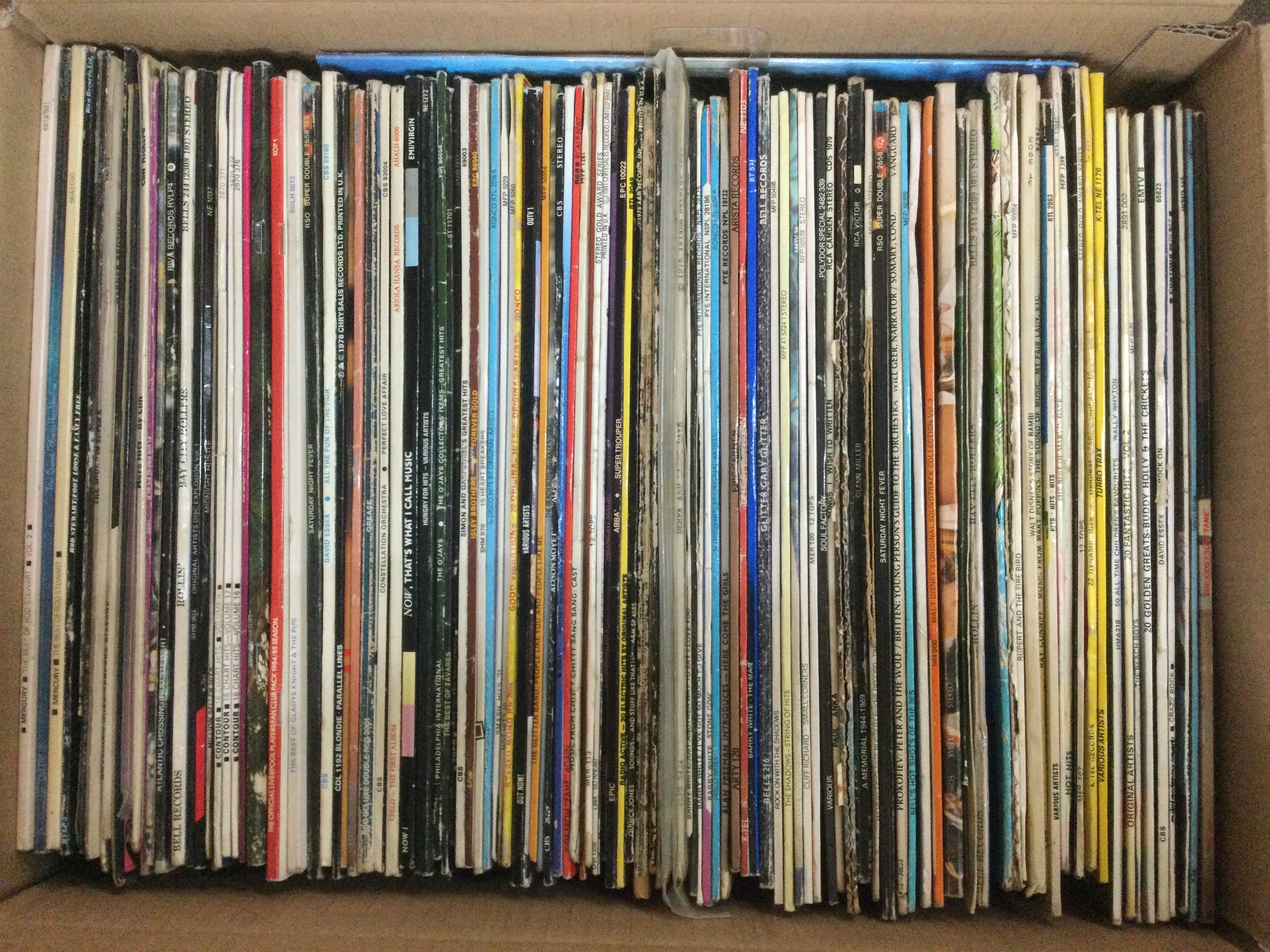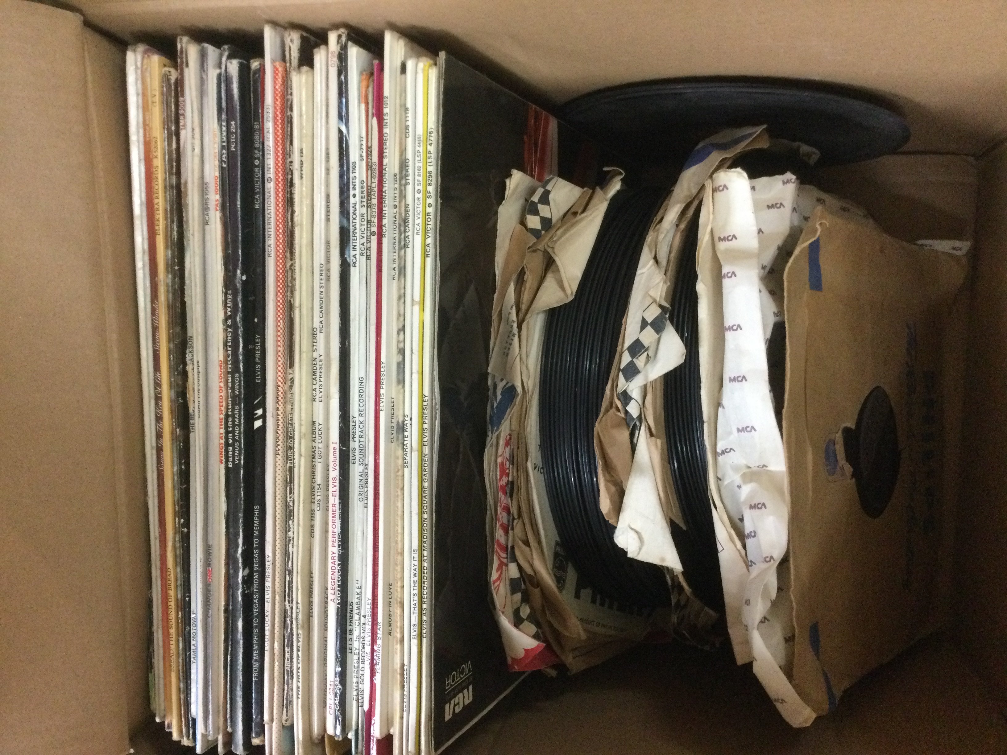 Two boxes of LPs and 78s by various artists including David Bowie, Elvis Presley, Wings and others.