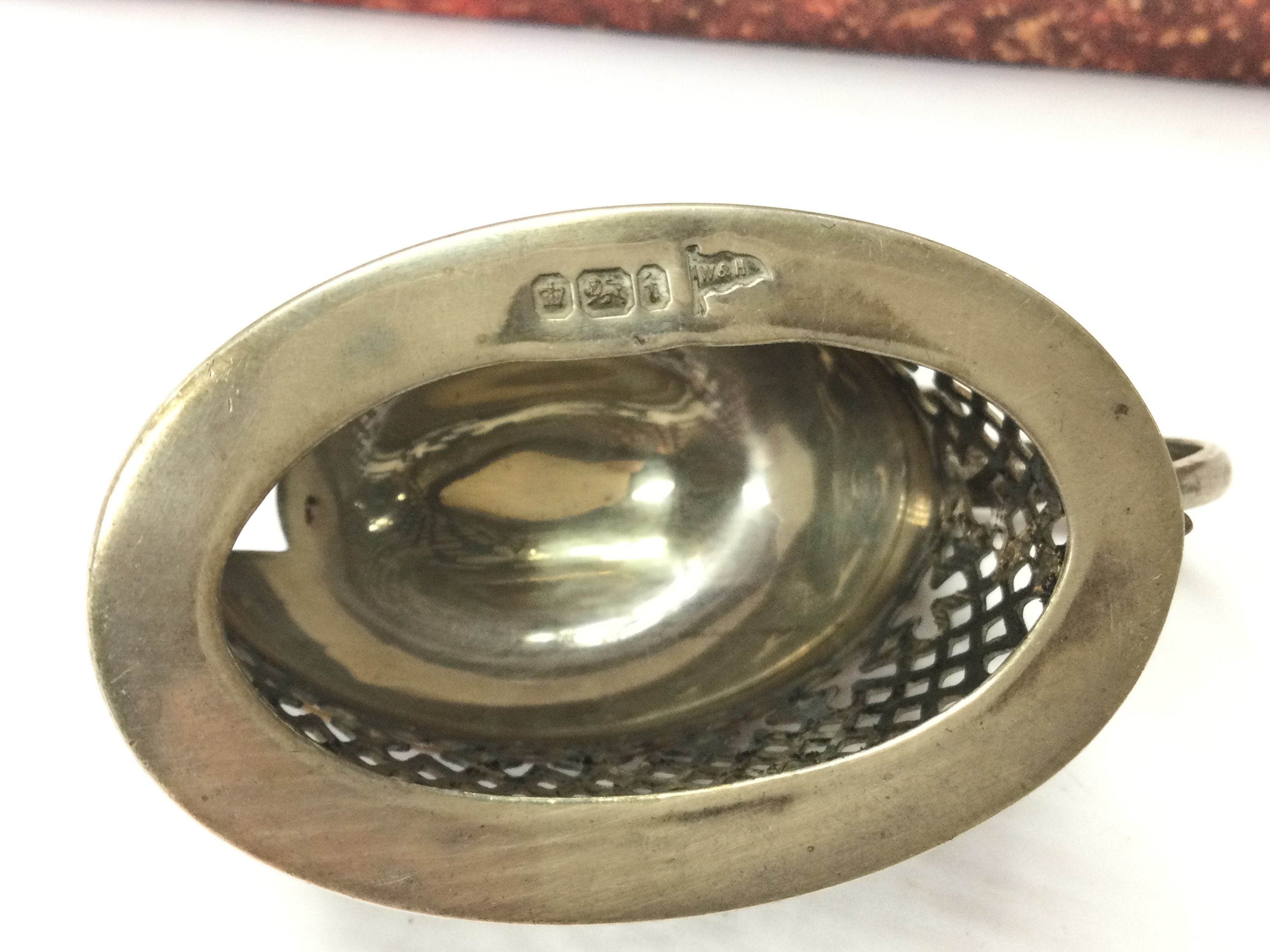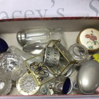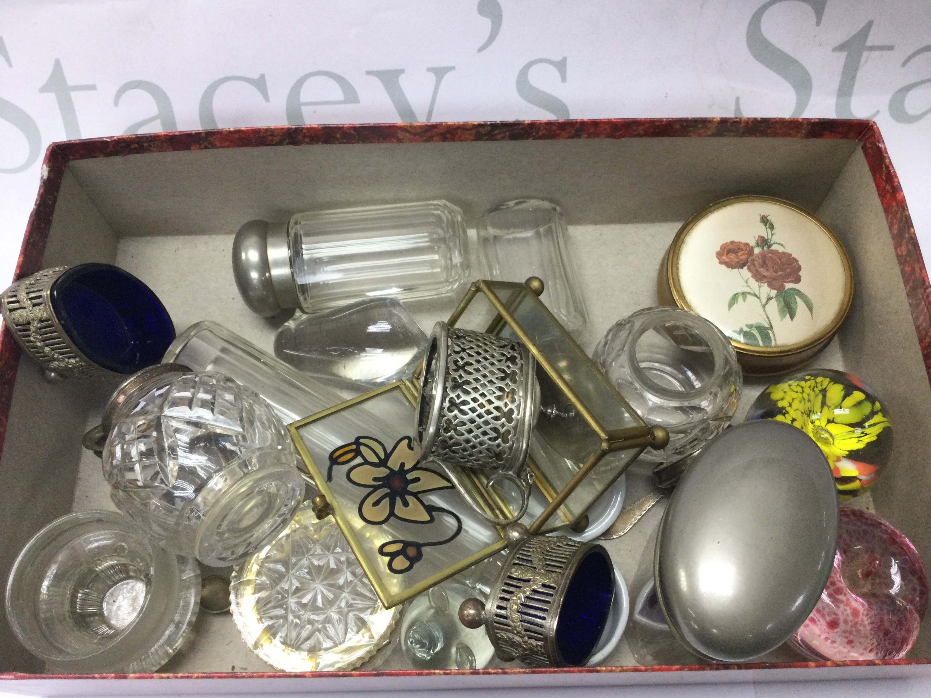 A box containing a glass condiments set, including a silver hallmarked piece and other oddments
