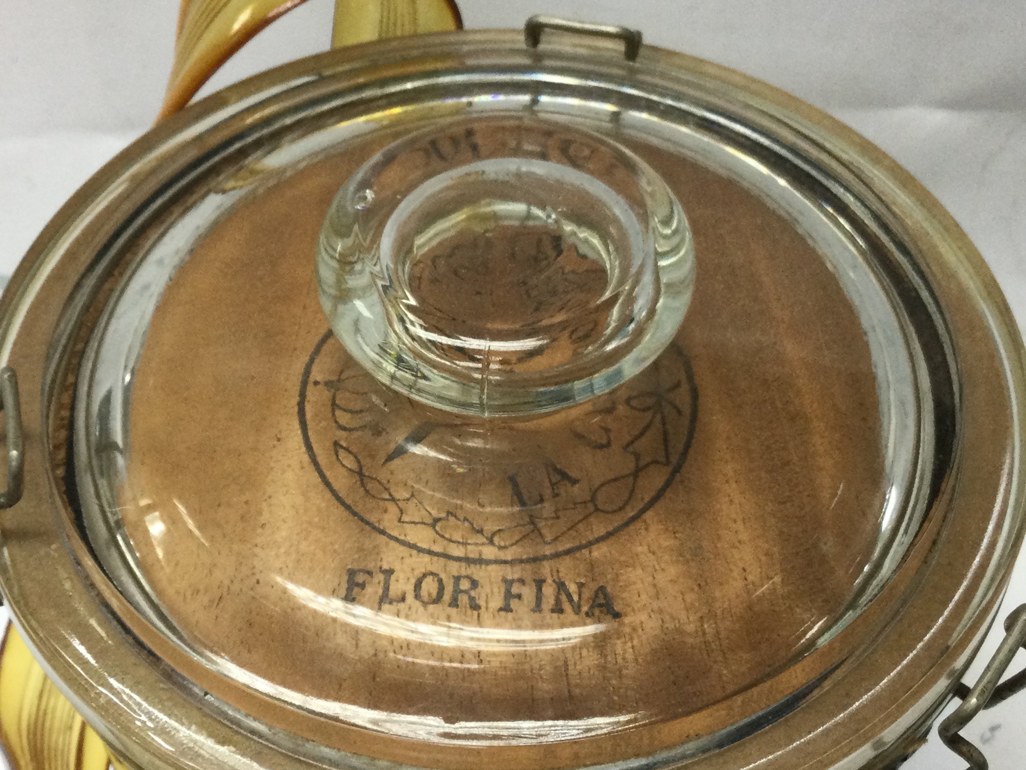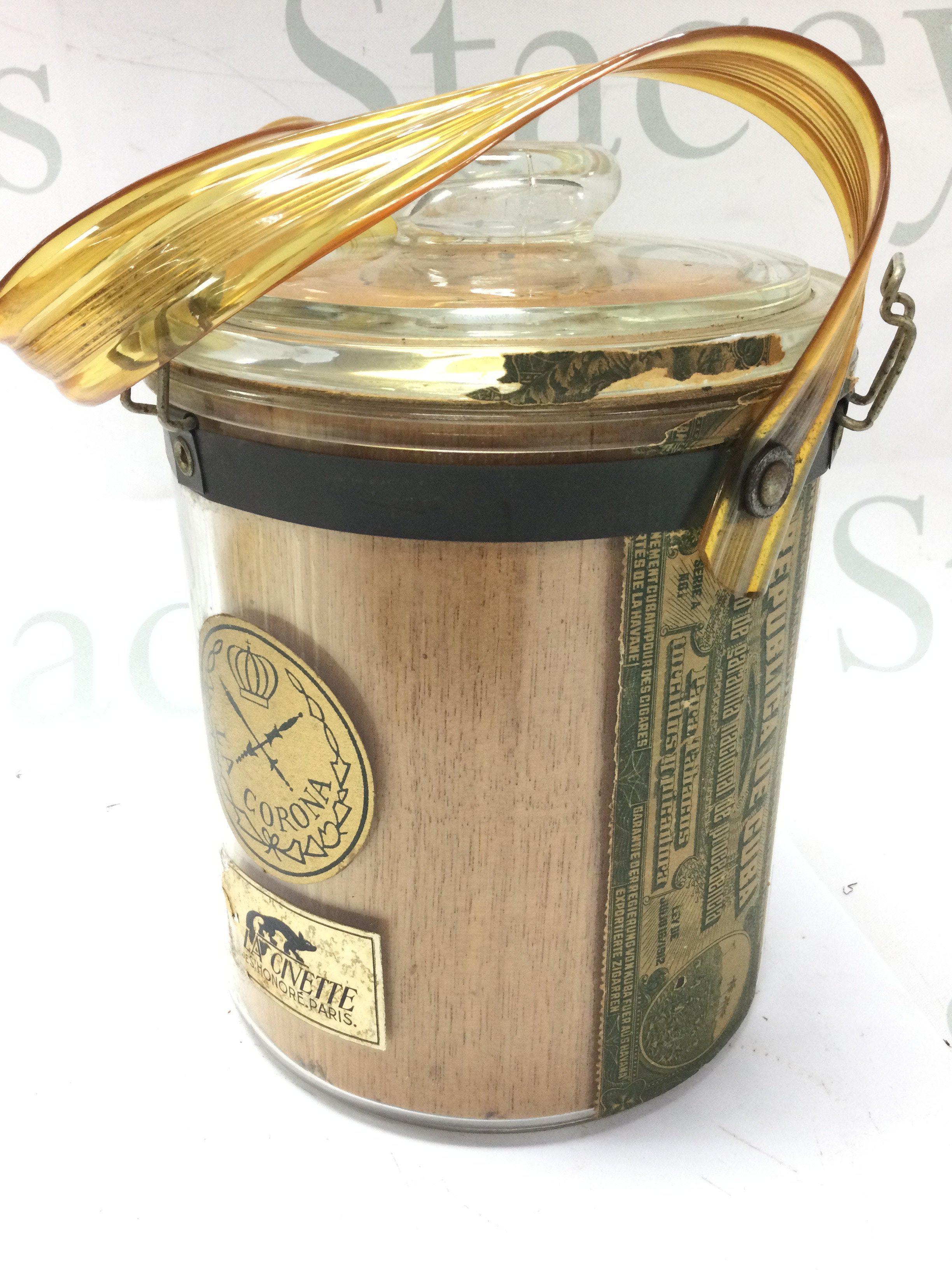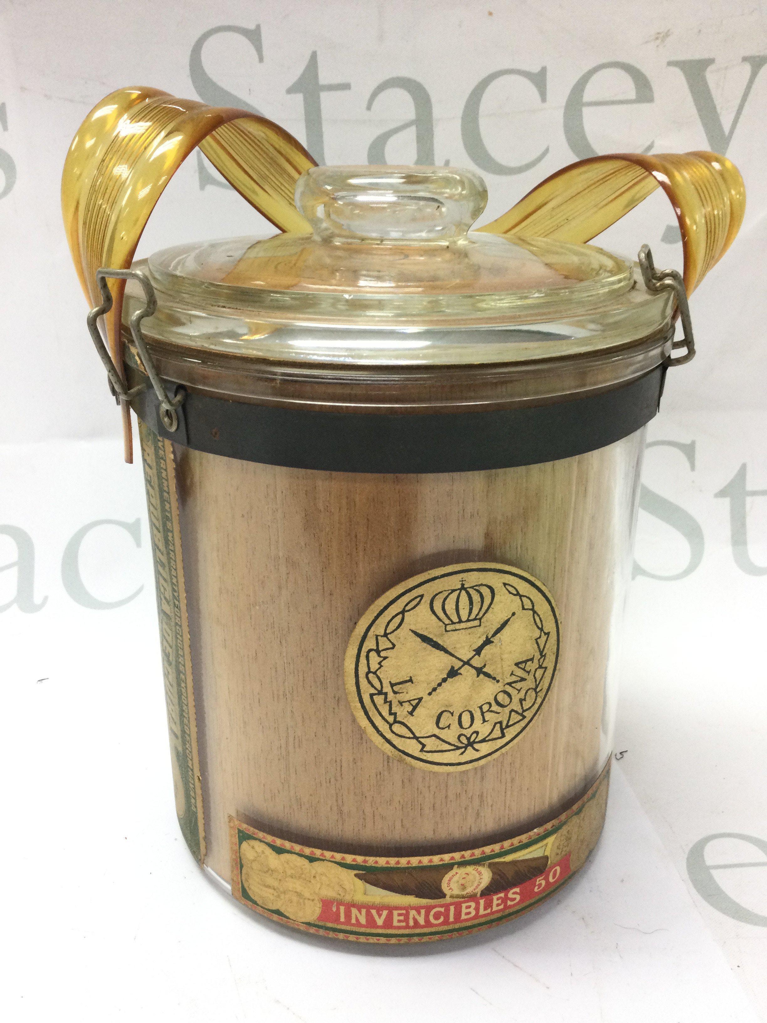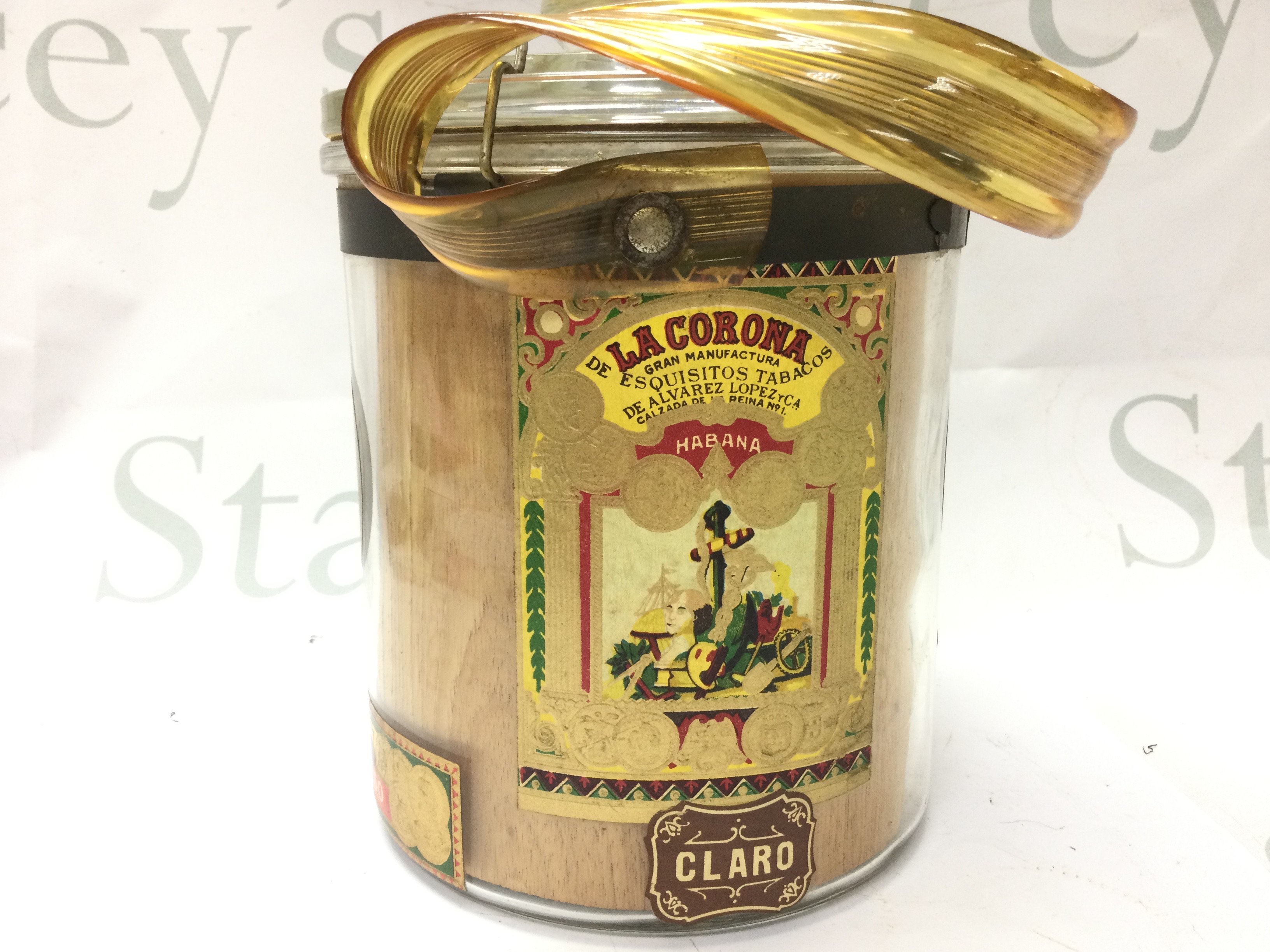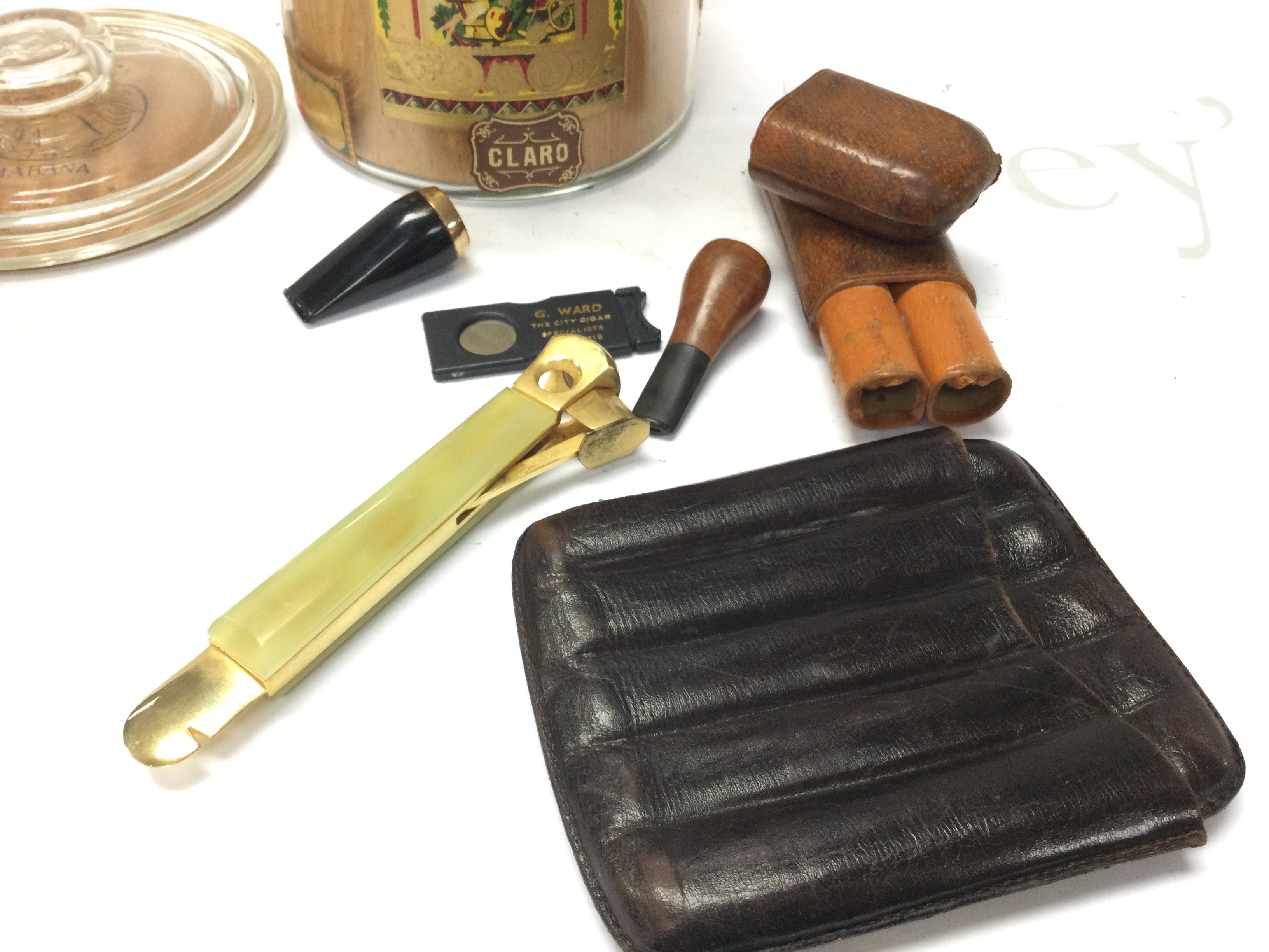 A Vintage La Corona glass cigar jar humidifier with various tools including two leather cigar cases, cutter, mouth pieces etc . This lot cannot be posted
