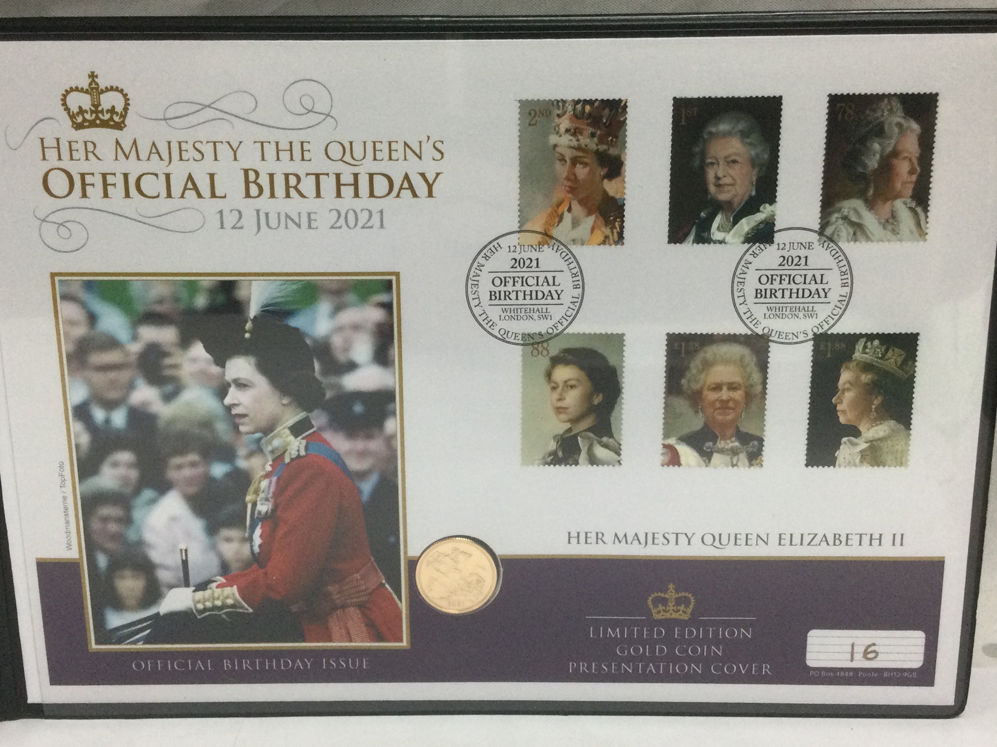 A 2021 limited edition gold coin presentation cover commemorating the birthday of Queen Elizabeth II. Shipping category A.
