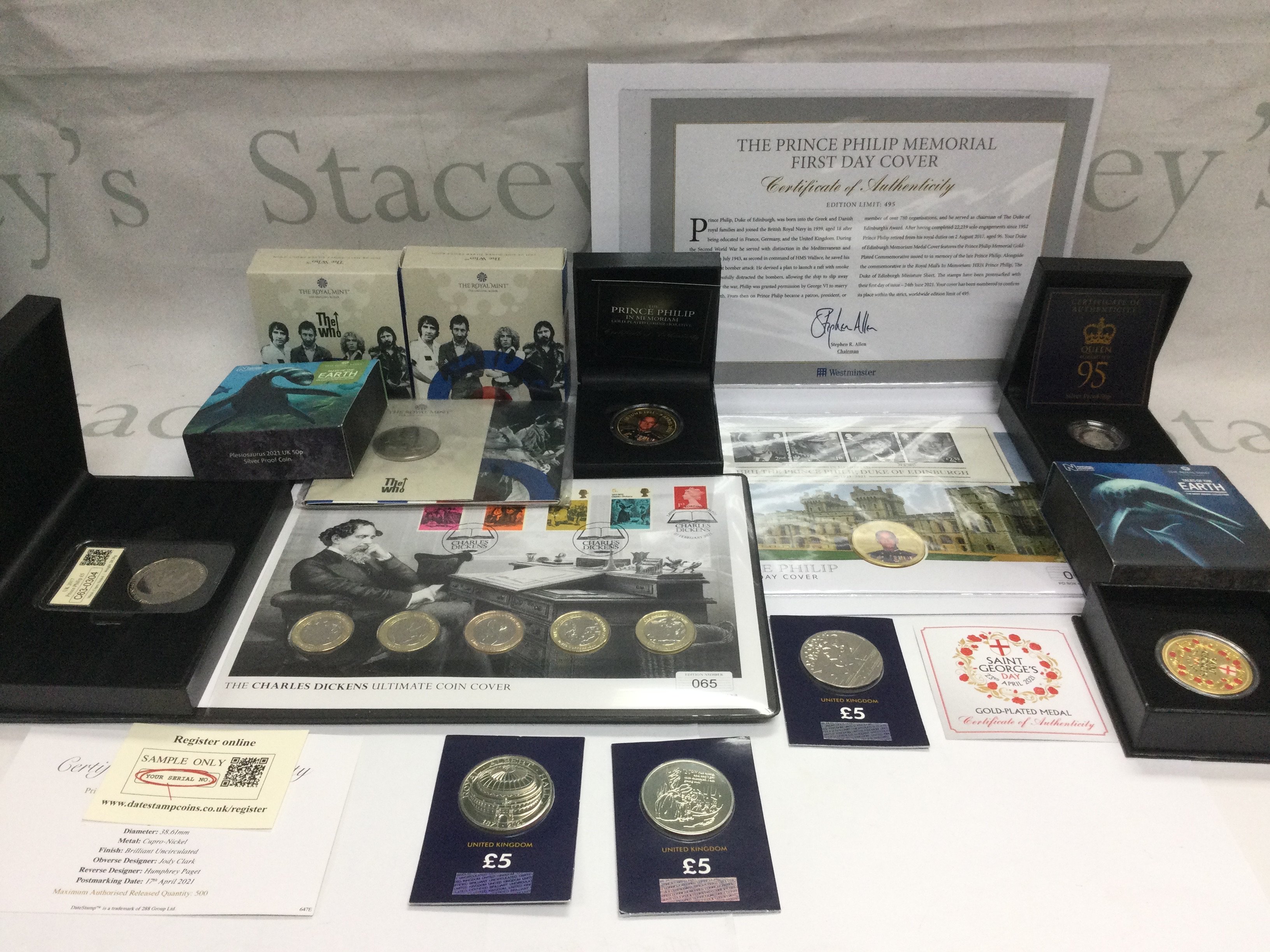 A collection of proof coins including a Prince Philip £5 coin, a limited edition Charles Dickens coin cover and others. Shipping category B.