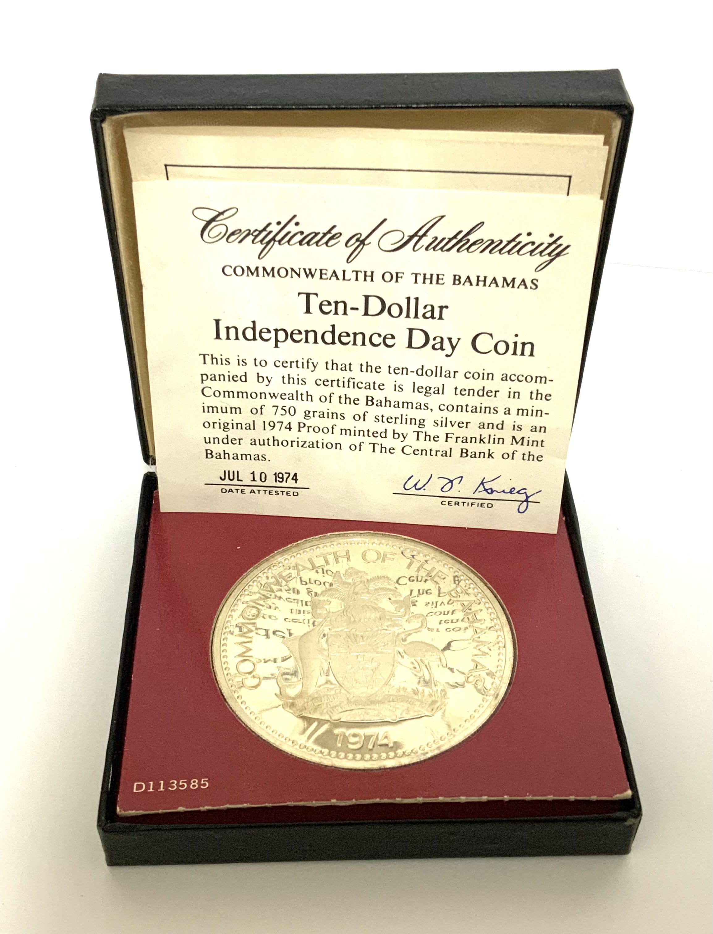 A 1974 Ten Dollar Independence Day coin, Commonwealth of Bahamas. (A)