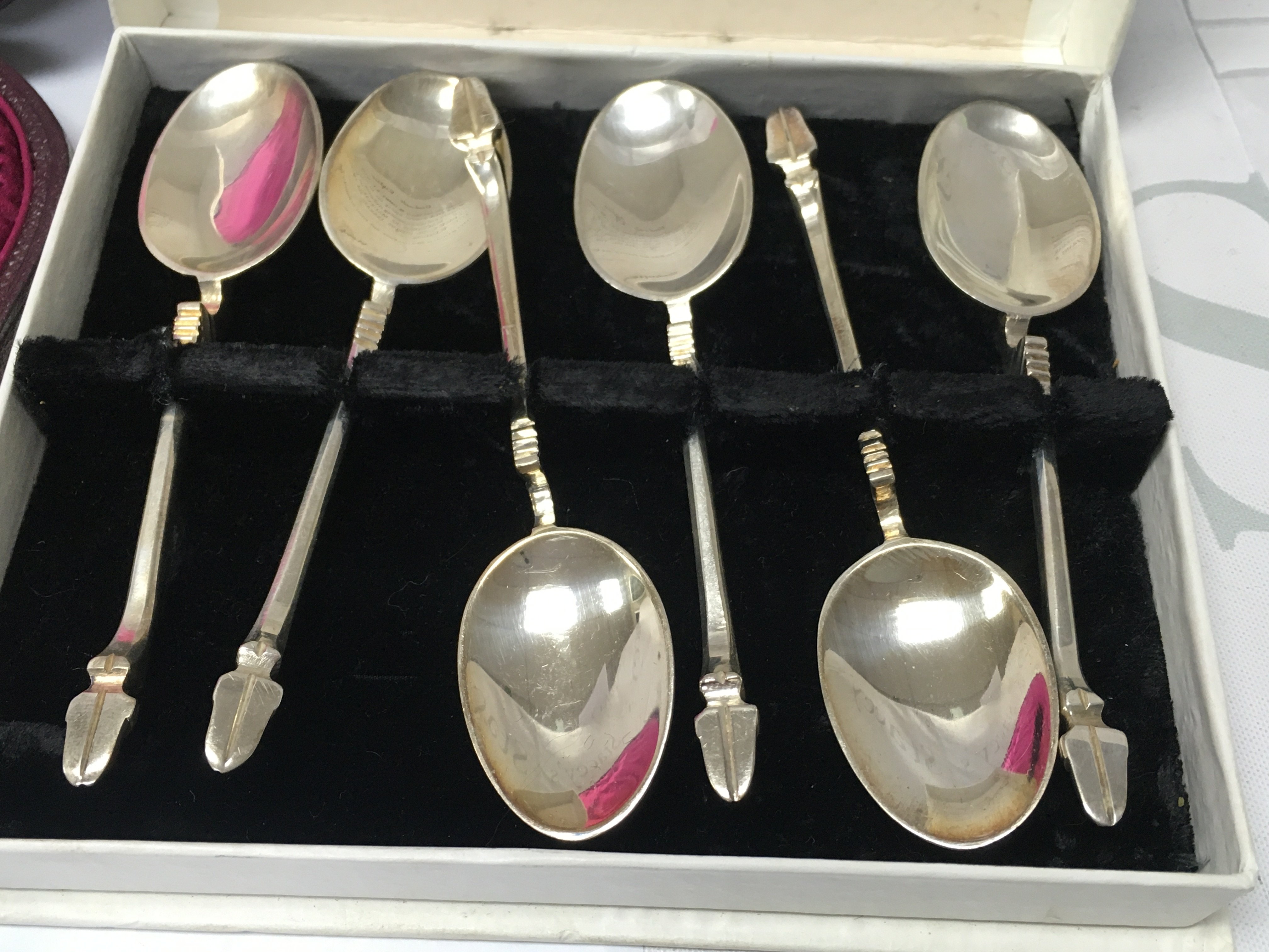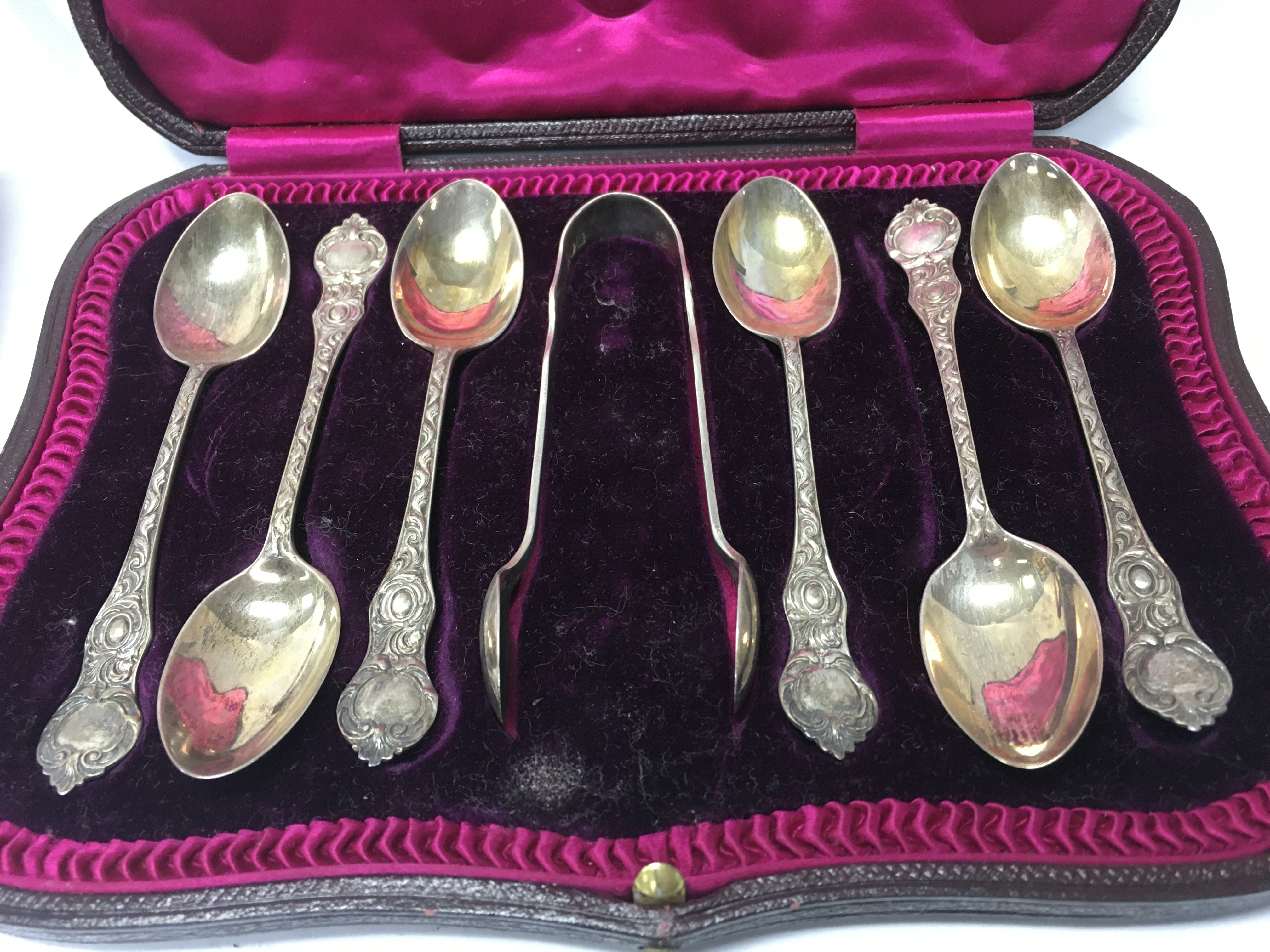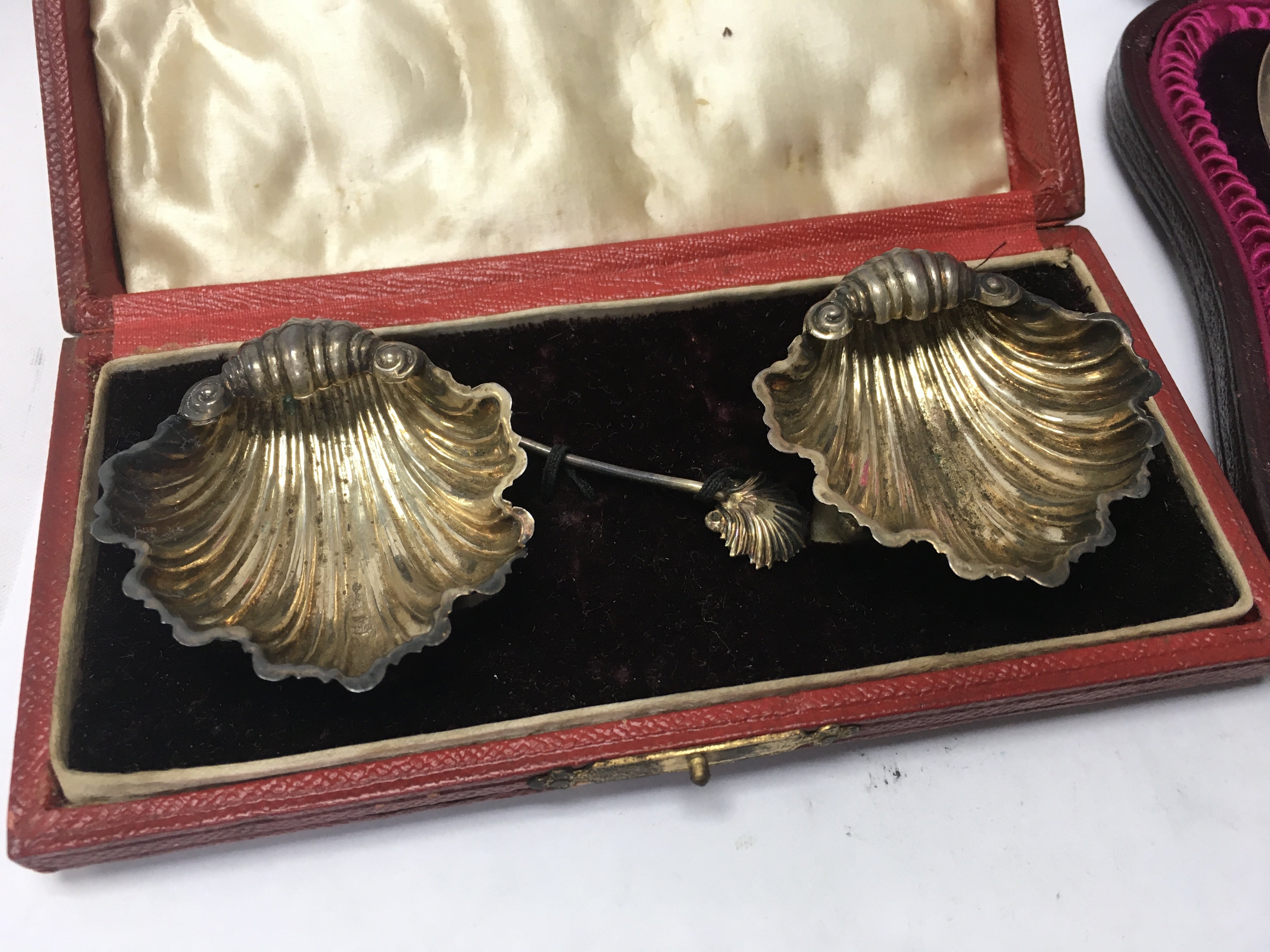 A cased set of six silver spoons and tongs together with cased shell salts and six plated spoons.