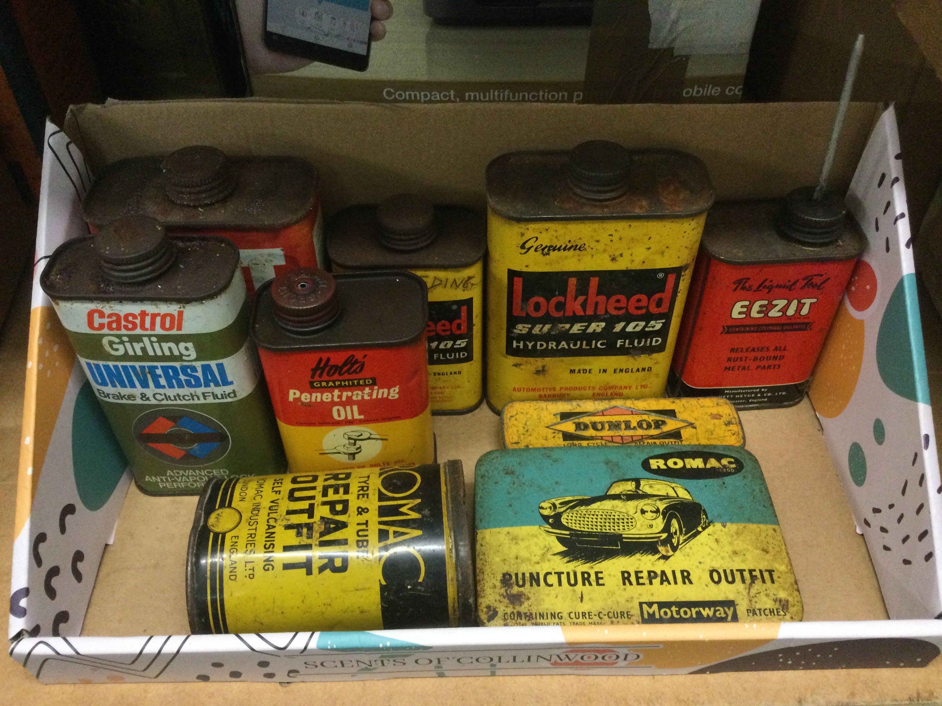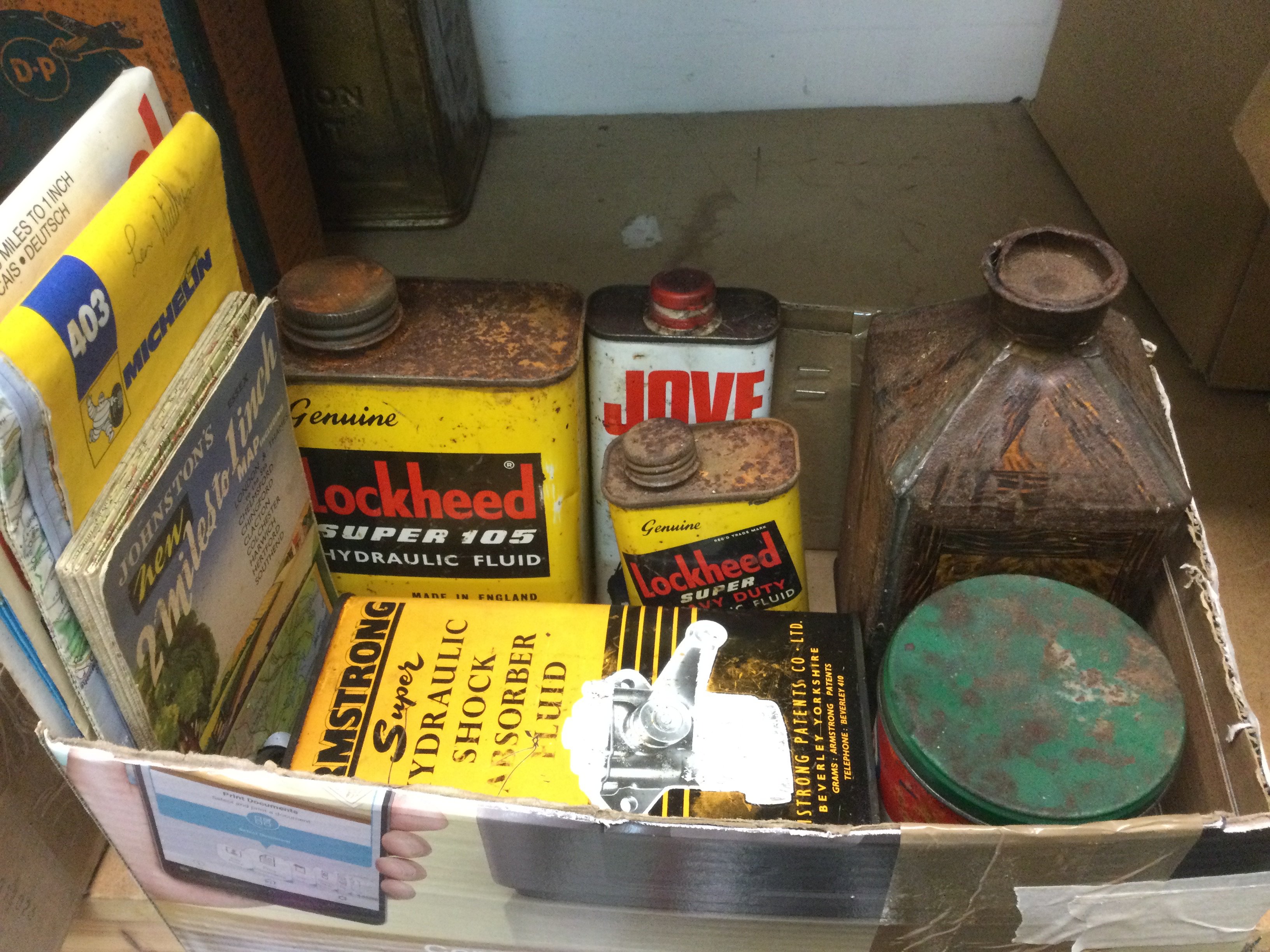 Two boxes of vintage motoring related tins and three road maps (2). Shipping category D.